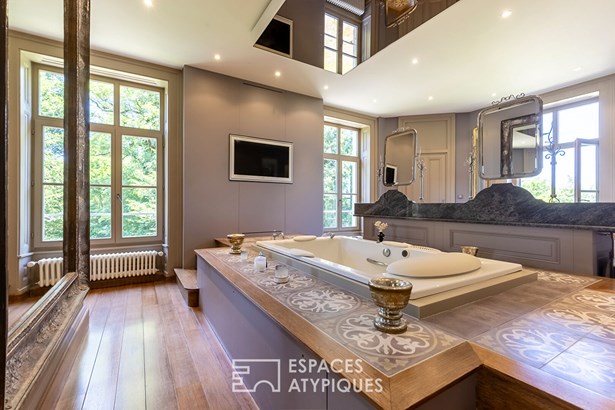 On the 1st floor, a parental space includes a splendid bedroom, a living room, a bathroom and a dressing room. A second bedroom with its bathroom is housed there.