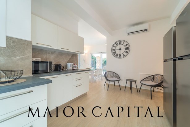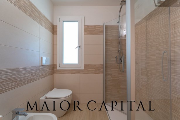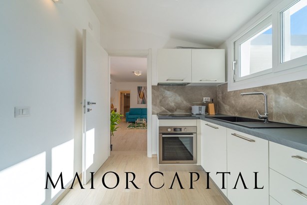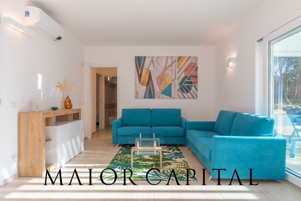 Inside, the rooms stand out for their brightness and harmony. The spacious and welcoming living room, enhanced by elegant finishes and colour details, creates a warm and relaxing atmosphere. The modern kitchen, linear and functional, opens onto the dining area, made even more suggestive by the large panoramic windows that favour continuity between inside and outside.