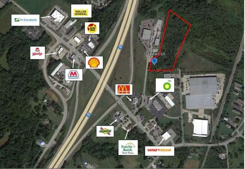 6.19 Acres +/- Highway Comm lot! Super convenient location just off I-75 on Spears Ln. - adjacent to a high-volume auto dealership, near McDonalds, BP Station & Mexican Restaurant. Convenient to Cincinnati, Lexington & Louisville via Interstate 75/71 & just 25 miles South of CVG Int'l Airport. All utilities at site. Gently rolling topography. Permitted uses include auto & motorcycle sales, hotels, drive-in dining, retail center, storage units, medical office & sports facility.