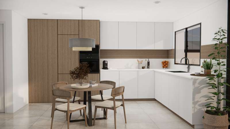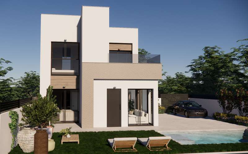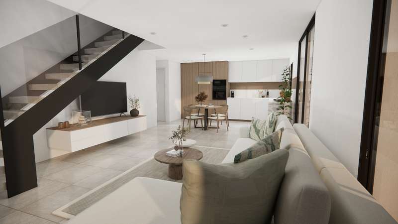 These two-storey villas offer three spacious bedrooms with fitted wardrobes, two bathrooms, and an open-plan living and dining area connected to a fully equipped modern kitchen. The ground floor opens onto a private garden with a swimming pool and on-plot parking with a motorized gate. Meanwhile, the first floor features a terrace, with the option to add a rooftop solarium for panoramic views.