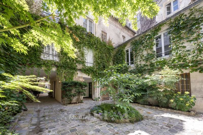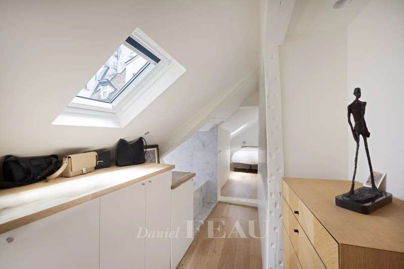 Saint-Sulpice – Bonaparte neighbourhood. This bright dual-aspect apartment is on the courtyard-level of a fine period co-ownership. Split-level, it includes a living/reception room and an open-plan kitchen, with a bedroom and a bathroom upstairs. Ample fitted storage space. Period features include exposed stone and beams.