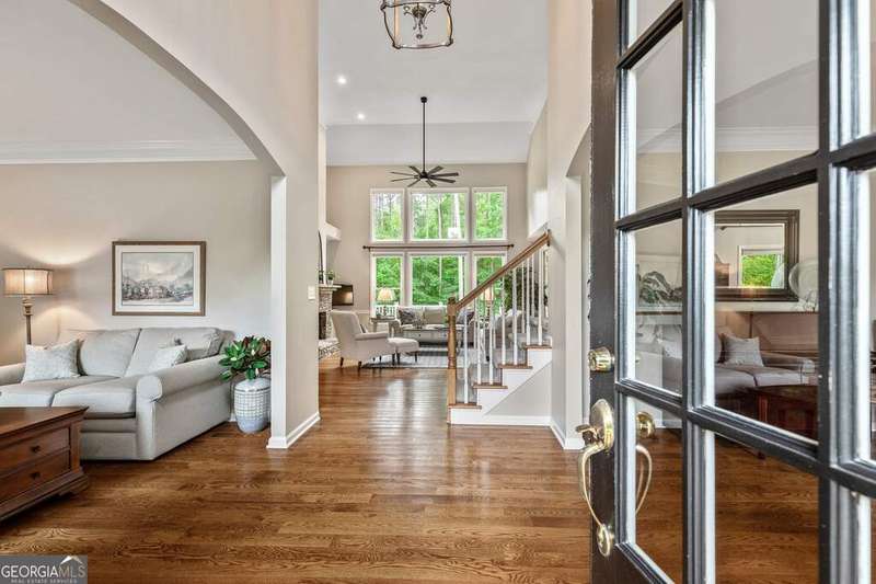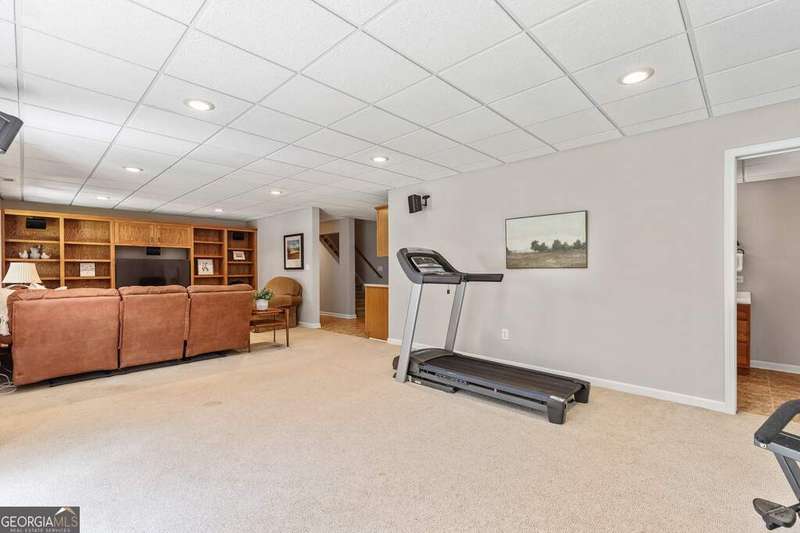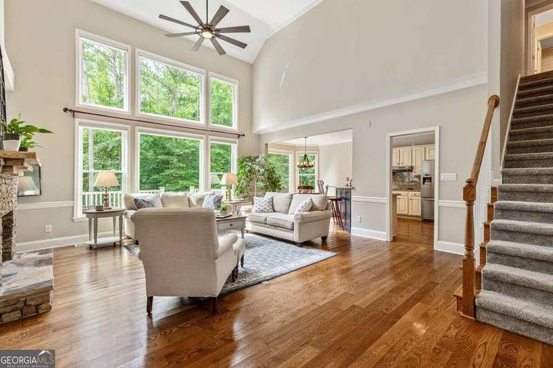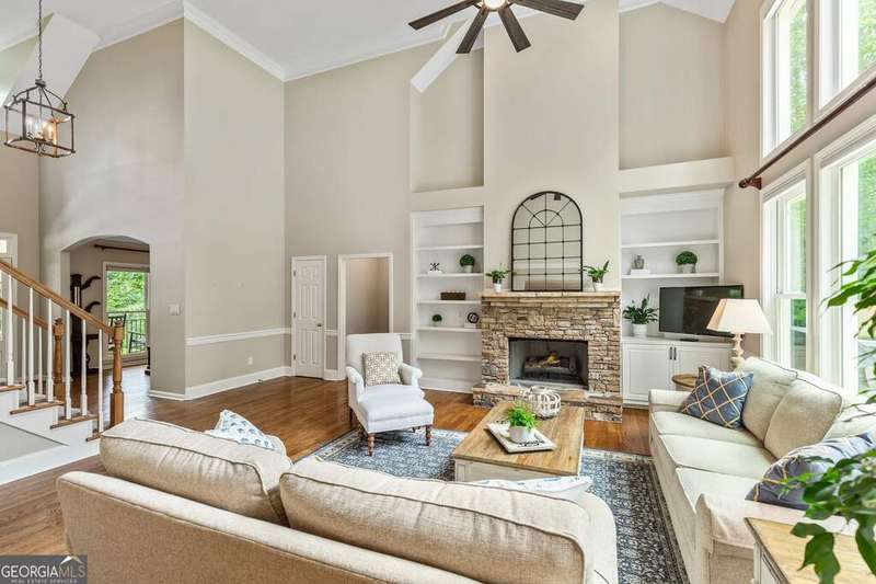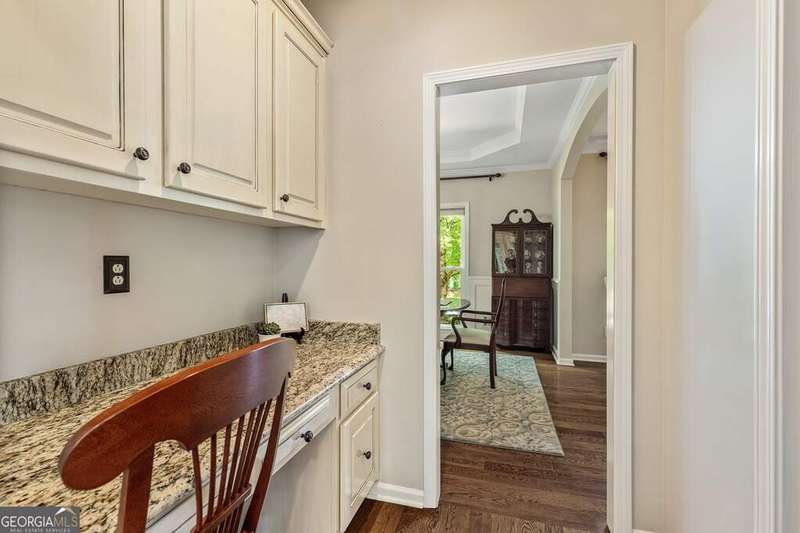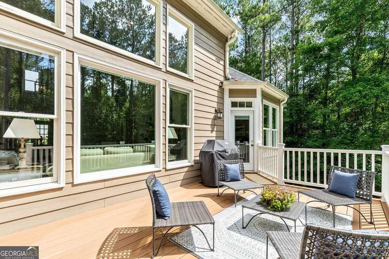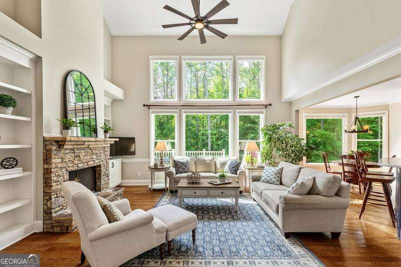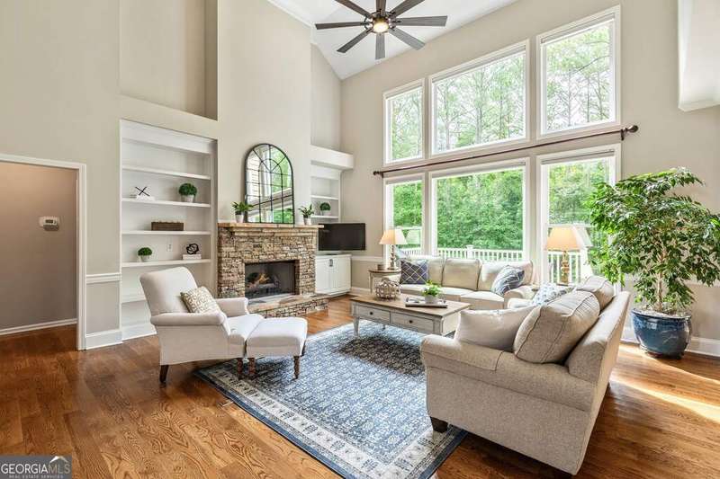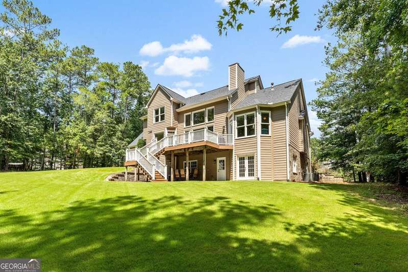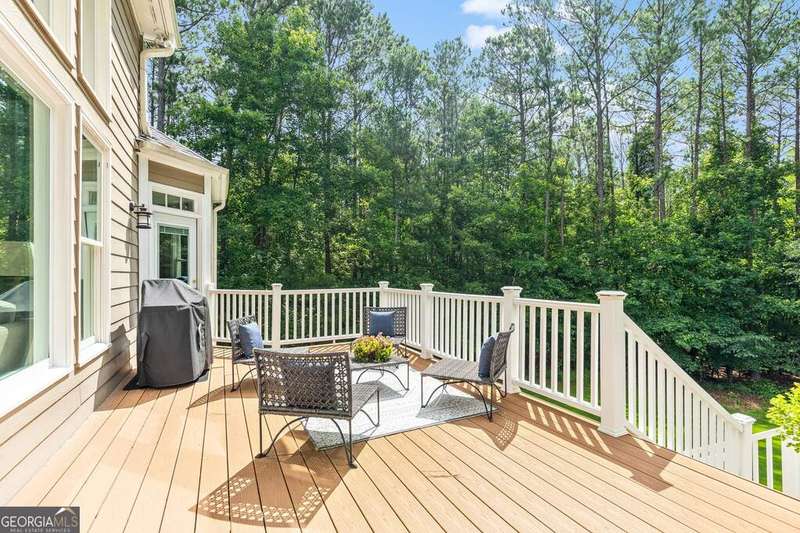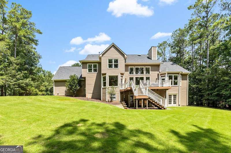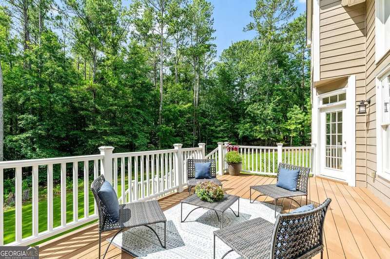 This beautifully maintained, one-owner home is located in the desirable Woodcreek subdivision, known for its resort-style amenities and its location within the highly acclaimed Starr's Mill school district. This home is beautifully finished with cement fiber siding and stone accents, offering elevated curb appeal. Perched gracefully on a gentle rolling hill, it welcomes you with a charming covered front porch - perfect for rocking chairs and morning coffee. As you enter through the front door, you are greeted by a grand two-story foyer flanked by two versatile spaces that could be used as a formal living room, den, library, music room, or home office. To the far right, you will find a formal dining room ideal for hosting guests. The heart of the home is the dramatic two-story great room featuring a cozy fireplace with custom built-in bookshelves on either side. Large windows fill the space with natural light and offer peaceful views of the private, tree lined backyard. The open-concept kitchen flows seamlessly into the living area, creating a perfect layout for family living and entertaining. The kitchen boasts granite countertops, stainless steel appliances, and a spacious walk-in pantry with premium wood shelving. Just beyond the kitchen is a well-maintained back deck constructed of Trex composite decking, which offers long-term durability and a splinter-free surface-ideal for relaxing outdoors or enjoying an evening meal surrounded by nature. The hardwood floors continue into the owner's suite on the main floor, where a private door opens to the deck for convenient outdoor access. The primary closets have been thoughtfully customized with premium built-ins, and the beautifully updated en-suite bathroom includes heated tile floors, double vanities, a soaking tub, a glass-enclosed shower, and a private water closet. This luxurious, spa-like space was designed with both comfort and style in mind. Upstairs, you will find three additional bedrooms, a dedicated office, and 2 full baths. From the hallway you have access to an updated full bathroom featuring double vanities and a private toilet and shower area. This bathroom also has access to one of the guest bedrooms. Additionally, one of the upstairs bedrooms features its own en-suite bathroom and is generously sized, easily functioning as a second primary suite or a comfortable guest retreat. The finished terrace-level basement adds even more functional living space. Full-sized windows along the back wall bring in natural light, making this level feel open and inviting. It includes a large entertainment area, a full bathroom with tile flooring, an extra room that could easily be used for a 5th bedroom, and a spacious flex room that is currently used as an office but could also serve as a home gym or media room. A kitchenette with a sink, microwave, cabinetry, and countertop offers the convenience of a wet bar-perfect for entertaining. There is also a semi-finished workshop area attached to an unfinished storage space. The Woodcreek subdivision offers a vibrant lifestyle with access to a swimming pool featuring a large water slide, a clubhouse, fitness center, playground, tennis courts, and basketball courts-making it one of the most coveted neighborhoods on the south side of Atlanta. This home also connects directly to Peachtree City's extensive golf cart path network, allowing for easy and fun access to parks, restaurants, retail and top-rated schools - without ever needing a car. From the location and layout to the updates and finishes, 510 Stonehaven Dr offers a rare opportunity to own a truly special property in Woodcreek.