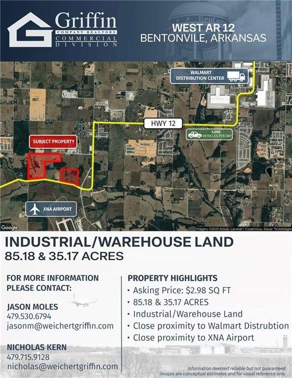 Land is located just north of Northwest Arkansas National Airport with Arkansas HWY 12 frontage in one of the fastest growing secondary markets in the country, making it ideal for an industrial-warehouse and distribution hub. Located only minutes southwest of Walmart distribution facilities and the city of Bentonville. Please see attached documents.