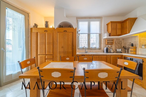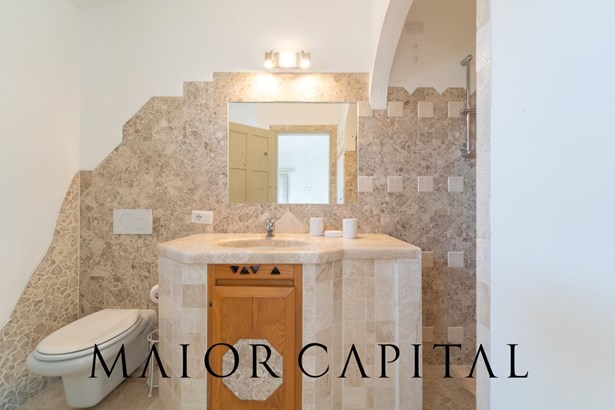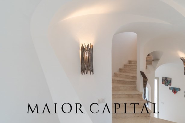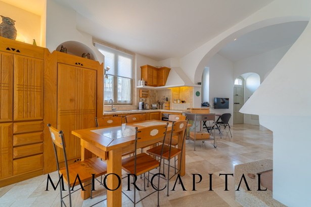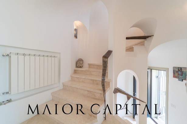 On the ground floor, the entrance opens onto a bright and architecturally rich living room that creates a refined play of sinuosity and light. The stone and wrought iron elements decorating the fireplace and staircase add a touch of character and tradition, while the eat-in kitchen, with direct access to the veranda, offers a cosy and practical space. On this level there is also a first double bedroom with en suite bathroom, ideal for those seeking a private and comfortable environment.