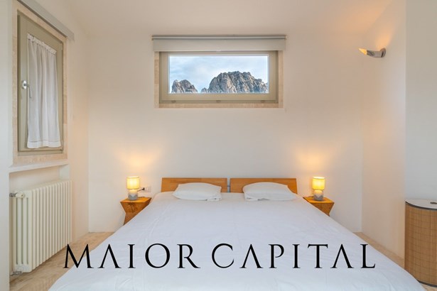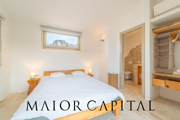 The internal staircase leads to the first floor, where the second double bedroom with en suite bathroom offers a true spectacle for the eyes: a breathtaking view of the peaks of San Pantaleo, perfect for those who wish to feel immersed in nature and find serenity.