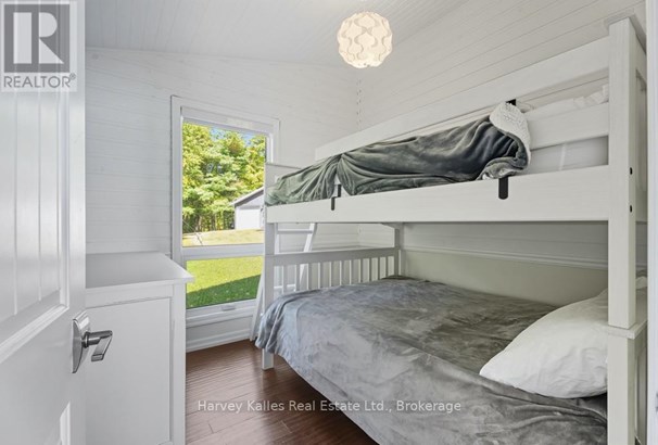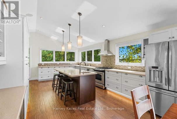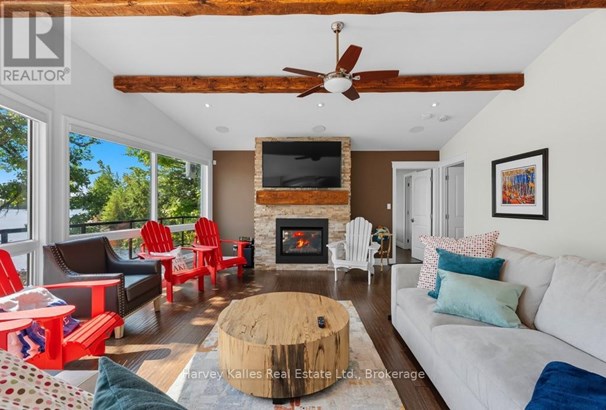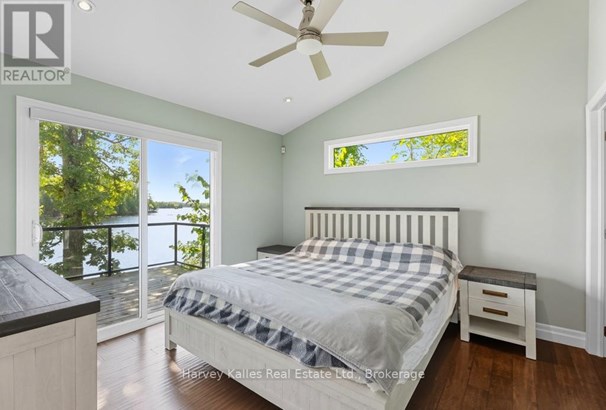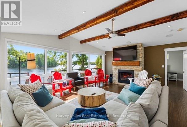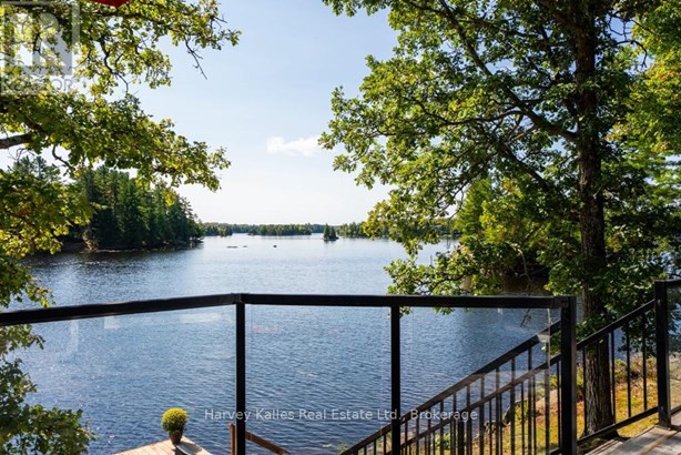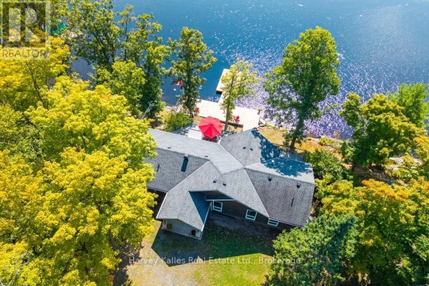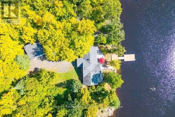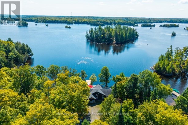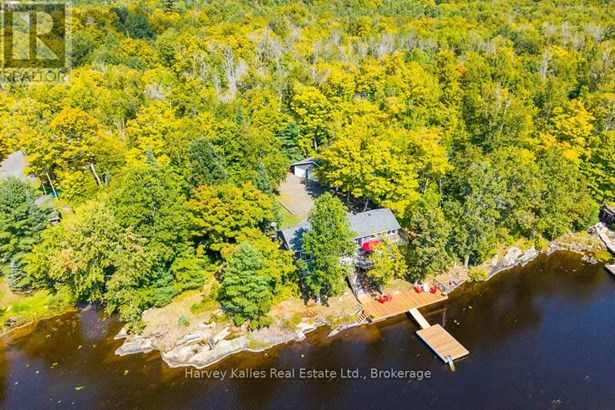 Stunning & inviting 4 season southerly oriented Lake Manitouwabing water's edge hideaway boasting island-dotted views and a beautiful sun-drenched classic rock shelf shoreline. Gentle topography, ease of year round municipally maintained road access with drive to the back door convenience. The all redone, elegant all season, 3 bedroom, 2 bath, sprawling bungalow boasts water views from almost every room, with a lakeside array of south to south-easterly facing windows & sliding glass doors spilling onto a large wraparound lakeside deck which connects down onto the brand new dock with expansive lakefront terrace area and separate granite fire pit patio. The cottage beckons & welcomes one with a lake view as soon as the door opens. Light & bright, luxurious designer infused interior features a gorgeous chef's kitchen with centre island & S/S appliances, water views, breakfast nook, bar area with bar fridge, opening to a generous lake-view dining area, and grande centrepiece great room with handsome floor-to-ceiling stacked stone propane-burning fireplace, and prow-front wall of windows overlooking once again stunning views. Waterside principal bedroom complete with its own walkout, walk-in closet, and luxe ensuite. 2 more main floor bedrooms, bath, laundry, plus the 276 sq. ft. sleeping cabin with bath attached to the insulated 2-car 23' x 23' detached garage. 213' of southerly shoreline, with rock point, rock shelf entry, deep and shallow water, sunrise and island-dotted views. 1.4 acres of level, private lands. Magnificent mechanicals, drilled well, central air, hot water on demand. The list goes on and on. Minutes from the exclusive Manitou Ridge Club for golf and dining, and a breeze to access from Toronto. With the ever rare and appealing aspect of having membership in the 'Longhorn Estates' Conservation Area 120+ acre backlands with hiking trails. 4 season cottaging splendour abounds on the ever desired Lake Manitouwabing. Being sold turnkey, fully furnished (id:16999)