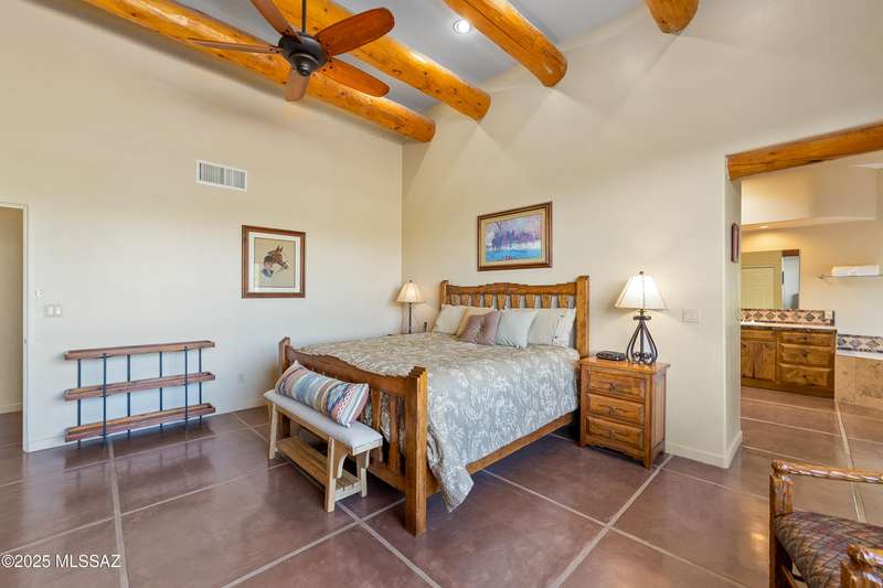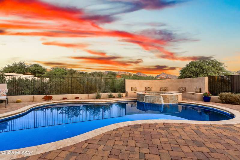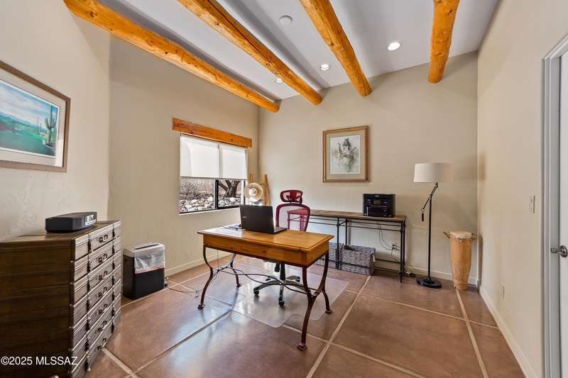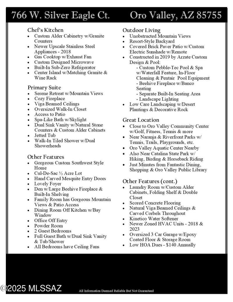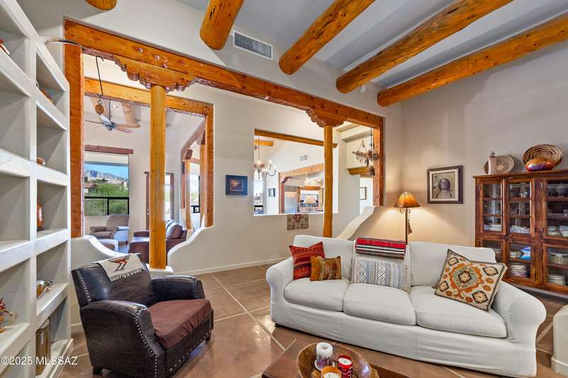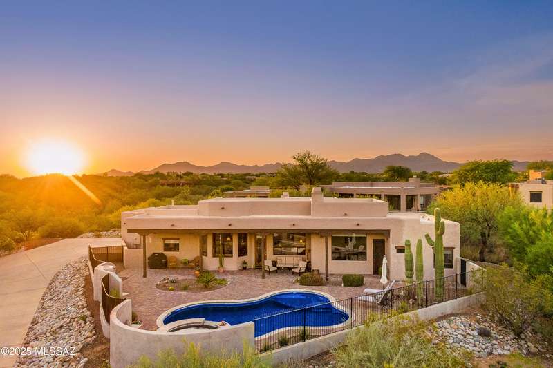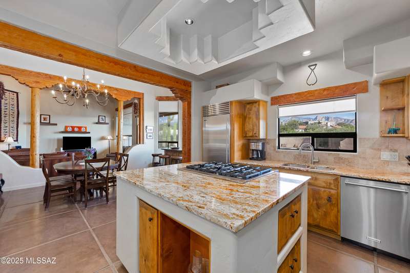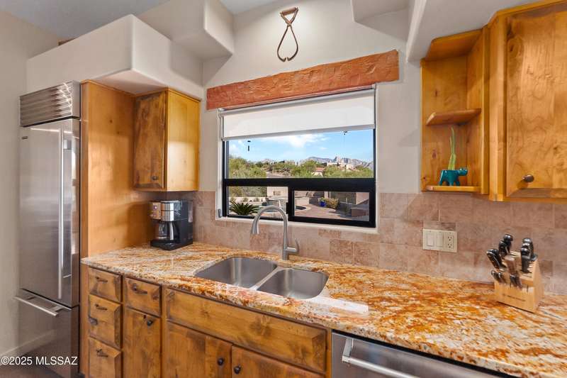Located in Sunridge in Oro Valley, this 2,888sf, 3 bedroom+den & office, 2 1/2 bath home embodies the warmth & spirit of the Sonoran Desert, thoughtfully designed for those who crave the unique character of the Old Pueblo. This custom southwest-style home blends beautifully into the desert landscape while offering authentic design and indoor-outdoor living. Set on a generous cul-de-sac 1/2 acre lot in the sought-after Oro Valley area, this home draws inspiration from traditional pueblo architecture with hand-carved mesquite entry doors, natural viga beams and scored concrete floors that radiate rustic charm. The den features a classic beehive fireplace, perfect for cozy evenings or quiet reading time. The heart of the home is a spacious chef's kitchen with custom alder and oak cabinetry,