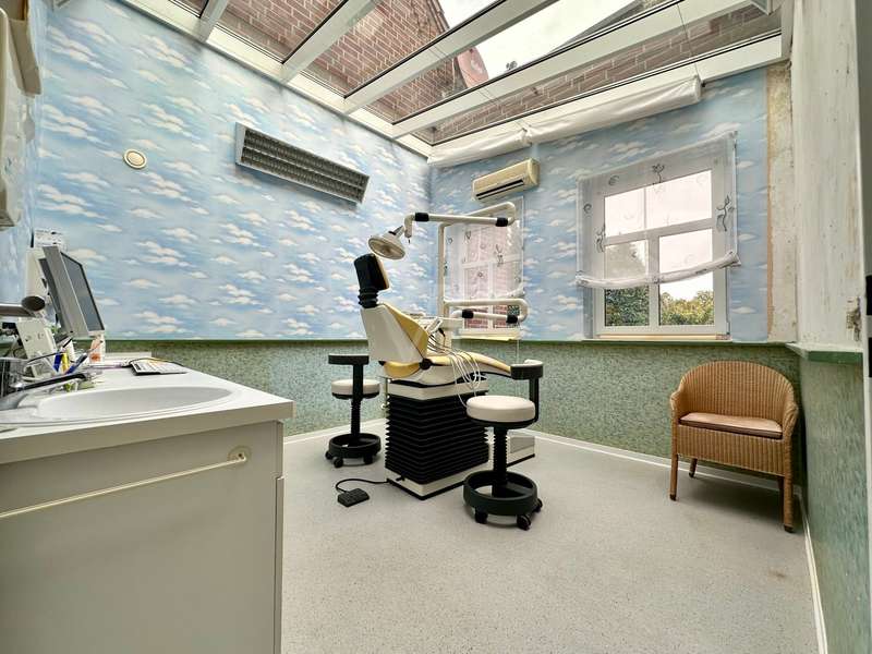 This former dental practice is centrally located in the heart of Lingen/Biene. You can realize your dreams here, whether you want to open a dental practice - the equipment can be taken over - or open your own business or office. There are no limits to the possibilities. It may also be possible to purchase the property. Please do not hesitate to contact us! On approx. 329 m² of office space you will find a total of 15 rooms, which are ideal for use as offices, treatment rooms, archives, storage or similar due to their individual sizes. The spacious reception area can be viewed through a gallery on the upper floor. There is a social room with kitchenette on both the first floor and the upper floor. Two separate changing rooms each have their own WC. A terrace behind the property and a large roof terrace allow you to spend break times outdoors. You have six parking spaces of your own at the building, with further public parking spaces directly in front of the property. The approx. 77 m² basement with 4 large rooms offers plenty of space for storing all kinds of things.