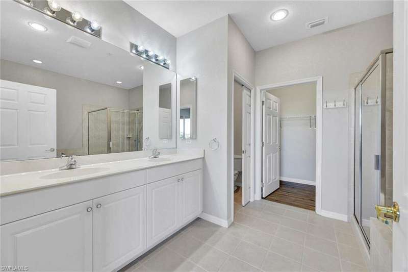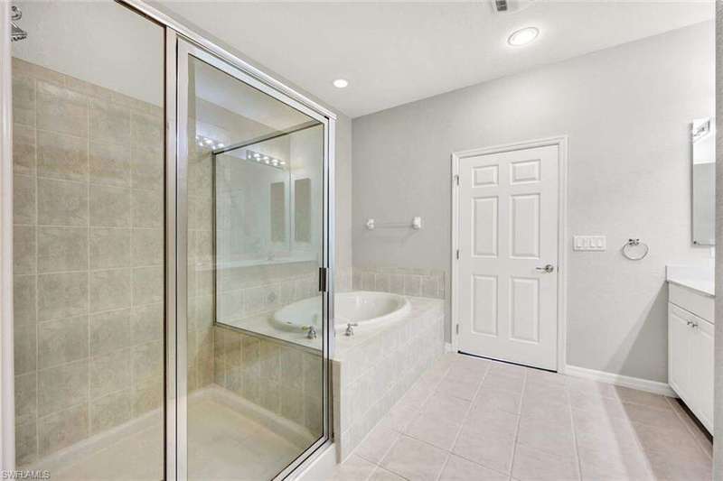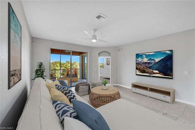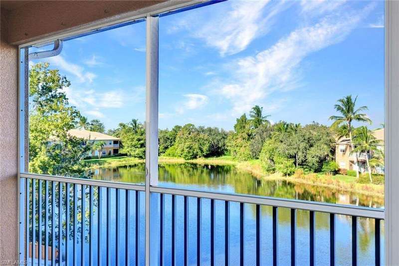 Close proximity to dining, shops and the beach from this Designer Series luxurious condominium home. Newer AC system, island kitchen, no carpeting; new luxury vinyl added to bedrooms and large den. Top floor 3rd story in elevator building in Marbella with high impact glass, rich wood cabinetry kitchen, granite counters and stainless steel appliances and newly painted interior, some new fans. Gated community, Marbella of Spanish Wells is a remarkably quiet setting. Premium gorgeous private lake view and beautiful sunset views. Open floorplan from kitchen looking over great room and covered screened patio. Spacious owner suite with large walk-in closet. Nice kitchen pantry, laundry room, covered parking and your own locked large storage room on 3rd floor near elevator. This is close to a 3 mile drive to beach. The community has additional optional memberships varying from golf and dining. Harbor Key Floorplan with no one living above you. Offered unfurnished. Drive to Barefoot Beach, Bonita Bay Promenade shops and dining, Mercado, Olde 41 Sugar Shack, and just over 20 minutes to the airport. Located off of Bonita Beach Road in quiet section of community. ANY PHOTO SEEN HERE WITH FURNISHINGS IN PHOTO ARE VIRTUALLY STAGED. No furnishings exist.
