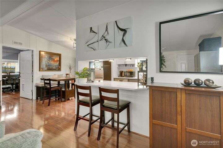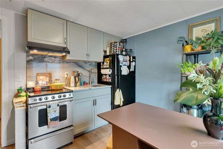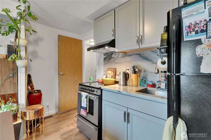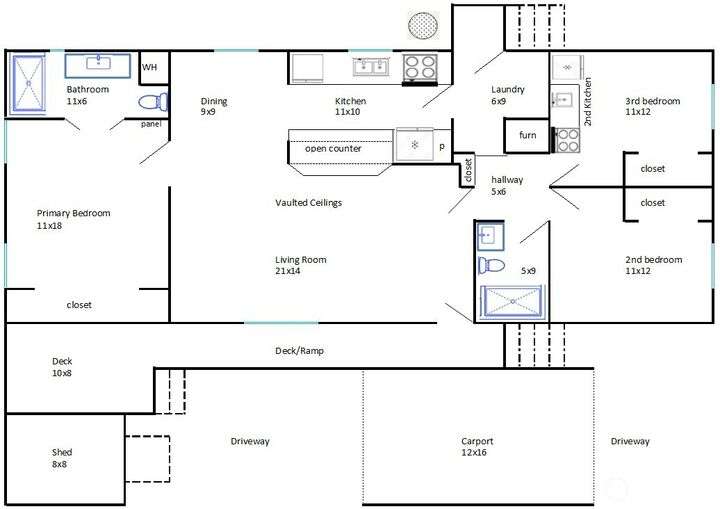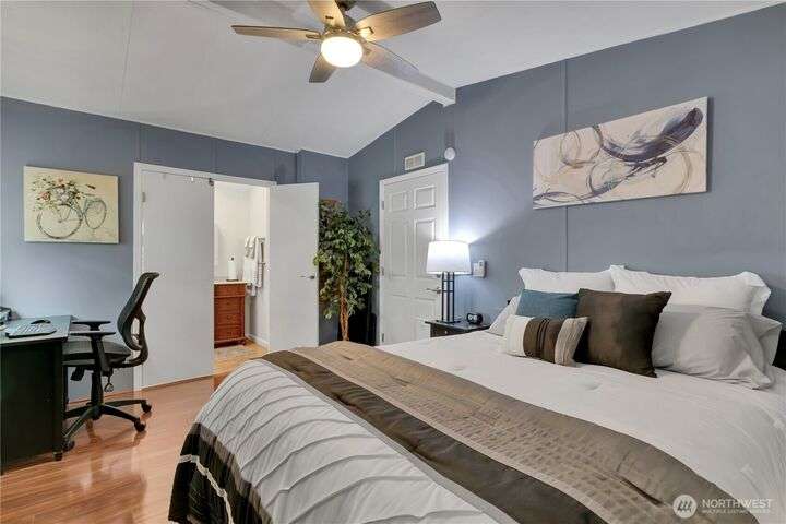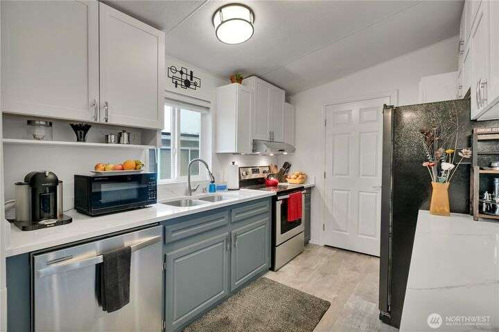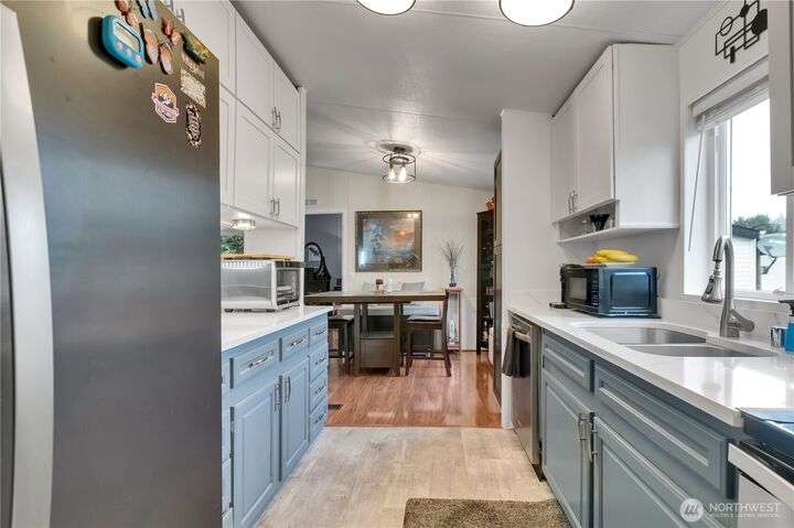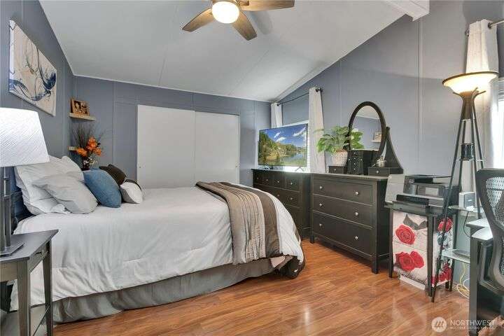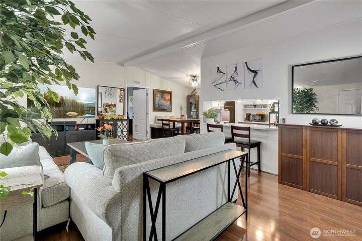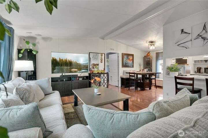 Beautifully remodeled in 2020 home w/ADU in Wonderland Estates 55+ community. Vaulted ceilings, open concept living/dining/kitchen with quartz counters, stainless appliances & new cabinets. Newer vinyl plank flooring throughout. 3 bed/1.75 bath includes updated bathrooms too. Split floor plan ADU offers privacy w/ primary suite on opposite side of the 2 bedrooms w/ full bathroom. 3rd bedroom features a permitted 2nd kitchen—ideal for guests, caregiver or roommate. Double pane windows, hardy plank siding, newer water heater & heat pump w/AC. 2-car carport perfect for parking or outdoor entertaining. Deck with ramp, powered shed, generator-ready. Wired ring camera lighting Low $645/mo lot fee includes garbage. Community clubhouse & RV parking