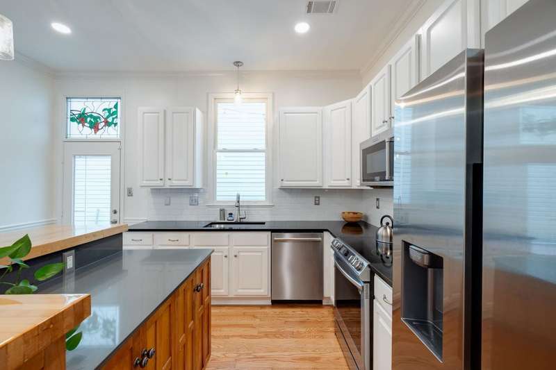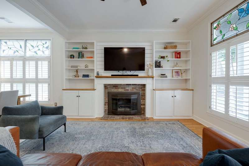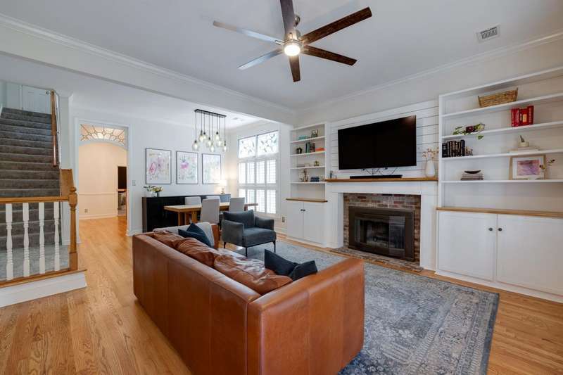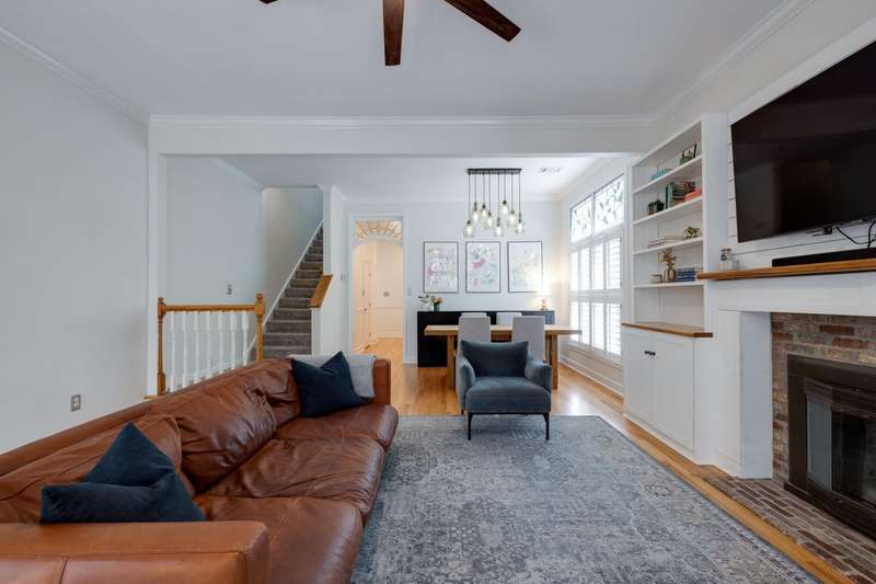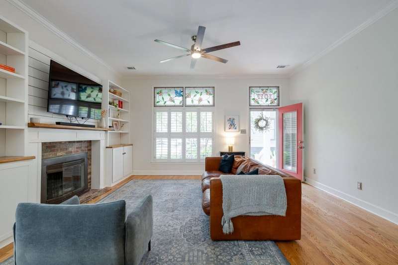 Just 60 yards from the scenic Mississippi River and a short walk to shops and dining?with no street noise?this 3 bedroom 3 bathroom home offers the best of Harbor Town living! Tucked between two parks, it features 10-foot ceilings, newly refinished hardwood floors and abundant natural light throughout. The main level has a spacious living room with wood burning fireplace (gas starter) and custom built-ins, and a bright kitchen with quartz countertops, island, and pantry. One bedroom and full bath downstairs offer added flexibility. Upstairs, enjoy brand-new carpet and a generous primary suite with private screened-in balcony and seasonal river views. Inviting front and side porches offer the perfect spot to relax, while the attached 2-car garage adds everyday convenience. Recent updates include a brand-new HVAC system (2024). Just steps from the riverfront and Greenbelt Park, this home is perfectly positioned in Harbor Town's vibrant, walkable community.