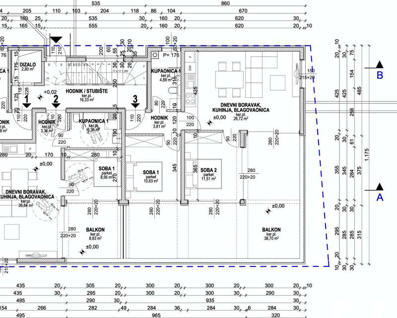 Apartment S3 - Ground floor - living area 57.55 m2 (2 bedrooms + bathroom) + terrace (38.70 m2 - W - S) + yard (68 m2) + storage (2.88 m2) + outdoor parking space PM9, total net area 87.39 m2 = 320,000 EUR