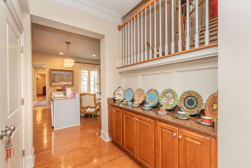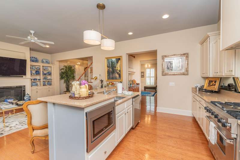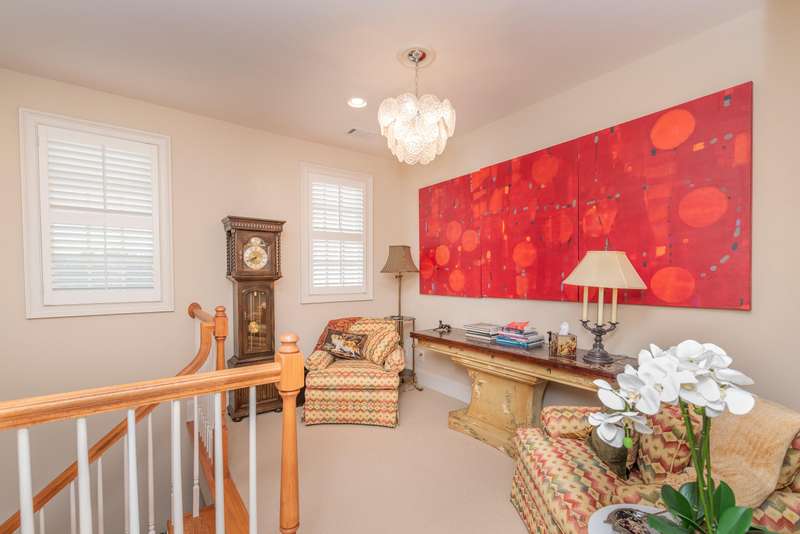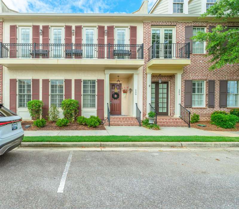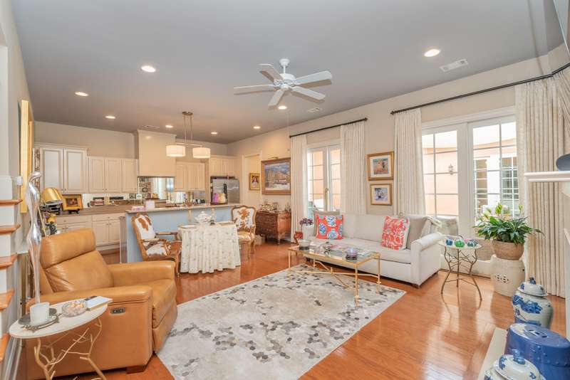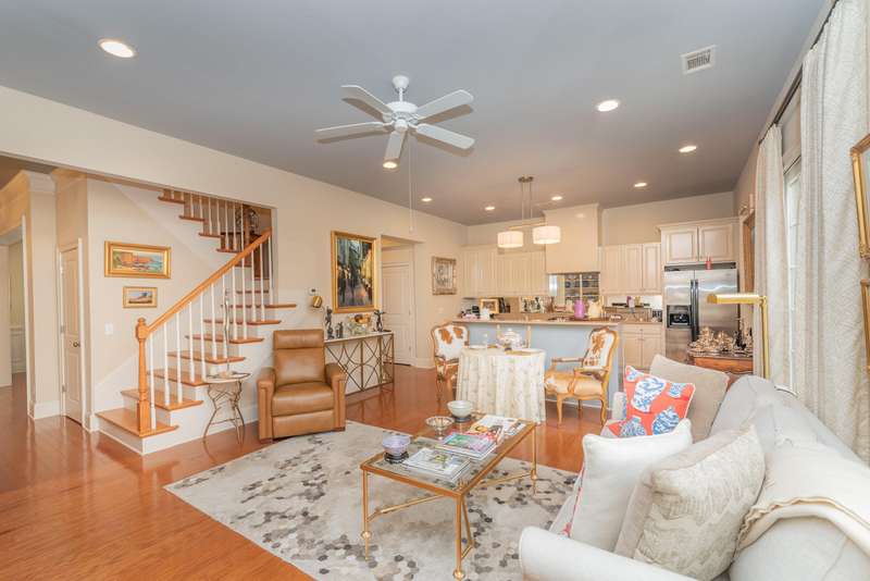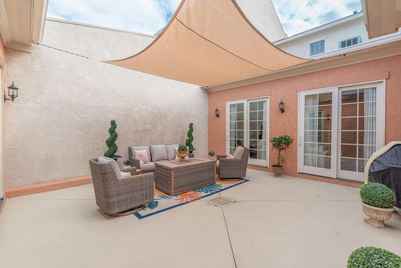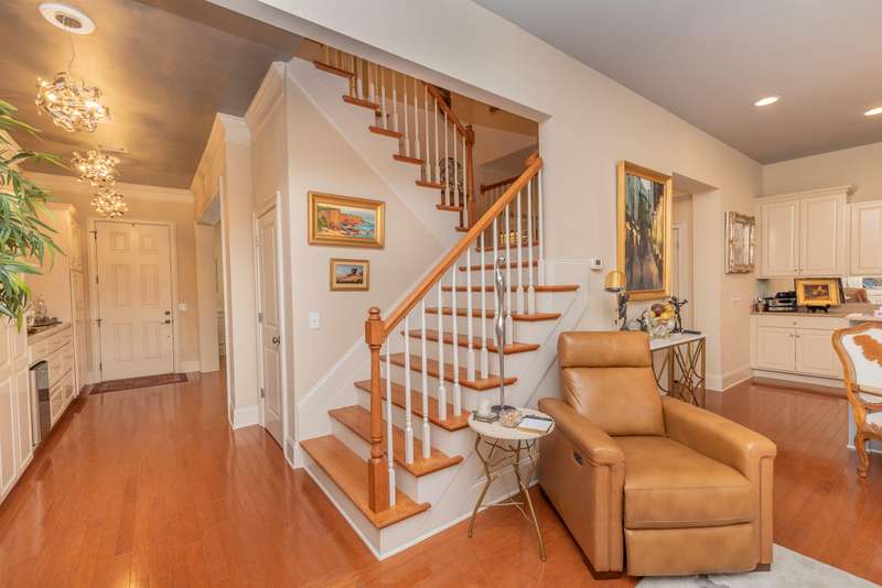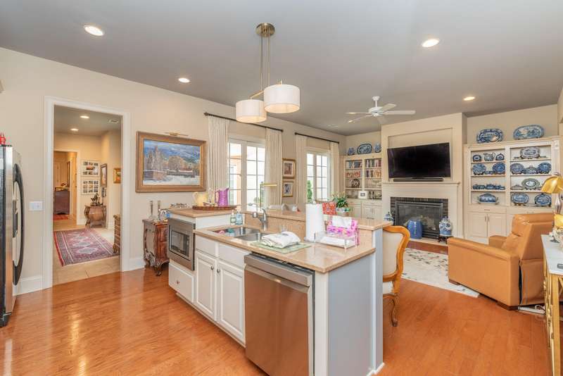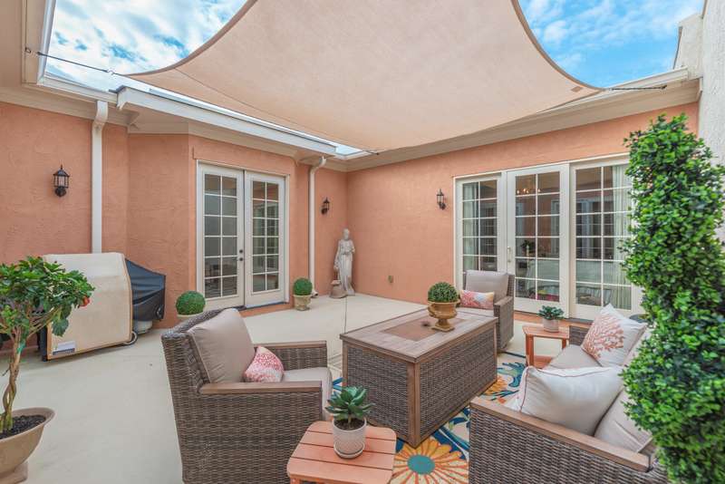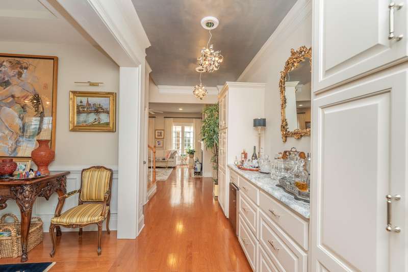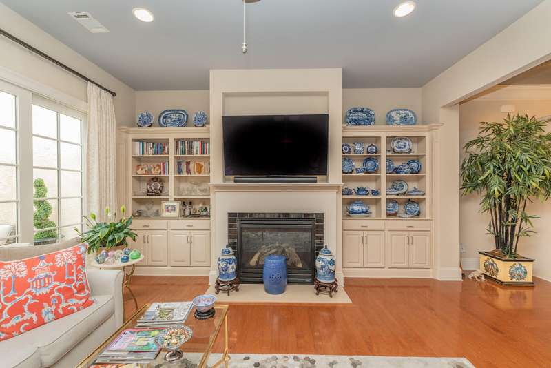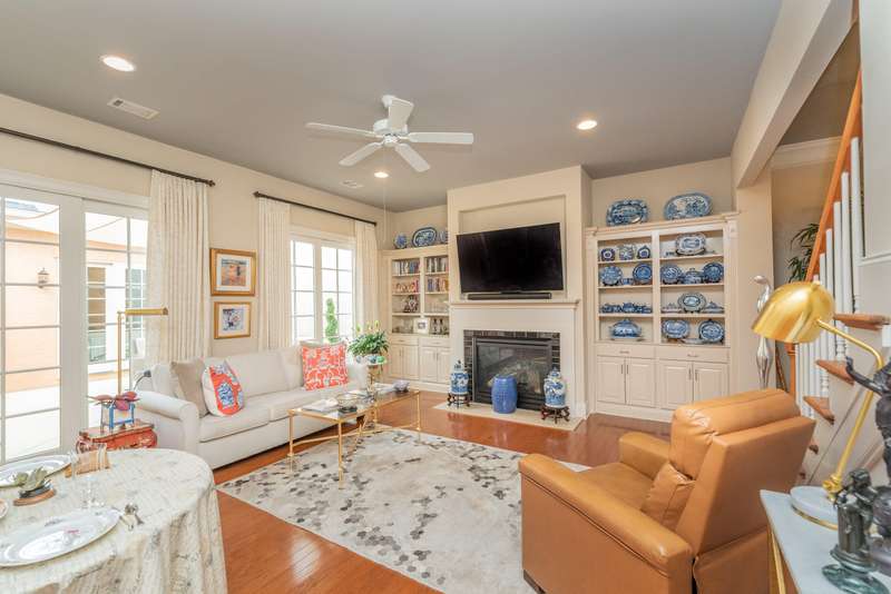 Exceptionally well designed high end townhome in the Village @ Woodside. This home features hardwood flooring on first floor with amazing built-ins. The natural light throughout this home is highlighted by its custom cabinetry and 10' ceilings. Centered in the den are views of a private courtyard. Kitchen opens to den feature Quartz countertop and high-in appliances.. Main level owners suite with walk in shower, large closet and entrance to courtyard. Upper level features 2 BRs, 2 full BA w/walk in closets. Great community walking distance to restaurants and shopping
