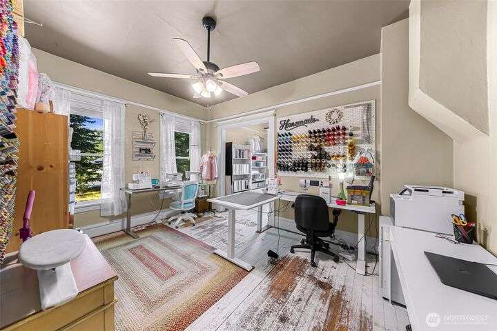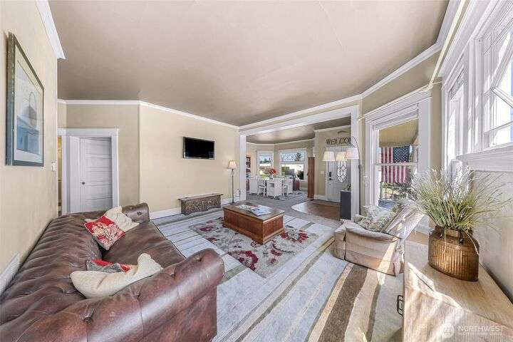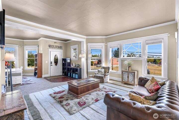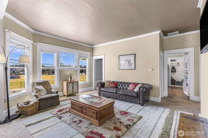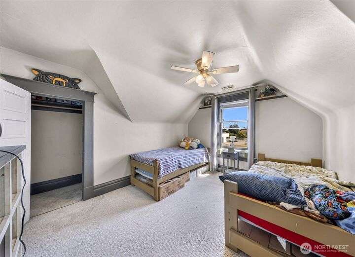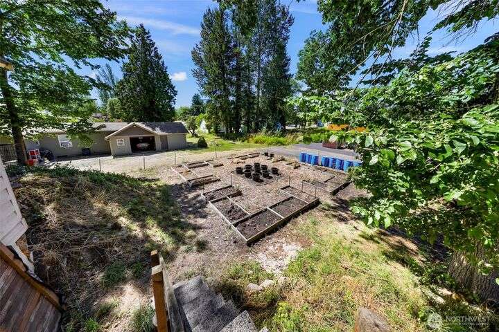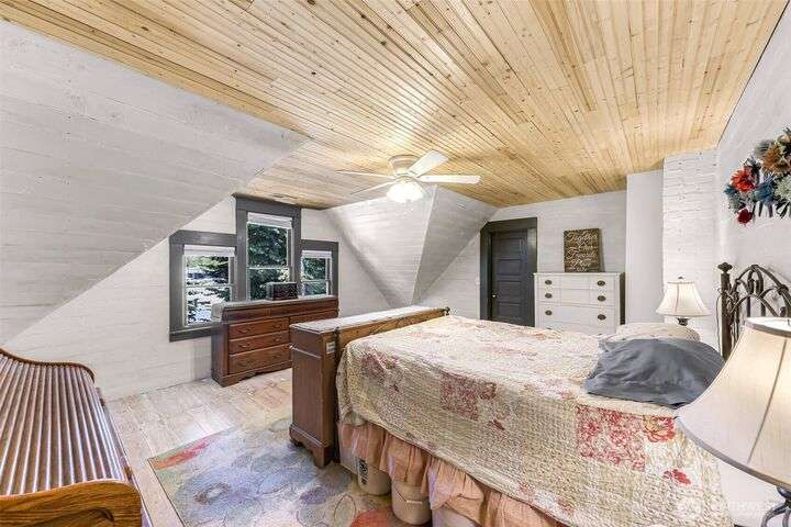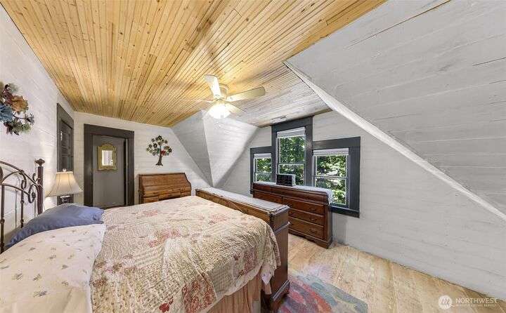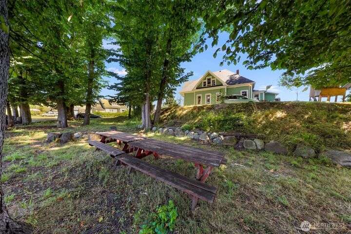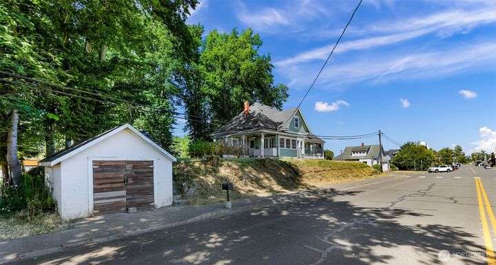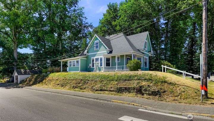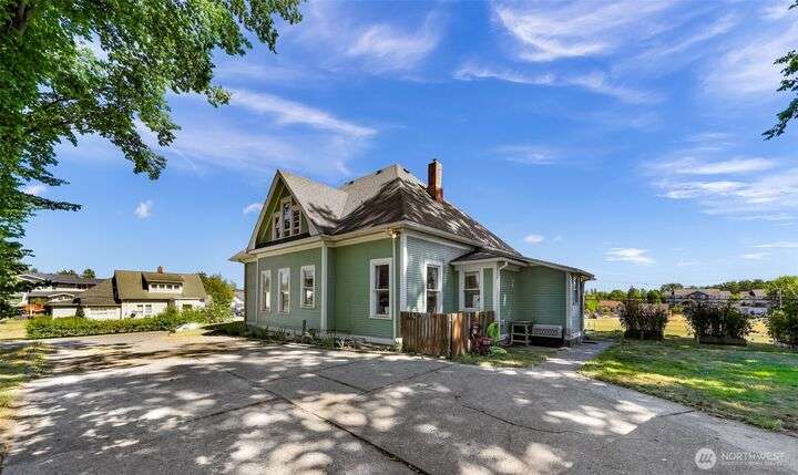 Charming turn-of-the-century 4 bed/2 bath farmhouse sits high upon a spacious .4-acre lot in the heart of Ferndale. Just steps from Pioneer Park, the scenic Riverwalk & downtown amenities. This historic gem features a newer roof, updated systems & abundant character. Reveal the carpets for original hardwood floors throughout. Tall ceilings & vintage woodwork add grace. Large walk-in closets, butler's pantry & primary bedroom ensuite. Enjoy outdoor living under the covered deck or by the fire pit & picnic area. Large garden shed, huge garden plot, mature fruit trees/shrubs. Unbeatable walkability to shops, eateries, brew pubs, Boys & Girls Club, and schools. Includes detached garage—cosmetic updates will make this home truly shine!