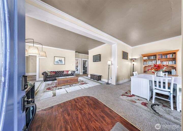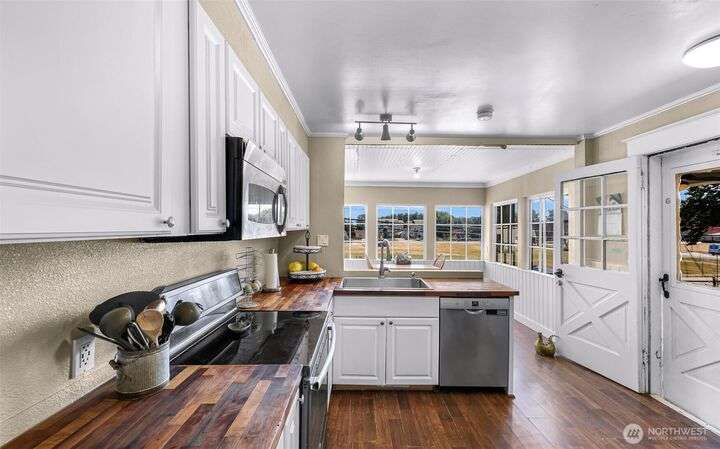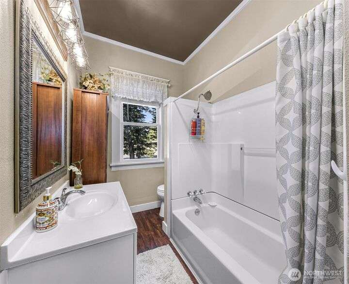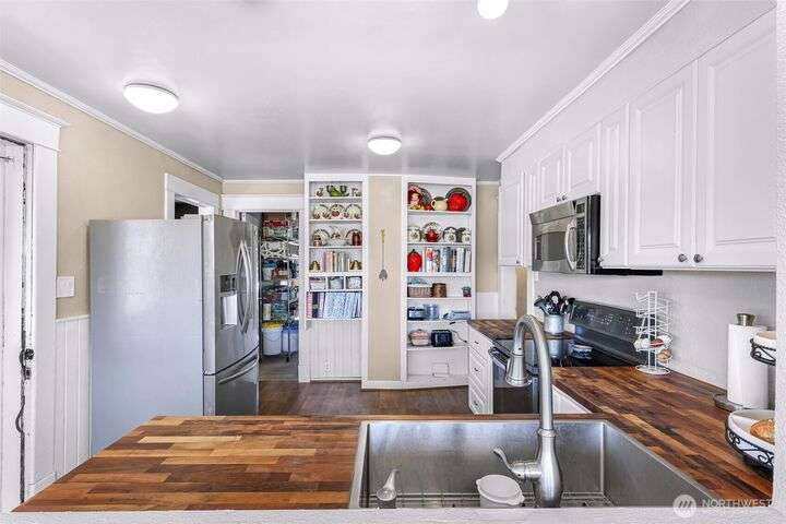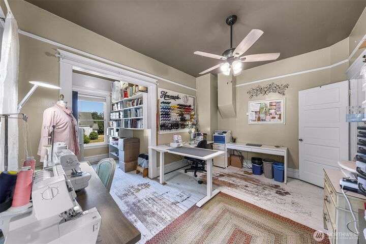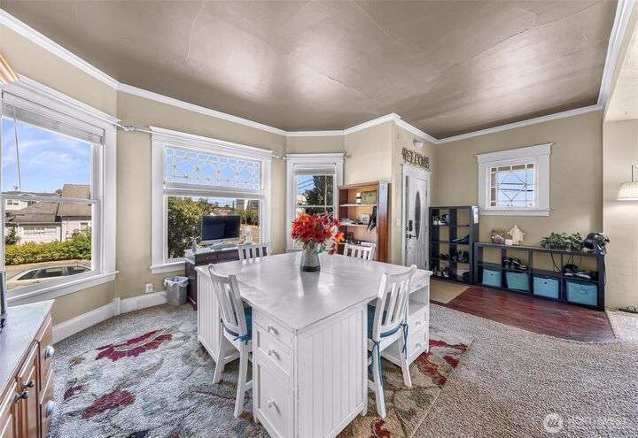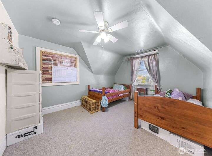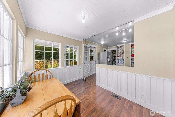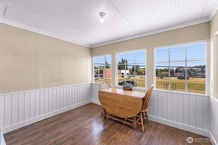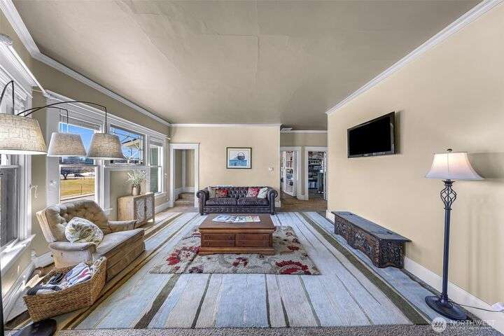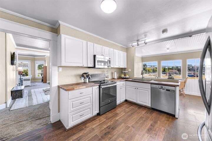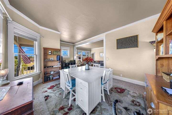 Charming turn-of-the-century 4 bed/2 bath farmhouse sits high upon a spacious .4-acre lot in the heart of Ferndale. Just steps from Pioneer Park, the scenic Riverwalk & downtown amenities. This historic gem features a newer roof, updated systems & abundant character. Reveal the carpets for original hardwood floors throughout. Tall ceilings & vintage woodwork add grace. Large walk-in closets, butler's pantry & primary bedroom ensuite. Enjoy outdoor living under the covered deck or by the fire pit & picnic area. Large garden shed, huge garden plot, mature fruit trees/shrubs. Unbeatable walkability to shops, eateries, brew pubs, Boys & Girls Club, and schools. Includes detached garage—cosmetic updates will make this home truly shine!