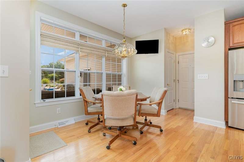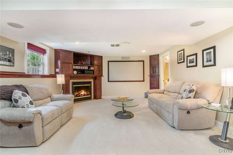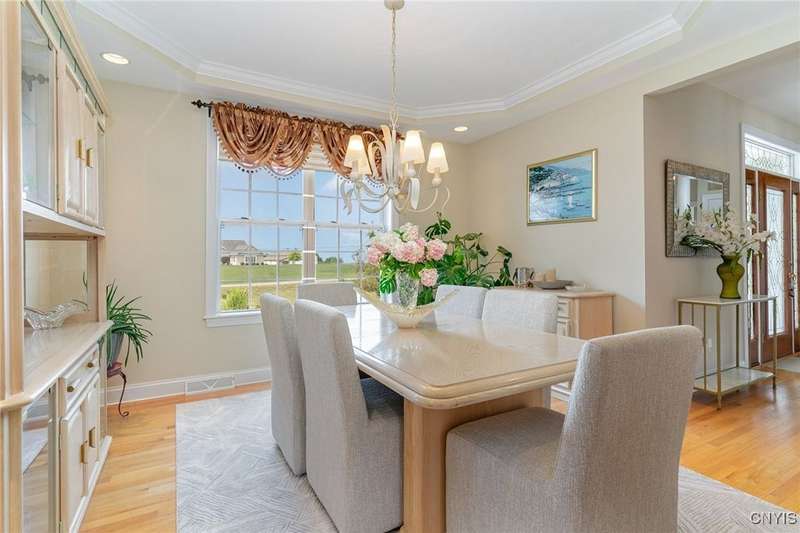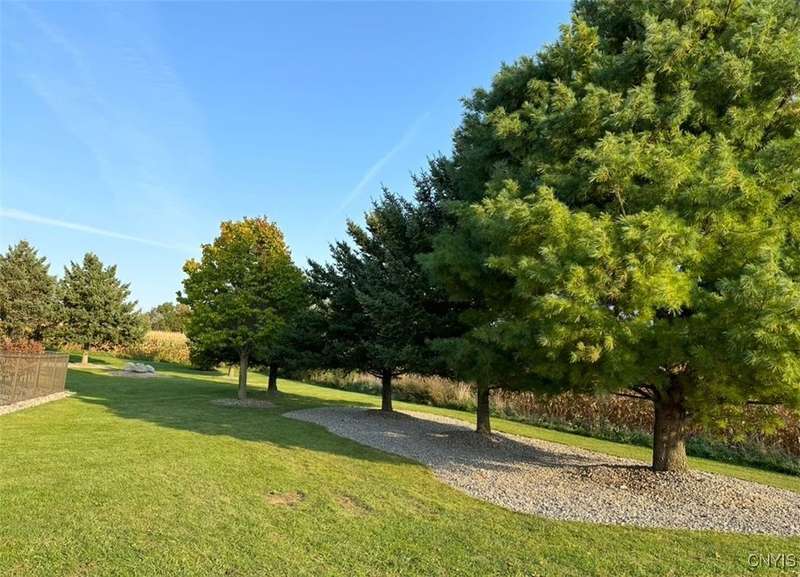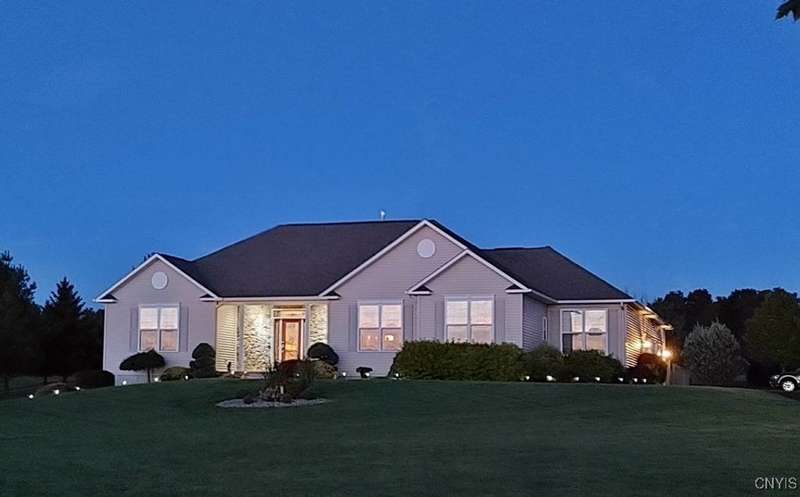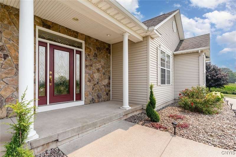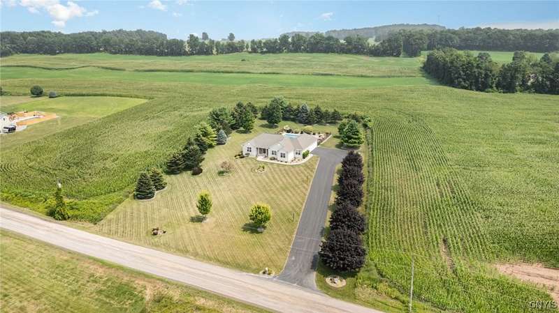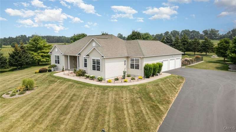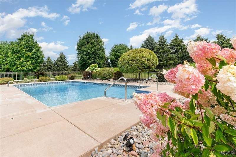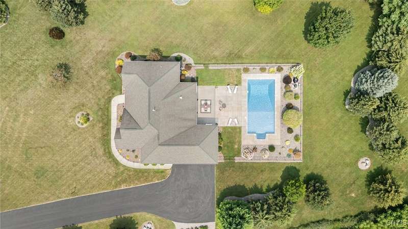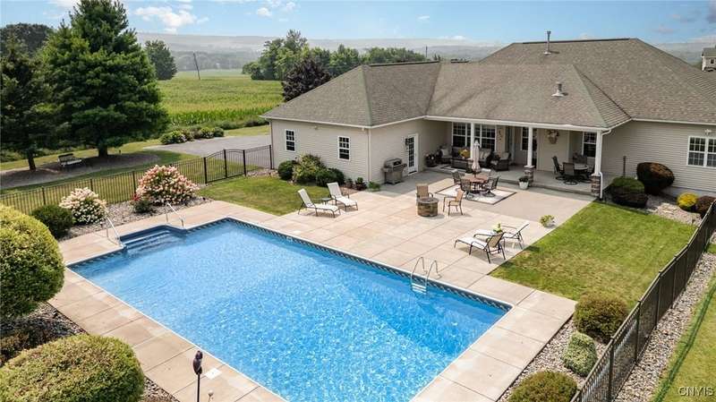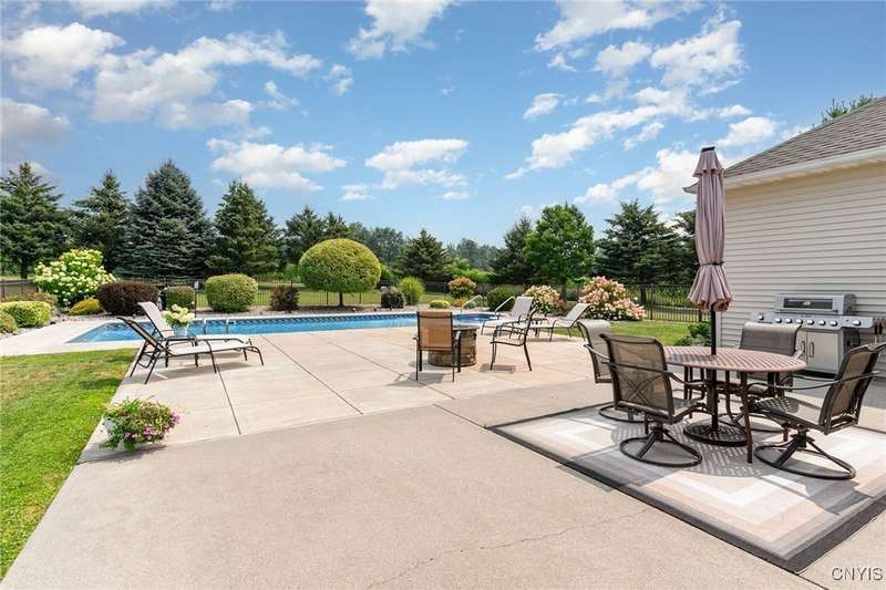 This exceptionally well-maintained custom-built home sits on nearly 2 acres of beautifully landscaped, tree-lined property, offering a rare combination of privacy, quality, and thoughtful design. Constructed with 2x6 framing and 9-foot ceilings, every detail was carefully considered for comfort and style.Step inside to a bright and airy floor plan, where the large foyer welcomes you into a spacious living room featuring gleaming hardwood floors, a gas fireplace, and surround sound for music and TV. The formal dining room is ideal for both quiet dinners and entertaining, highlighted by a tray ceiling and recessed lighting. The chef's eat-in kitchen is equipped with cherry cabinetry, a new French door stainless steel refrigerator, a new electric oven, dishwasher, microwave, and a five-burner gas cooktop. Enjoy views of the expansive 20x40 heated inground pool and extended patio area?perfect for outdoor entertaining or peaceful relaxation. The first-floor laundry room includes cabinetry, a utility sink, and a closet for added storage and functionality. The luxurious owner's suite features two large walk-in closets, a spa-like bath with double sinks, a glass-door shower, jetted Jacuzzi tub, linen closet, and large windows overlooking the private, treed lot and pool area. The finished lower level adds 712 square feet of additional living space, included in the total square footage. This inviting area features a spacious family room complete with surround sound, a large-screen TV/projector, and a cozy fireplace?ideal for movie nights or relaxing with guests. A custom bar with six matching barstools, built-in wine cooler and refrigerator, and extensive cabinetry and shelving makes it a perfect space for entertaining. The full basement also offers a half bath, a dedicated exercise area, generous storage, and a convenient stairway leading up to the oversized 3.5-car garage. The exterior is equally impressive, with over 30 evergreen and blue spruce trees offering natural privacy and red maples lining the driveway. This home is the perfect blend of refined living, comfort, and outdoor enjoyment. Everything is on 1 floor, if you like or need one floor living space!