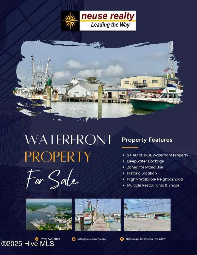 Consider two acres of unduplicatable prime waterfront MU-1 property with attached deepwater dockage, nestled in the quaint seaside village of Oriental NC, referred to as the sailing capital of the US East Coast. Redevelopment end uses currently contemplated are summarized in the uploaded documents include: 20 seaside condominium units OR an international ECO Hub to showcase emerging products and services in the sustainability space. Nearby regional airports, colleges and universities, waterfront which flows to the nearby ICW all support end uses limited only by the vision of the buyer. Appraisal, surveys, Phase 1 available for review. Transformative Waterfront Village Center in Historic Carolina Discover the potential of this exceptional commercial multi-use development project located in the heart of a historic waterfront village in North Carolina. This unique opportunity aims to revitalize an underutilized commercial building, transforming it into a vibrant village center that will become the hub of waterfront activity. KEY FEATURES: - Prime Waterfront Location - Situated in a picturesque historic village, this development offers stunning waterfront views and easy access to local attractions. - Mixed-Use Development - The project includes a blend of residential, commercial, and recreational spaces, creating a dynamic environment for residents and visitors. - Historic Preservation - The development will preserve the building's historic charm while incorporating modern amenities and sustainable design principles. - Community Engagement - Extensive community involvement ensures that the project aligns with the needs and desires of local residents, fostering a sense of ownership and pride. - Economic Growth - By attracting small businesses, restaurants, and retail shops, the development will stimulate the economy and create jobs. - Cultural and Recreational Activities - The village center will feature spaces for cultural events, art galleries, performance venues and outdoor parks, thereby enhancing the quality of life for the community. - Sustainable Design - Incorporating energy-efficient systems, green roofs, and water conservation measures, the project aims to minimize its environmental impact and reduce operating costs. - Public-Private Partnerships - Collaborations with local businesses, non-profits, and government agencies will provide valuable resources and support for the project's success. This transformative project promises to breathe new life into the historic waterfront village, creating a vibrant and sustainable community space that honors the past while embracing the future. Join us in making this vision a reality and be part of a thriving village center that celebrates the unique charm and heritage of the Carolinas. OPEN TO PARCELING OR OTHER POTENTIAL USES The property has already been approved for subdivision, subdivided for future development, this includes retail, hospitality, education etc. -- Excellent Relationship with Local Officials Local leaders are highly supportive of any of the use cases outlined below and are open and flexible on exploring most other use cases for the property. They share our vision for the future of the property. -- Development Assistance Post-Sale In addition to assisting with the smooth sale and transfer of the property, we have also partnered with a qualified project facilitator in order to provide a number of additional options to any potential buyer post-purchase. "BEST USE FOR BEST VALUE" Some Potential Uses include, but are not limited to: ** Fish Market / Seafood Restaurant ** Luxury Condominiums with Private Vessel Docking ** Hospitality / Hotel ** Marina - Deep Water Docking ** Education Lab - Global Eco Hub ** 20 Unit Duplex Town Waterfront Village
