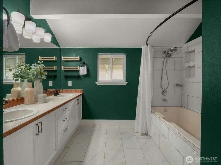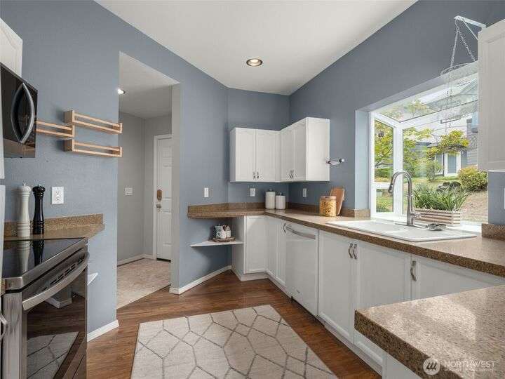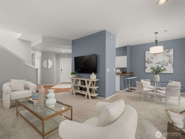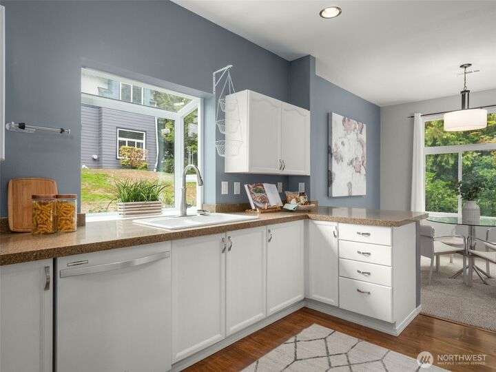 Rare find in west Bothell: stylish & sunny end unit w spacious floorplan. Townhome-style condo has generous living room w gas fireplace & french doors opening out to patio + greenspace. Open kitchen design w peninsula island lends itself to dining area w new light fixture. Upstairs offers two suites! Primary has double closets, and brand new primary bathroom just renovated. Second suite has its own full bath attached. Upgrades incl brand new carpet, designer paint colors, closet organizers, cat6 tech wiring, newer fridge & range. Full laundry room, guest powder bath, and amazingly clean 2-car attached garage. Super convenient location: mins to 405, Bothell-Everett Hwy, or backroute to Kenmore, Lk Forest Pk, or Alderwood. Move in ready!