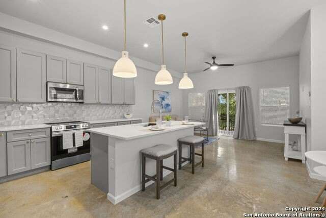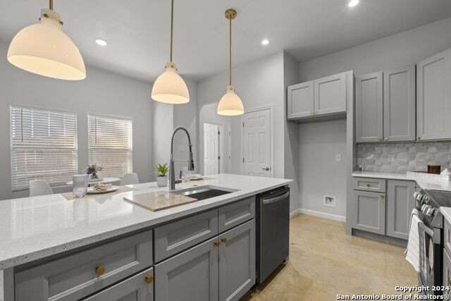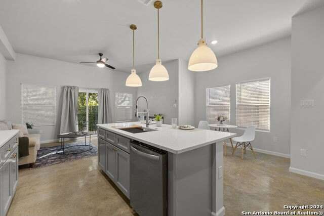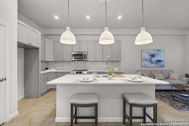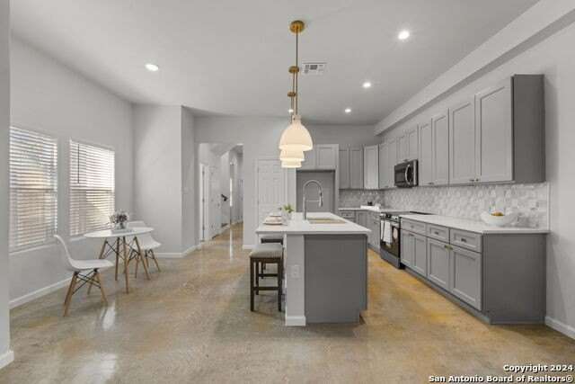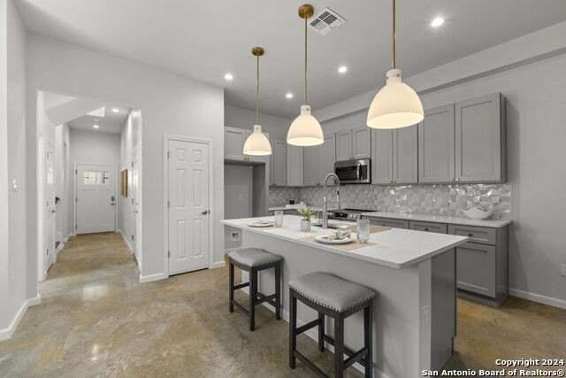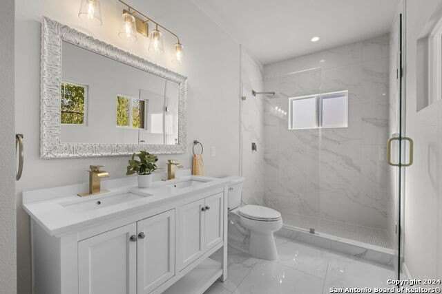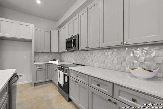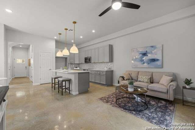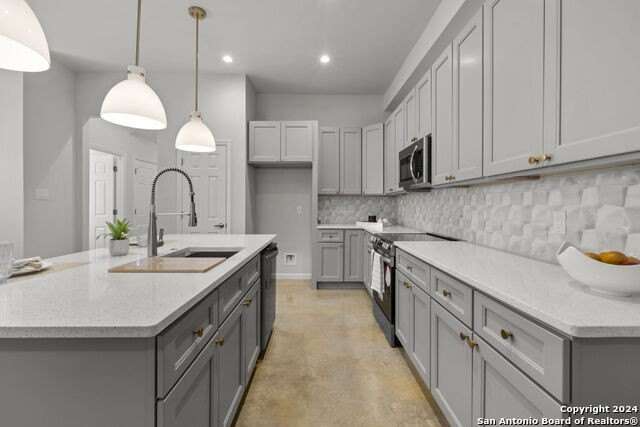 Nestled in the highly sought-after city of Terrell Hills, this exquisite three-bedroom, 2.5-bathroom townhouse-style condo effortlessly combines modern design with luxurious comfort. Upon entering, you'll be greeted by soaring high ceilings and sleek polished concrete floors on the main level. The open-concept living space includes a versatile office area, ideal for remote work. The gourmet kitchen is a culinary haven, featuring custom modern cabinetry with soft-close drawers, elegant quartz countertops, and imported tile backsplashes. A Kohler under-mount, single-basin stainless steel sink-complete with a basin mat and cutting board-adds both functionality and style. Above the kitchen island, a Newton Bell Wide Pendant casts a warm, contemporary glow. The seamless flow from the kitchen to the living and dining areas creates an inviting space for entertaining. The owner's suite is a true retreat, complete with a private patio and expansive walk-in closet. A stylish Jack and Jill bathroom connects the two secondary bedrooms, offering both convenience and practicality. This home is a true example of modern living, with thoughtful design and upscale finishes throughout. Outside, the meticulously landscaped grounds require minimal maintenance, allowing you to fully enjoy the comforts of your home. Ideally located near Fort Sam Base and just moments from the vibrant Historic Pearl, the Witte Museum, and other top attractions, this condo offers a rare blend of luxury and convenience. Don't miss the opportunity to make this exceptional property your own.