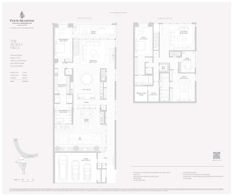 Four Seasons Lake Austin Secures Full Capitalization as of July 2025, with vertical construction start Fall 2025. We are proud to present The Villas at Four Seasons Private Residences Lake Austin, an unparalleled offering of only 28 stand-alone residences, each poised with 180 panoramic views on the most coveted location along the serene shores of Lake Austin. These custom-designed single-family homes range from 5,600 to 6,000 interior square feet and are available completed starting at $12 million and up to $18 million depending on the location of the home site. Both Villa plans have been meticulously designed to include a 32-foot pool, expansive shaded terraces, private garages, elegant guest suites, wine rooms, valet closets, and more. Enjoy breathtaking panoramic views of the skyline, the iconic 360 bridge, lush ACC golf course, and the most serene Lake Austin views from your private sanctuary. The first of these exceptional estates to be built will be delivered by the end of 2026, meticulously crafted by one of Austin's most renowned and respected builders. Tax and assessed values are estimates for illustration purposes only. All figures should be independently verified.