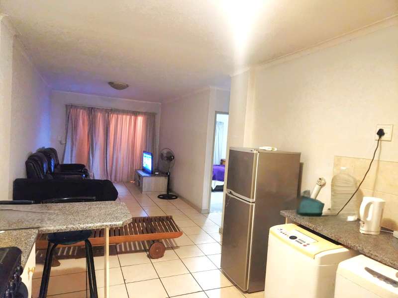 Viewings by appointment only, book at least one day in advance. Contact the agent to schedule a time. This neat and spacious first-floor apartment in the well-maintained Riverside Place complex, Zwartkop, is for sale. It's within walking distance of Centurion Mall, McDonald's, and the Gautrain bus stop. The complex is popular with OUTSURANCE employees, making it a great investment with high rental demand. The open-plan kitchen has space for two appliances and a fridge, plus a standard oven and four-plate electric stove. The unit features two bedrooms with built-in cupboards and a shared full bathroom with a bathtub, hand shower, toilet, and basin. The dining and living area leads to a private balcony with peaceful greenery views, perfect for relaxing. The building includes an elevator for convenience and wheelchair accessibility. A covered parking space is also included.