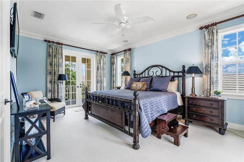 Meticulously maintained Hamilton plan traditional 3 bedroom+study on generous .38 acre super private cul-de-sac lot. Delightful SE exposure outdoor living space. Lush yard, lg heated pool/spa, covered lanais. First floor primary suite. Downstairs study with pool access bath. Updated kitchen opens to family rm. Dining rm overlooks courtyard. Living rm w/ wet bar and fireplace. Upstairs 2 en suite guest rooms open to gracious balcony. Rich detailing. Impact glass + shutters. Big laundry rm, 2 car garage. Fabulous Palm Island amenities- beach club, pier, pools, fitness. Dimensions approximate.