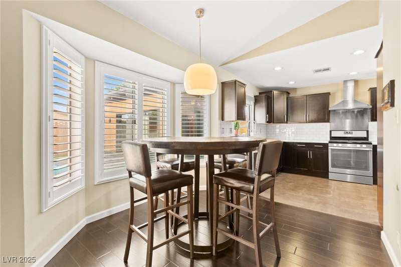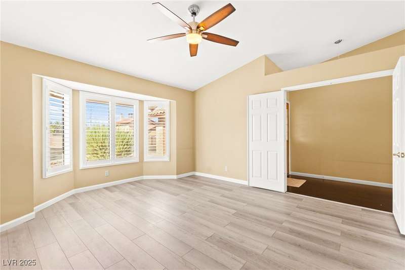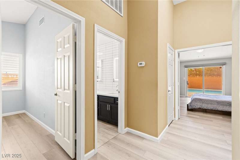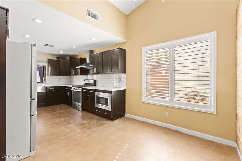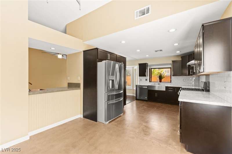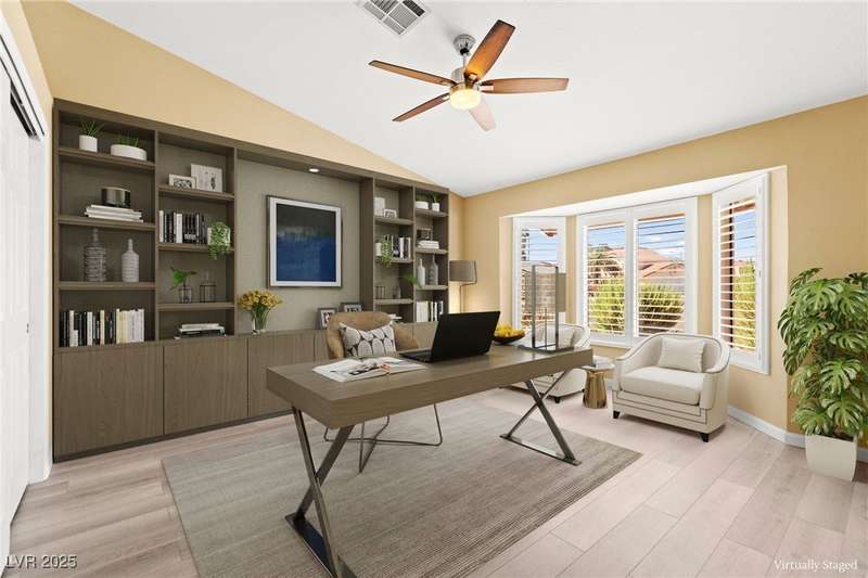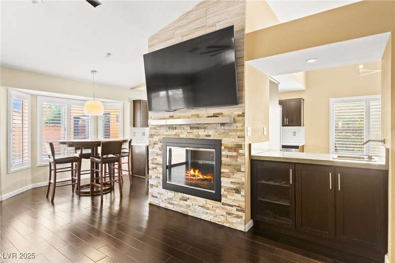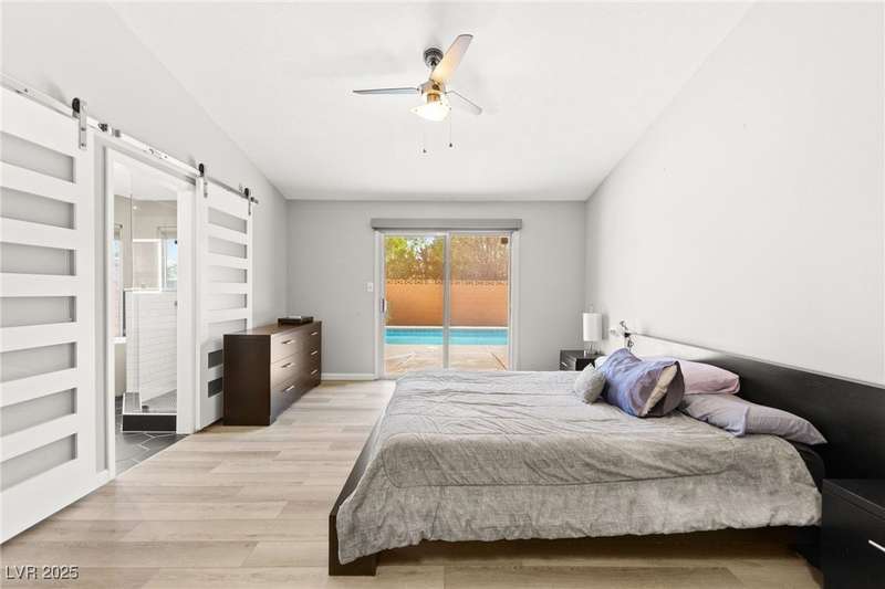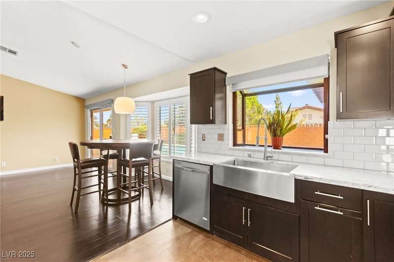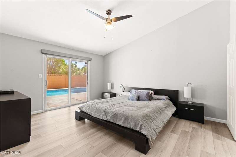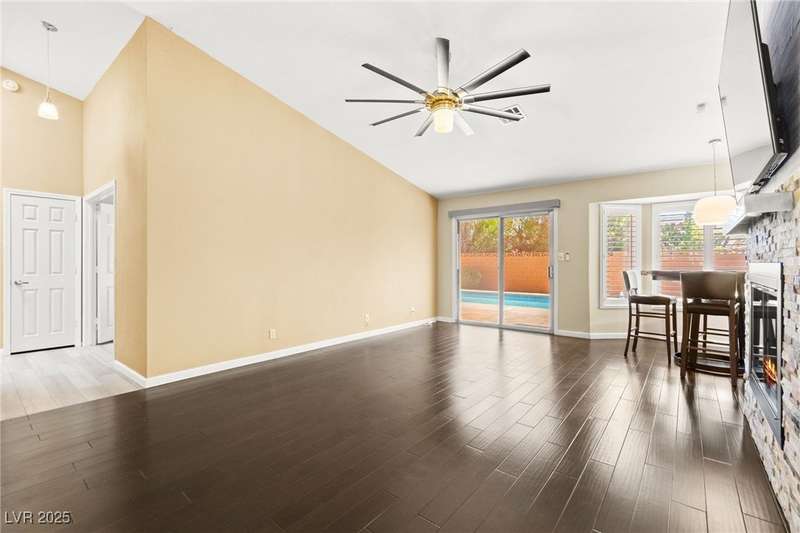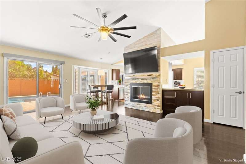 Fully remodeled single-story home featuring three bedrooms and two bathrooms, plus a flexible front room that can serve as a fourth bedroom or home office (complete with a closet). The spacious layout includes vaulted ceilings, a family room with a cozy fireplace and wet bar, a formal dining room, and a bright breakfast nook. The upgraded kitchen offers soft-close cabinets and stainless steel appliances. The primary suite boasts a skylight and a bathroom with a separate tub and shower. Outside, enjoy the backyard oasis with a pool, spa, and patio. A separate building in the backyard has been converted into a home gym with its own AC and security doors. Additional highlights include a three-car garage, RV/boat parking, and no HOA. Located in an established neighborhood near Boca Park and just minutes from Downtown Summerlin.