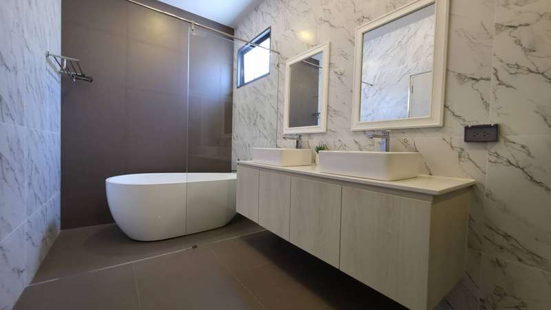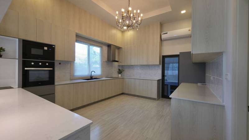 Inside, you'll find 3 spacious bedrooms and 4 bathrooms, a European kitchen for modern cooking, and a separate Thai kitchen for convenience. The highlight is the private 3×8 m. swimming pool with waterfall feature, creating a relaxing tropical atmosphere.