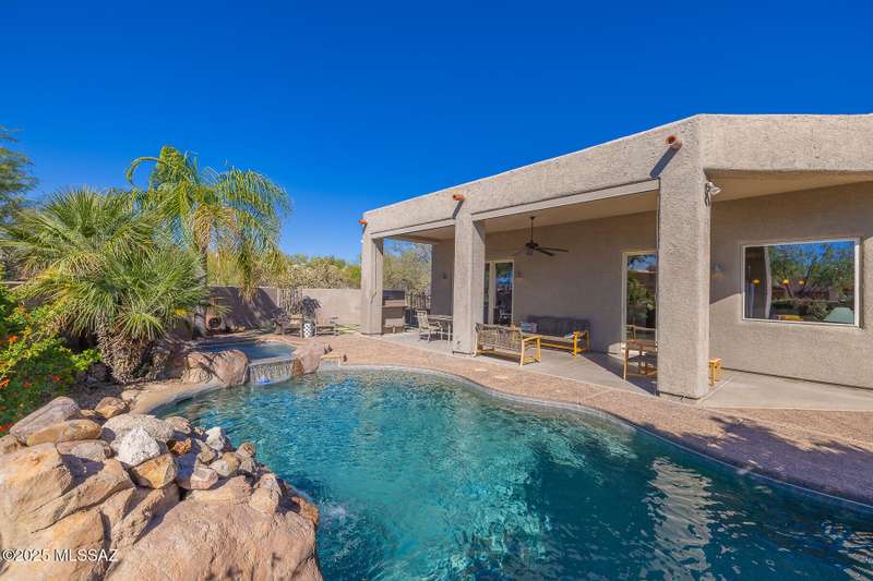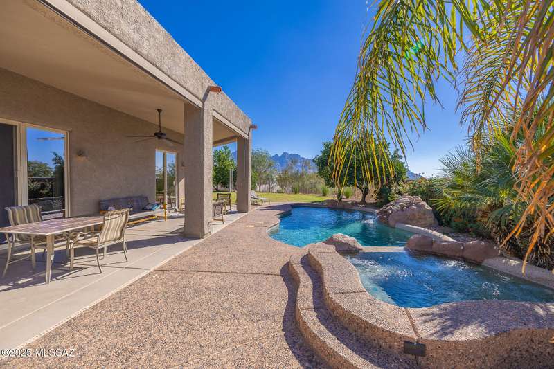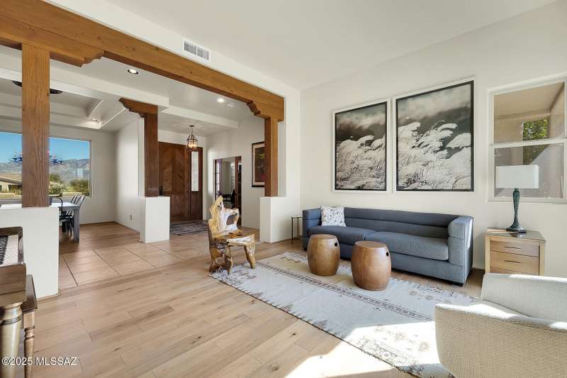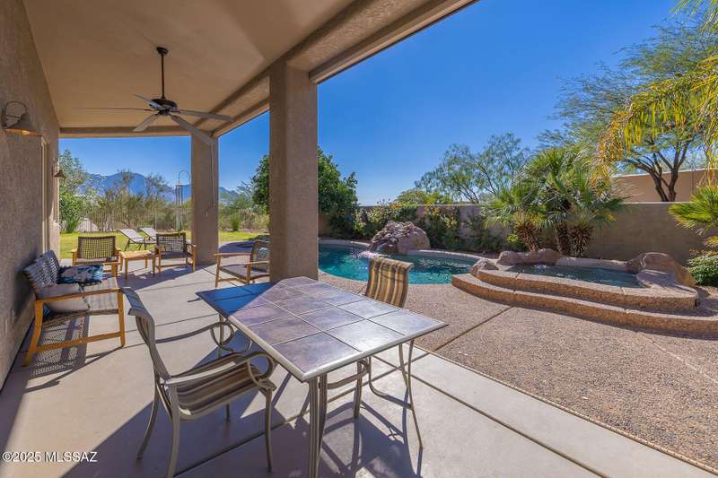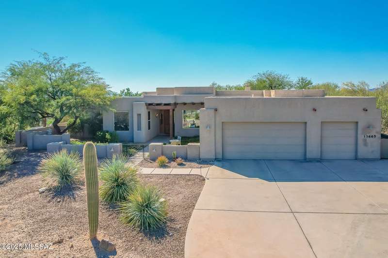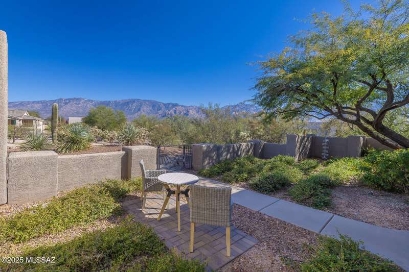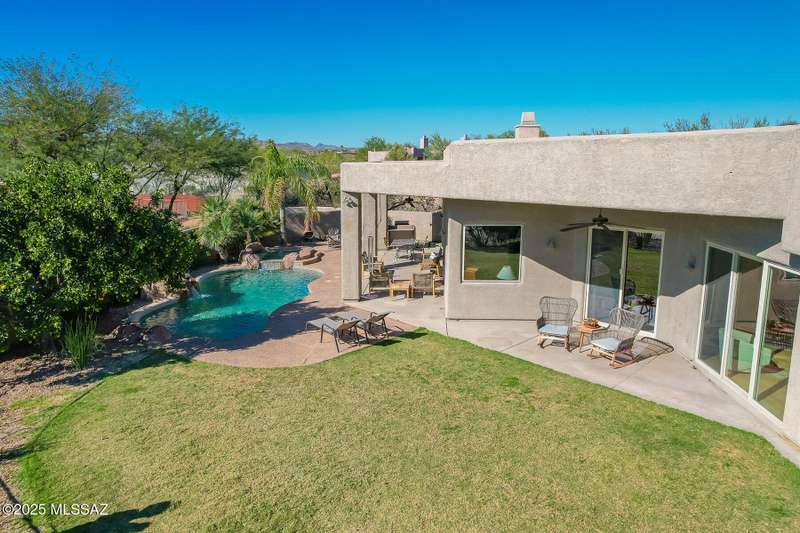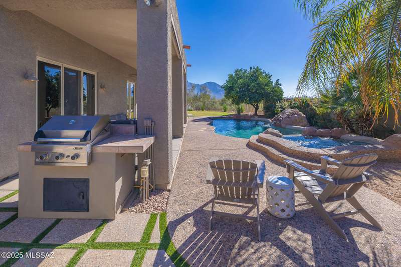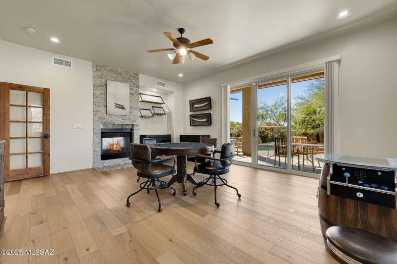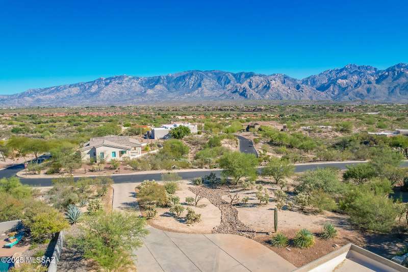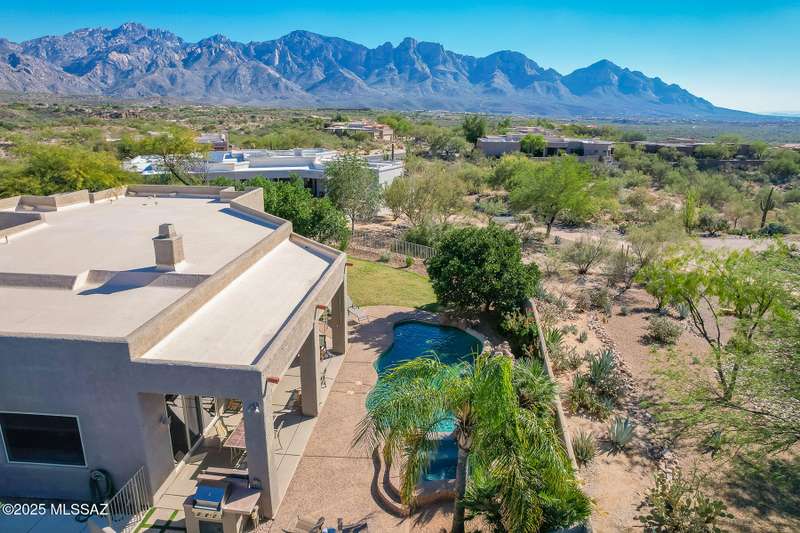 Experience refined desert living in this stunning 4BR/2.5BA custom home in the exclusive gated community of The Estates at High Mesa in Oro Valley. Set on a private 0.65-acre lot surrounded by lush landscape and sweeping mountain views, this 3,175 sq. ft. residence blends luxury and comfort throughout. Enjoy formal living and dining areas, a family room with Viga beams and dual-sided fireplace flows to a versatile bonus room with patio access ideal for entertaining. The chef's kitchen features hickory cabinetry, granite counters, large walk-in pantry, and new state-of-the-art appliances. The owner's suite offers French doors, private patio access, completely remodeled spa-inspired bath with soaking tub, 5-head shower, and spacious walk-in closet. Split floor plan provides privacy