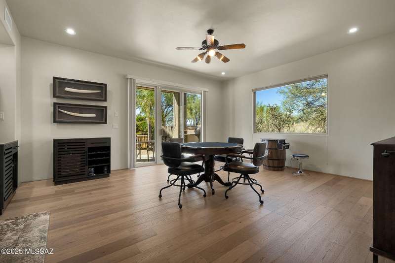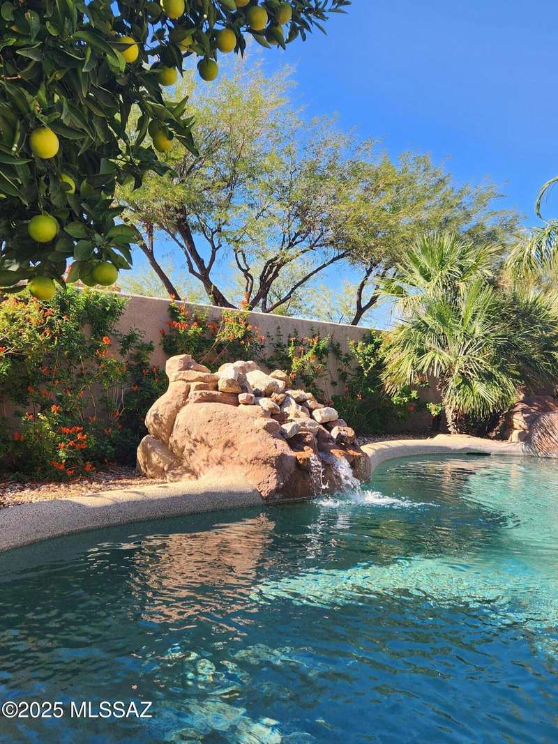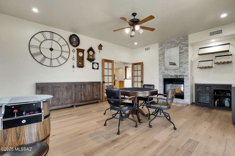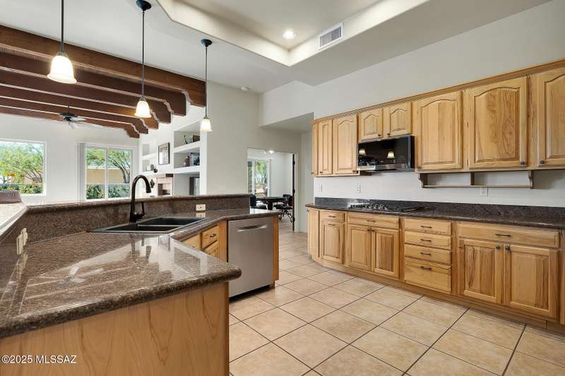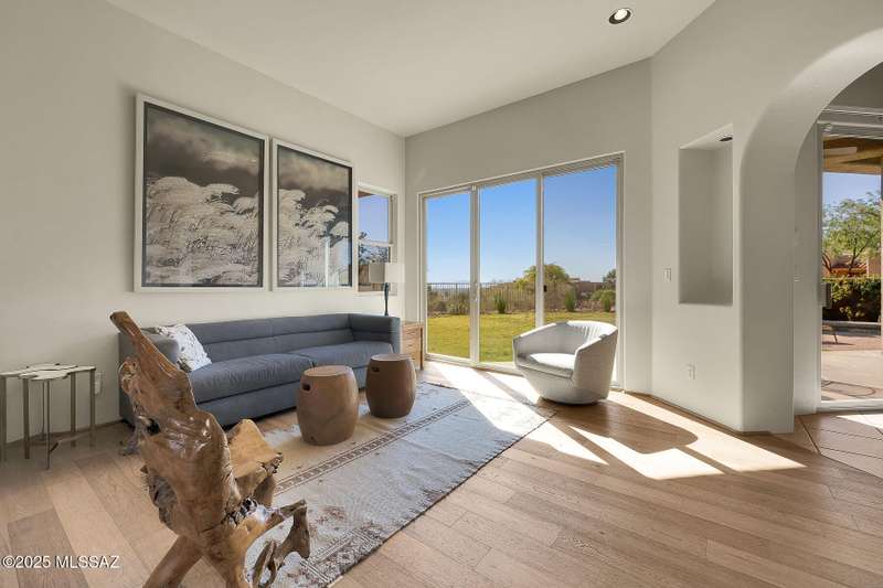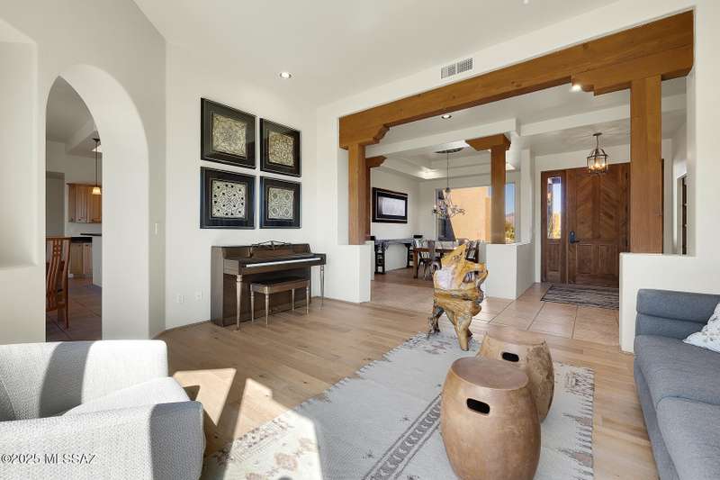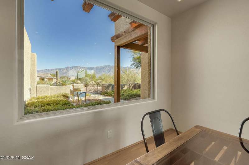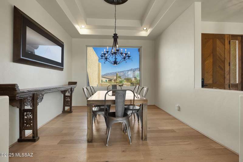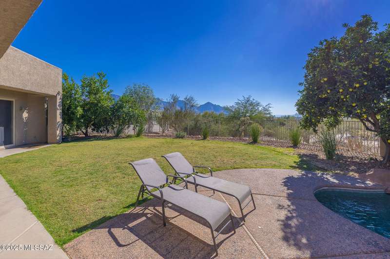 Experience refined desert living in this stunning 4BR/2.5BA custom home in the exclusive gated community of The Estates at High Mesa in Oro Valley. Set on a private 0.65-acre lot surrounded by lush landscape and sweeping mountain views, this 3,175 sq. ft. residence blends luxury and comfort throughout. Enjoy formal living and dining areas, a family room with Viga beams and dual-sided fireplace flows to a versatile bonus room with patio access ideal for entertaining. The chef's kitchen features hickory cabinetry, granite counters, large walk-in pantry, and new state-of-the-art appliances. The owner's suite offers French doors, private patio access, completely remodeled spa-inspired bath with soaking tub, 5-head shower, and spacious walk-in closet. Split floor plan provides privacy