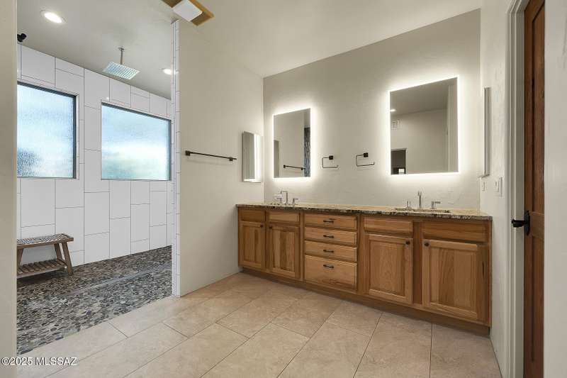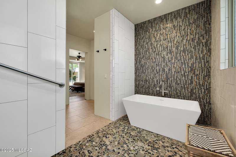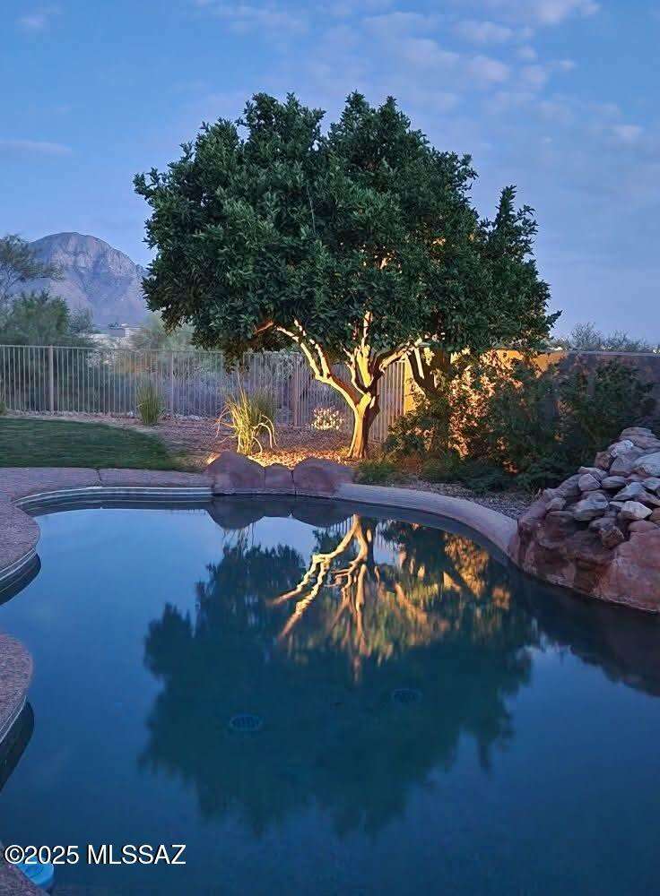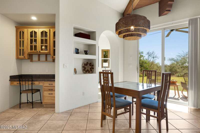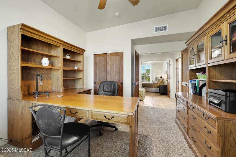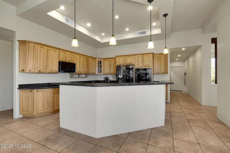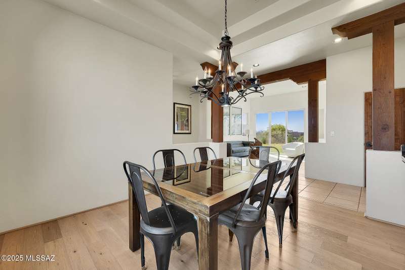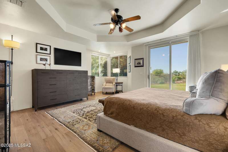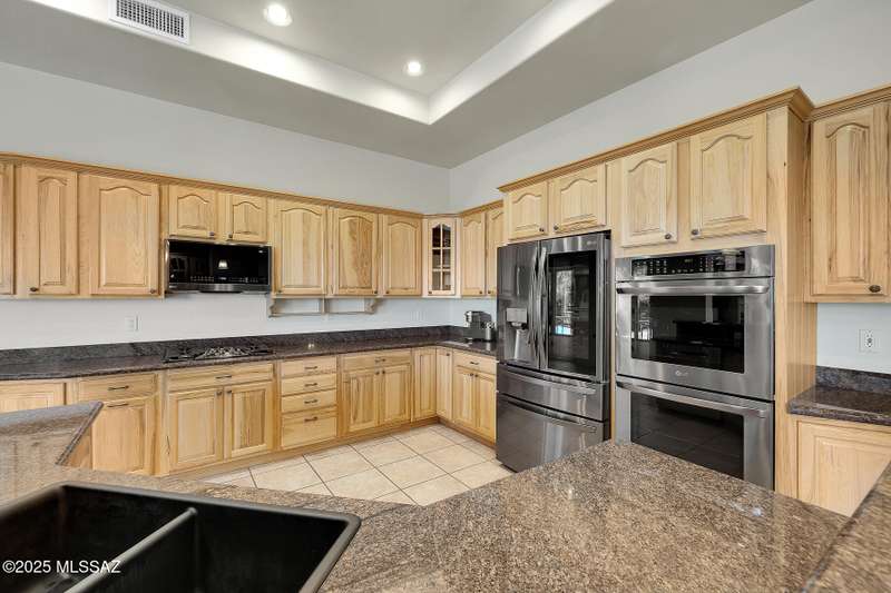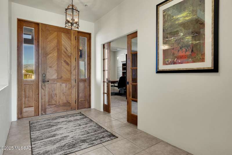 Experience refined desert living in this stunning 4BR/2.5BA custom home in the exclusive gated community of The Estates at High Mesa in Oro Valley. Set on a private 0.65-acre lot surrounded by lush landscape and sweeping mountain views, this 3,175 sq. ft. residence blends luxury and comfort throughout. Enjoy formal living and dining areas, a family room with Viga beams and dual-sided fireplace flows to a versatile bonus room with patio access ideal for entertaining. The chef's kitchen features hickory cabinetry, granite counters, large walk-in pantry, and new state-of-the-art appliances. The owner's suite offers French doors, private patio access, completely remodeled spa-inspired bath with soaking tub, 5-head shower, and spacious walk-in closet. Split floor plan provides privacy