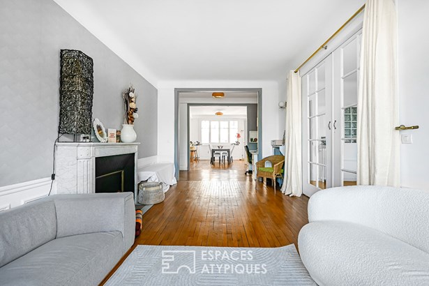 It currently includes a dining room with a beautiful, custom-fitted and equipped kitchen, followed by a living room with an elegant fireplace and a bow window.