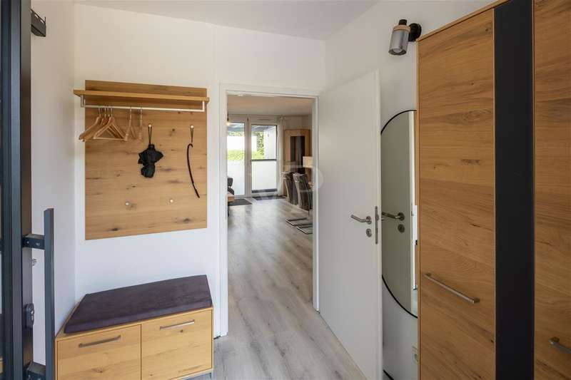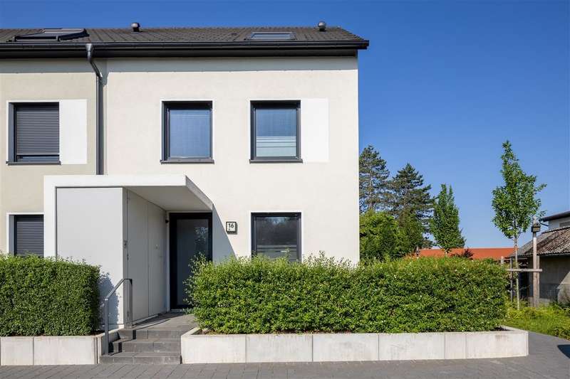 For sale is a modern terraced corner house, which was completed in 2020 in solid KfW 55 construction and is characterized by its energy efficiency (energy class A). With a living space of approx. 119.00 m² on three floors and a plot area of approx. 236 m², this house offers ideal conditions for comfortable living. On the first floor, you will find an open-plan living and dining area with a modern fitted kitchen that includes a high-quality marble worktop and leaves nothing to be desired. Equipped with an induction hob, an extractor fan, an oven, a dishwasher and a fridge-freezer - all Neff appliances - cooking here is a pleasure. The living area is fitted with laminate flooring, which creates a warm atmosphere. The triple-glazed plastic windows with roller shutters offer optimum insulation and privacy. A guest WC completes the space on this level. The underfloor heating in the living area provides cozy warmth. The upper floor comprises two spacious bedrooms with high-quality laminate flooring. The daylight-flooded bathroom has a shower and is lined with vinyl. A utility room completes the space available on this floor. The attic area provides the master bedroom, complemented by a further bathroom with bathtub and two storage rooms, one of which can be used as a dressing room. This well thought-out room layout allows you to create your own individual dream home. The outdoor area offers a terrace with a patio cover, equipped with an awning and a front awning to provide shade in the midday hours. The adjoining green area around the house is easy to maintain and offers space for relaxing hours outdoors. There is also a garage and an additional parking space. Practical additions such as a ventilation system, a rainwater barrel and two lockable garden cupboards round off the offer. LAN cabling in every room ensures that modern communication and entertainment technology can be easily installed. This as-new home offers you and your family a high quality of life in a contemporary environment. Arrange a viewing appointment to see the benefits of the property for yourself.
