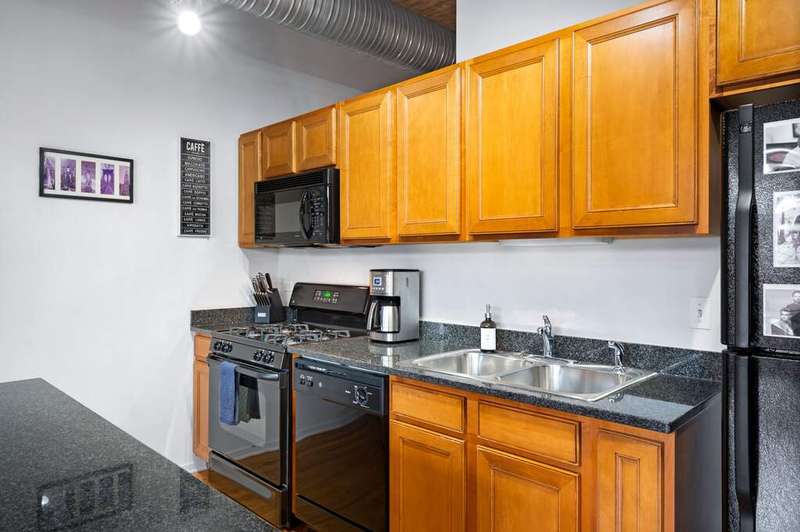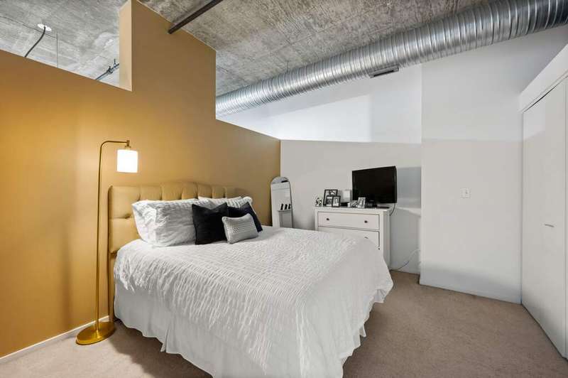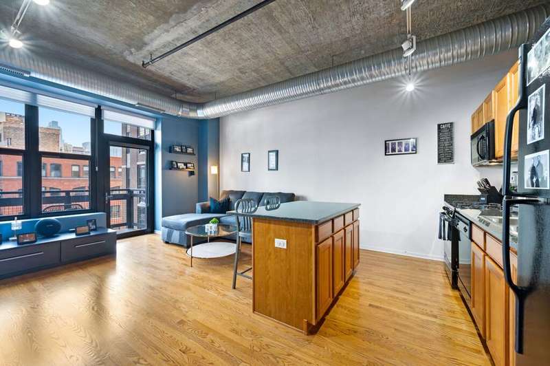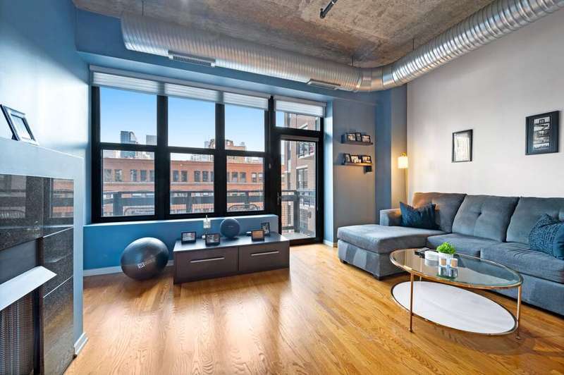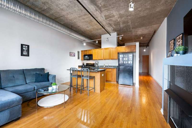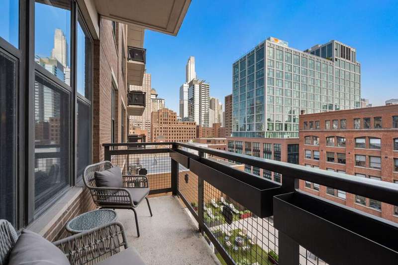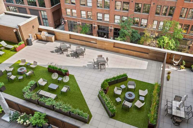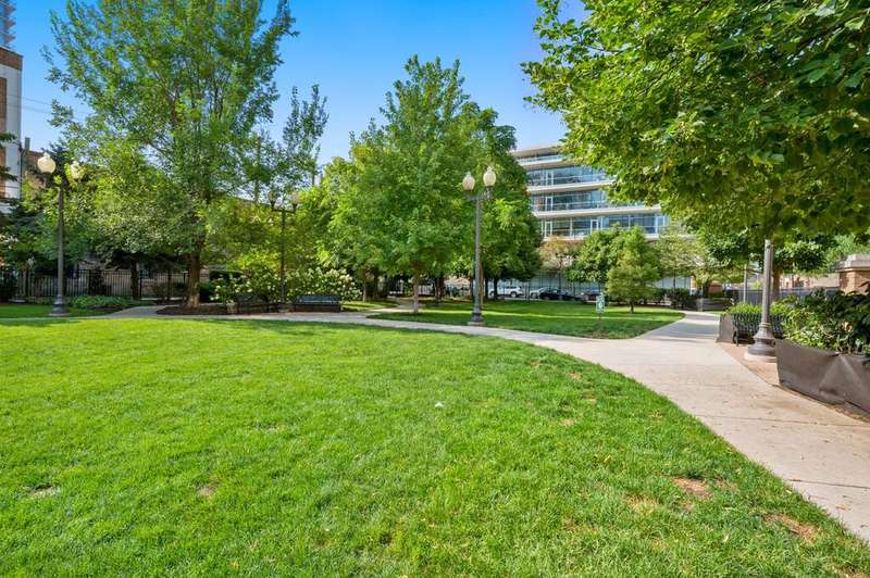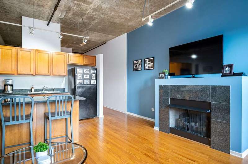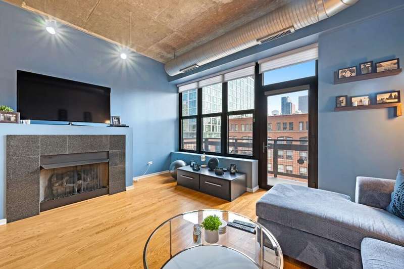 Bright South facing unit at the popular Parc Chestnut building with deeded parking included! This large 1 bed loft features tall ceilings, in unit washer/dryer, blond wood Oak floors, cozy gas fireplace and Hunter Douglas window treatments. The large wall of windows and patio door lead out to a private balcony with city views and overlooks one of the building's amazing terraces recently updated with lounge areas, fire pits, grills and lush landscaping. Kitchen features nice storage, granite counters and breakfast bar island. Along with the new common terraces, the building has recently updated the common hallways and boasts 24 hour doorstaff, maintenance, on-site manager, fitness room, office work space, party/game room, bike storage, Tide laundry service and receiving room. Additional storage cage as well as an indoor deeded garage space (with shared EV hookup) is included in the price! Pet friendly building up to 80 pounds, no special assessments and 2M in reserves. Across the street is a beautiful dog friendly park and perfect peaceful place to enjoy nature in the middle of the city. This location is at the crossroads of River North, Near North and Old Town and just a block to the brown line, quick commute to the expressway and short walk to shops and restaurants.
