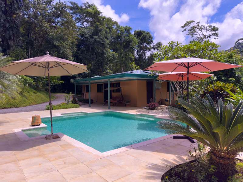 Swimming pool with patio, umbrellas, and swing overlooking lush scenery