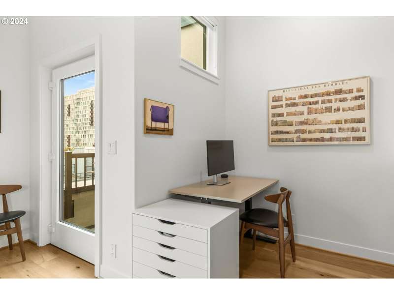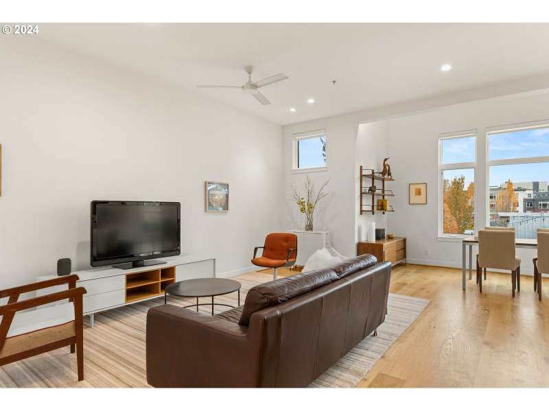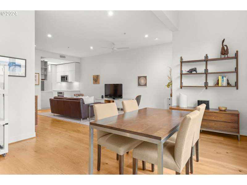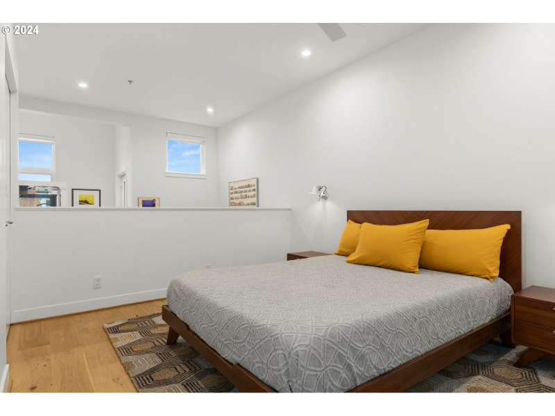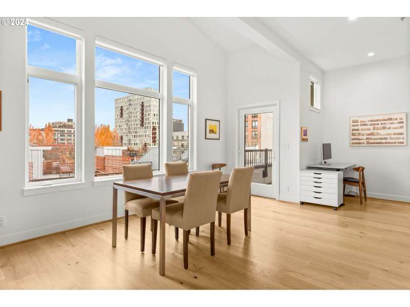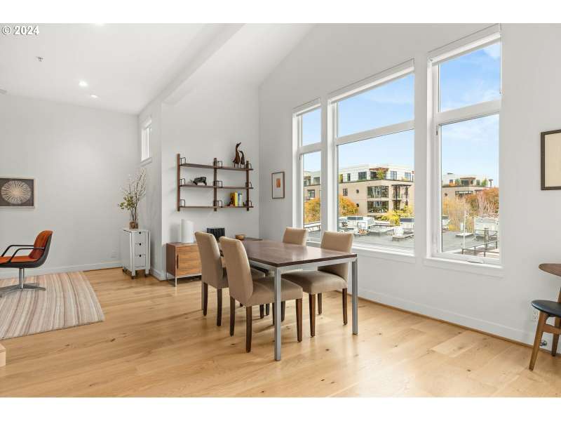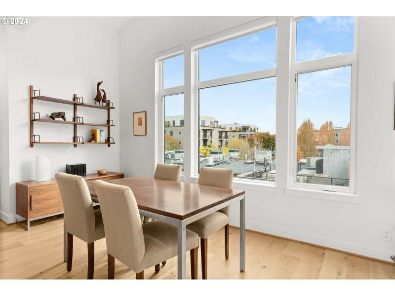 Stunning high-end updates highlight this Pearl District residence – wire brushed French oak floors, PEDINI kitchen cabinets, quartz counters, Bosch high-efficiency appliances with induction cooktop, skim-coated smooth walls, Ann Sacks tile floor, custom smart lighting, auto-shades, and custom California Closets. Wonderful natural light and unobstructed east facing view from this top-floor unit. Comfortable 1,015 sq ft floor plan with nook area for work space. Step out to the deck and enjoy the sun with your morning coffee. The eastside units enjoy quieter living with the building's private driveway below instead of a city street. Furnace & A/C new in 2017, Speed Queen W/D. A remarkable $4.5M exterior redesign of Hoyt Commons was completed in 2022 - the transformed building features new siding, windows, doors, deck surface & railings. Walk to shopping, dining and parks. Includes a secure parking space and storage. Don't miss this beautiful home!