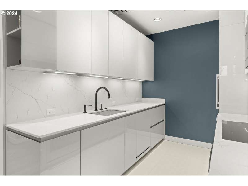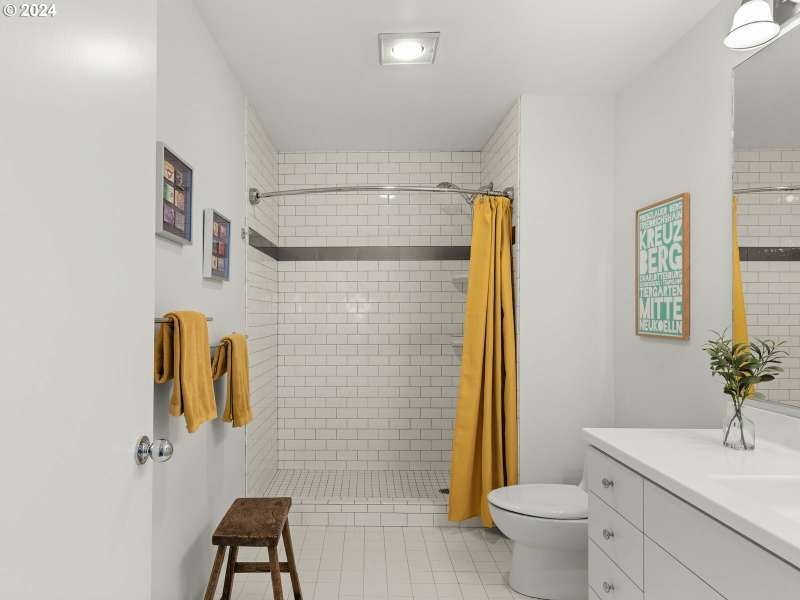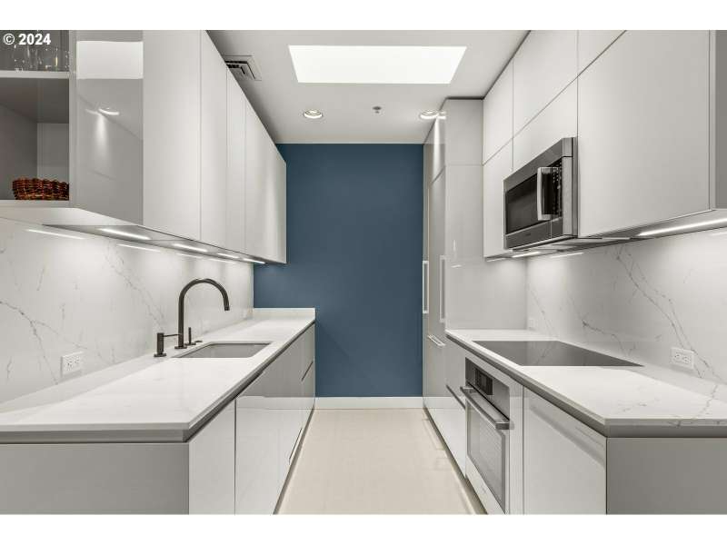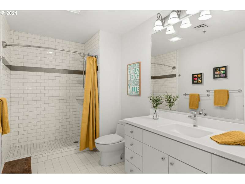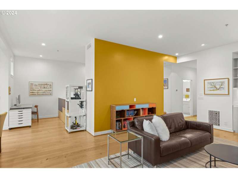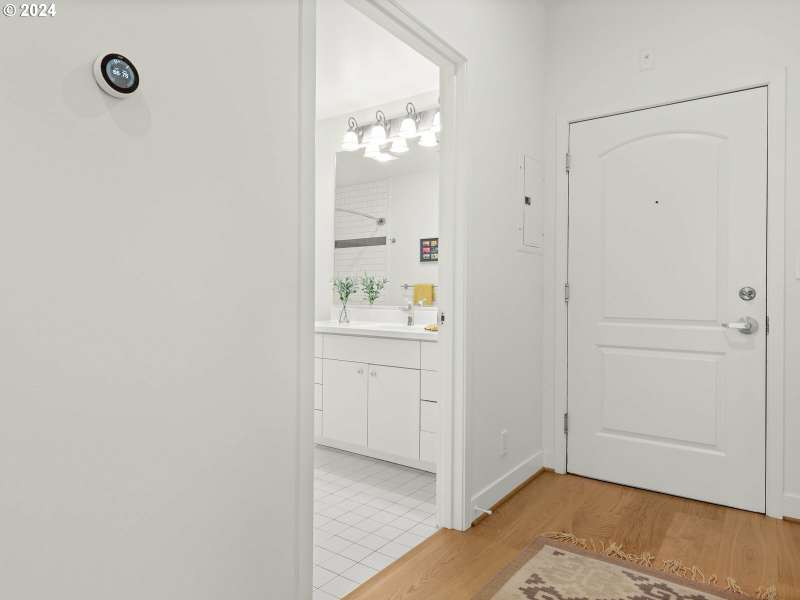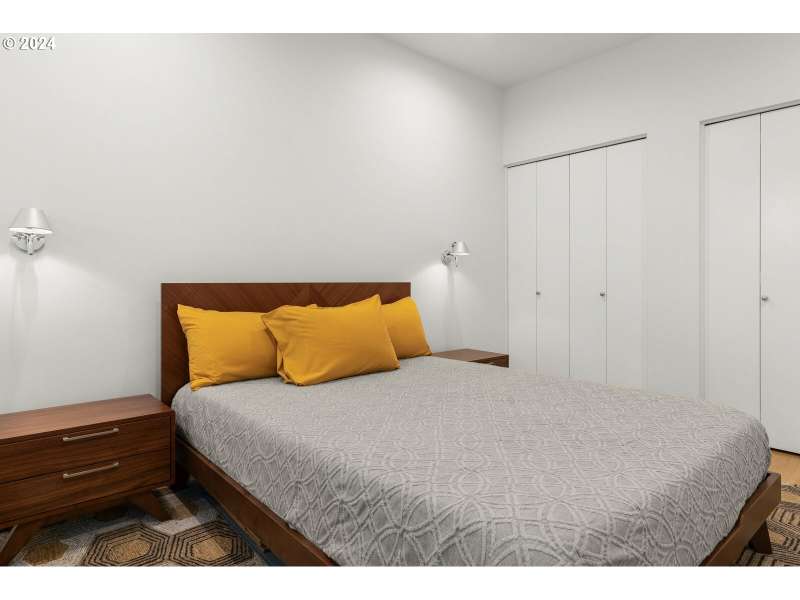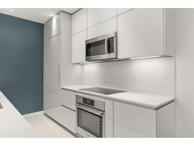 Stunning high-end updates highlight this Pearl District residence – wire brushed French oak floors, PEDINI kitchen cabinets, quartz counters, Bosch high-efficiency appliances with induction cooktop, skim-coated smooth walls, Ann Sacks tile floor, custom smart lighting, auto-shades, and custom California Closets. Wonderful natural light and unobstructed east facing view from this top-floor unit. Comfortable 1,015 sq ft floor plan with nook area for work space. Step out to the deck and enjoy the sun with your morning coffee. The eastside units enjoy quieter living with the building's private driveway below instead of a city street. Furnace & A/C new in 2017, Speed Queen W/D. A remarkable $4.5M exterior redesign of Hoyt Commons was completed in 2022 - the transformed building features new siding, windows, doors, deck surface & railings. Walk to shopping, dining and parks. Includes a secure parking space and storage. Don't miss this beautiful home!