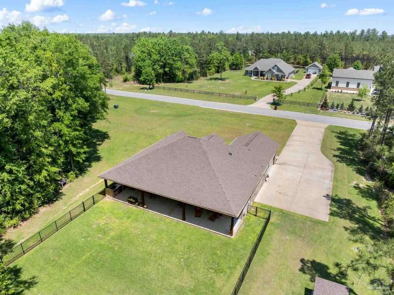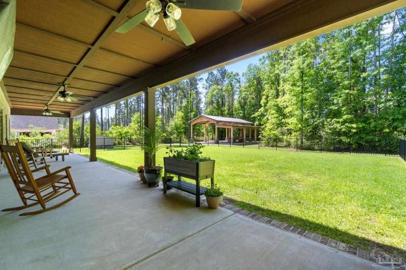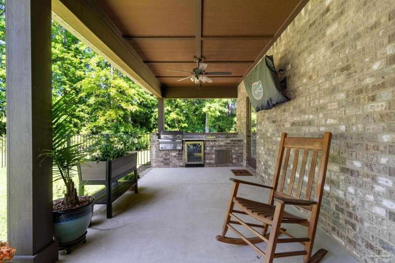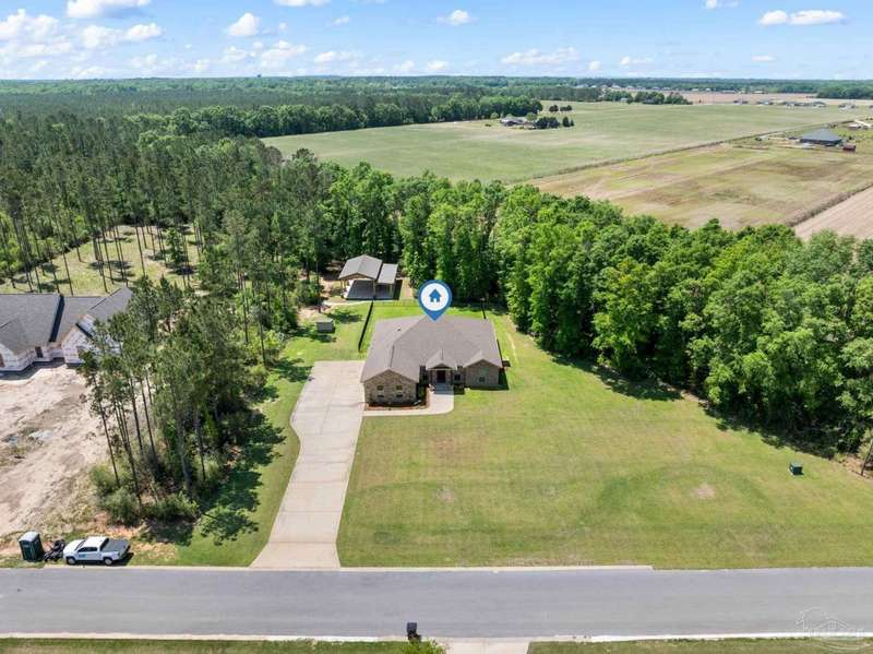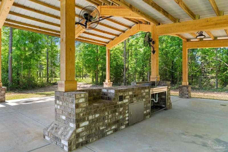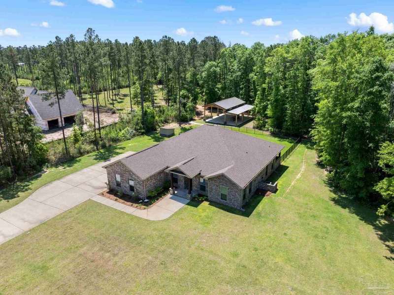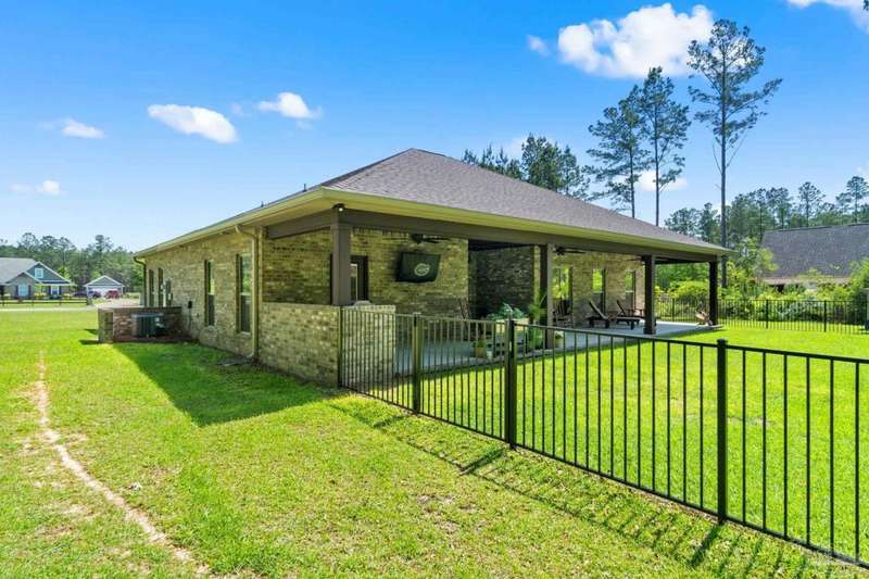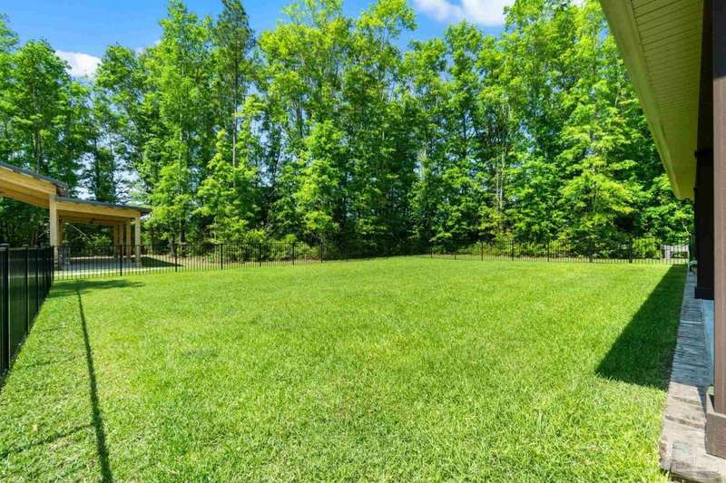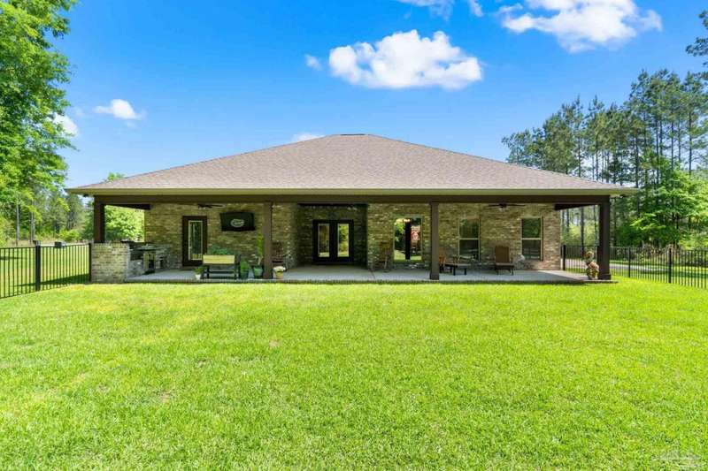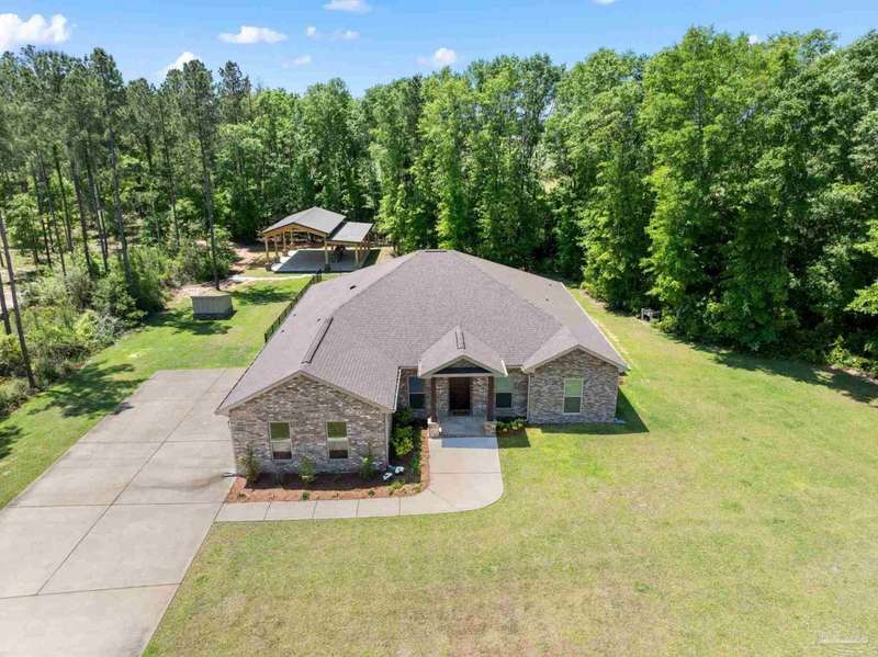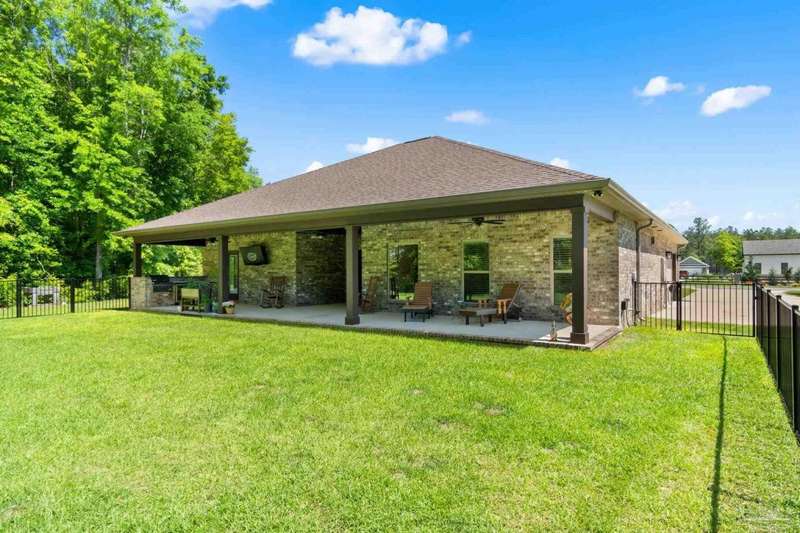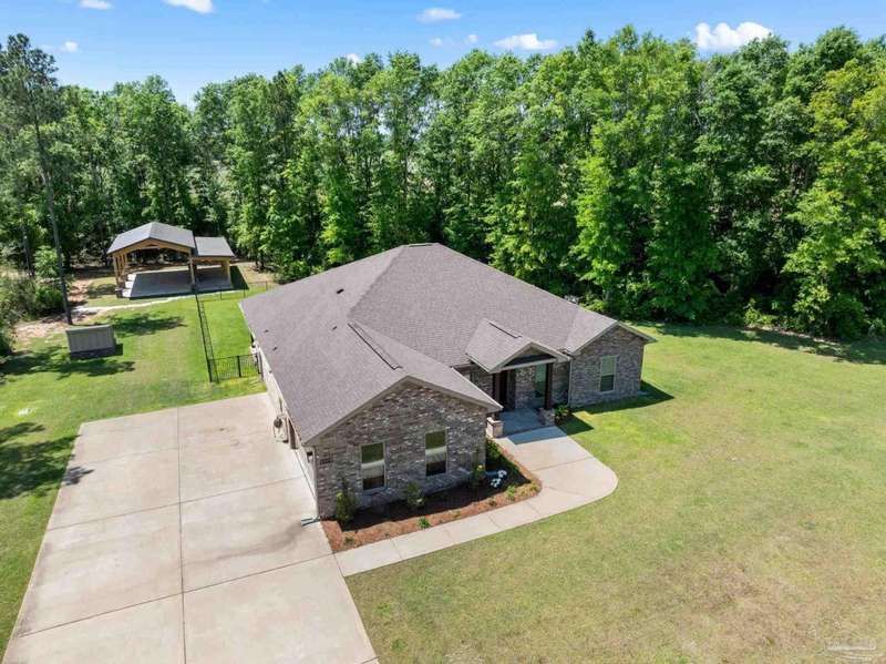 Located in a the beautiful gated Sage neighborhood in Chumuckla, FL. This 3 Bedroom and 3 Bath home consisting of 1995 sq.ft. home is perfectly situated on 2.2 acres. No detail was left out on this 2022 built home. Along with 3 bedrooms, there is also two flex rooms that can be used for an office, exercise room, or playroom. The kitchen offers a propane stove and a chef's side by side fridge/freezer. The master bath has a jetted garden tub and stand-alone custom tile shower. There is a large spacious back porch that runs the length of the home, offering a complete outdoor bricked kitchen with a built in pellet grill, burner, and sink. The home has been wired for a generator plug in system and also has a propane instant hot water heater. The backyard is fenced with black decorative fencing, for the dogs and future pool area. The entire yard has a sprinkler system which is fed by a water well. At the back of the driveway there is a 30x30 Pole barn with a secondary outdoor cooking area. Nestled in a country setting, but minutes away from Pace, this home is must see!