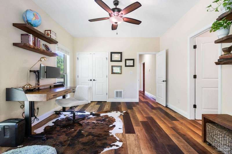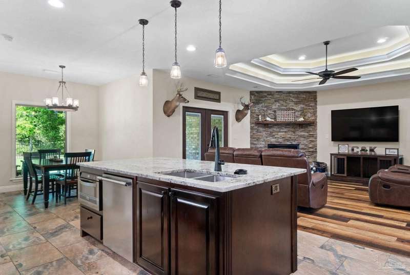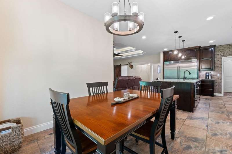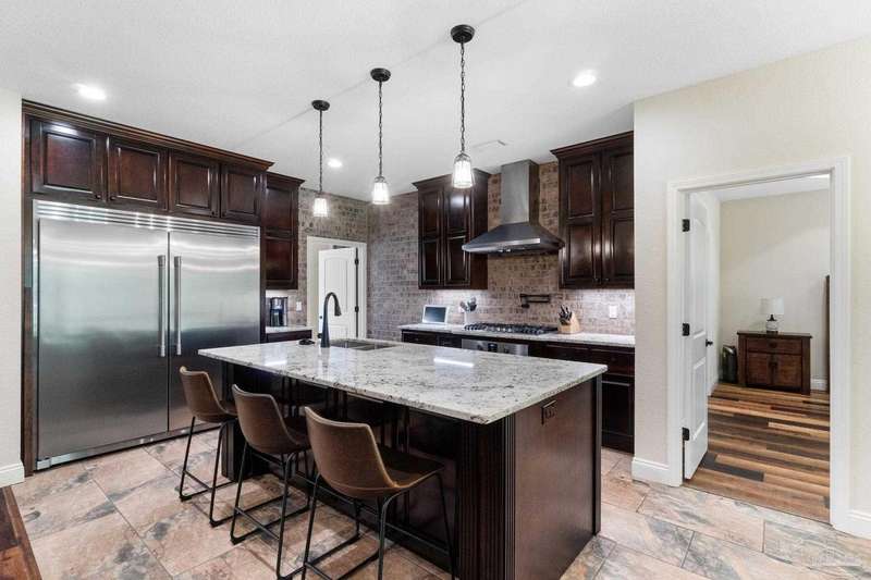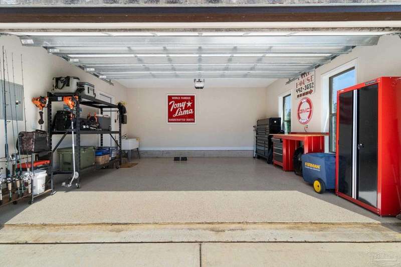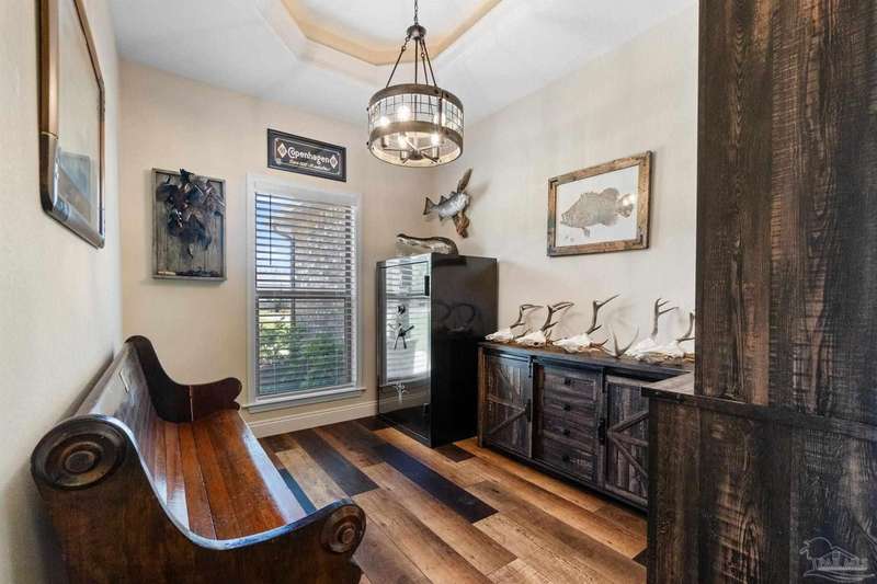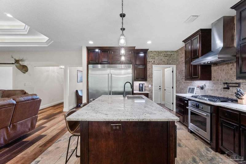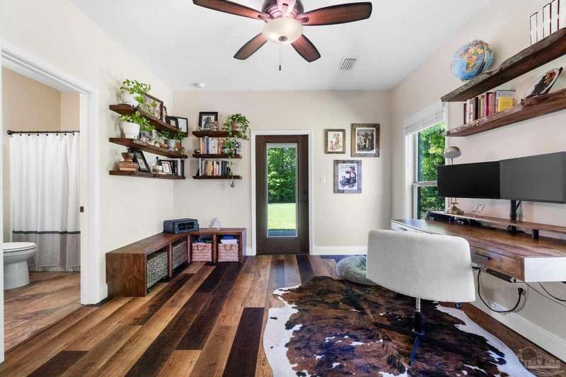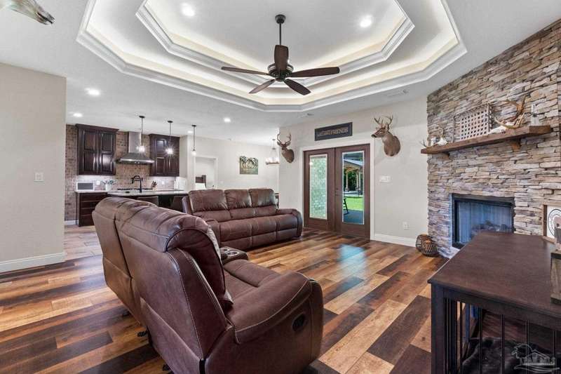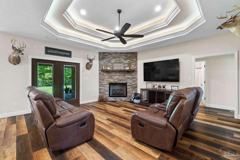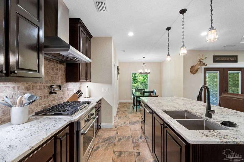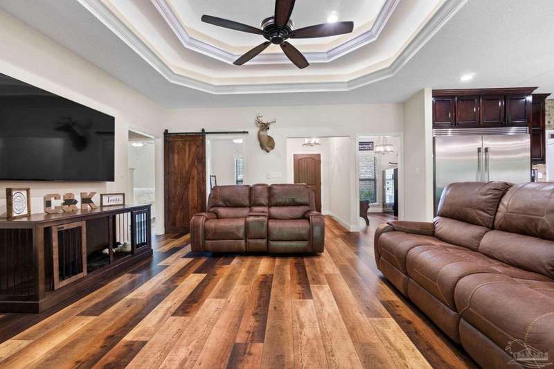Located in a the beautiful gated Sage neighborhood in Chumuckla, FL. This 3 Bedroom and 3 Bath home consisting of 1995 sq.ft. home is perfectly situated on 2.2 acres. No detail was left out on this 2022 built home. Along with 3 bedrooms, there is also two flex rooms that can be used for an office, exercise room, or playroom. The kitchen offers a propane stove and a chef's side by side fridge/freezer. The master bath has a jetted garden tub and stand-alone custom tile shower. There is a large spacious back porch that runs the length of the home, offering a complete outdoor bricked kitchen with a built in pellet grill, burner, and sink. The home has been wired for a generator plug in system and also has a propane instant hot water heater. The backyard is fenced with black decorative fencing, for the dogs and future pool area. The entire yard has a sprinkler system which is fed by a water well. At the back of the driveway there is a 30x30 Pole barn with a secondary outdoor cooking area. Nestled in a country setting, but minutes away from Pace, this home is must see!
