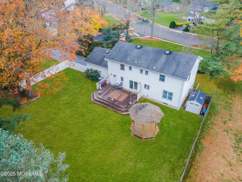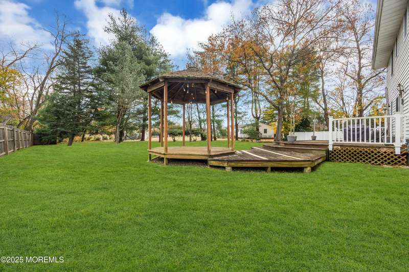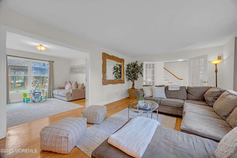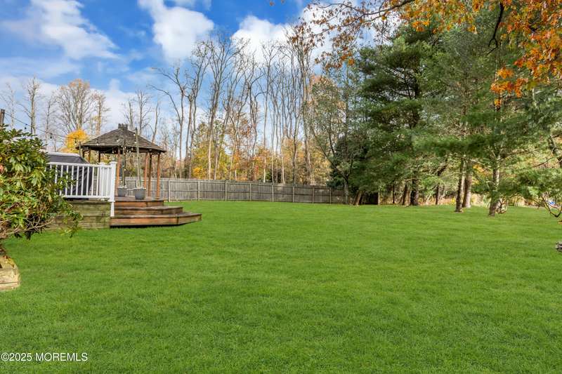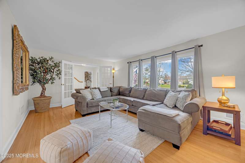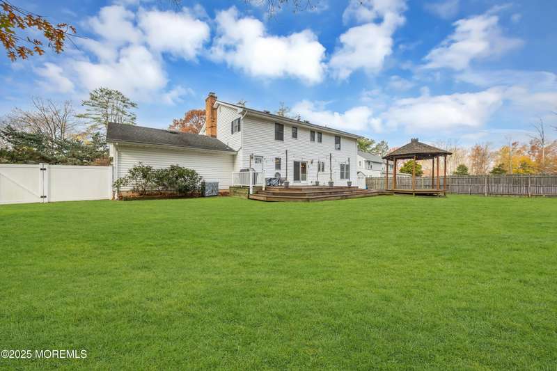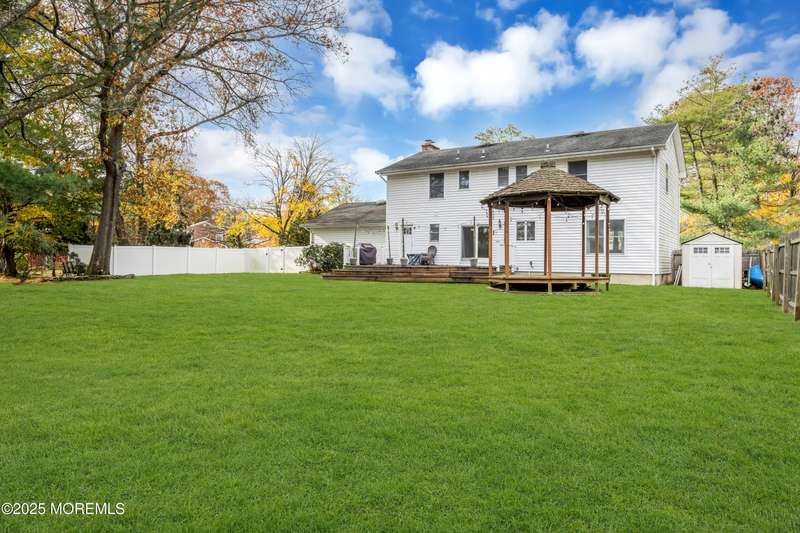 Set in a classic tree-lined neighborhood, this freshly painted 4-bedroom, 2.5-bath home sits proudly on a beautiful corner lot close to everything Eatontown has to offer. Shopping, dining, and entertainment are just a short distance away. Inside, you'll find inviting French doors, gleaming hardwood floors, and wide plank wood flooring in the dining room, perfect for gatherings. The upgraded eat-in kitchen features rich wood cabinetry, stainless steel appliances, and a functional layout that opens seamlessly to the living and family rooms. The first floor also includes a welcoming entryway, powder room, mudroom, and multiple flexible living spaces for entertaining or everyday comfort. Upstairs, four generous bedrooms provide plenty of space for everyone, including a relaxing primary suite with a walk-in closet and spacious bath. A finished basement adds versatility for a playroom, gym, or home office, while convenient laundry options are available on the first floor. Step outside to your oversized backyard, an entertainer's dream, with a two-tier deck, charming gazebo, and plenty of room to garden, grill, or simply unwind. Additional highlights include an attic fan, sprinkler system, newer washer and dryer, direct entry oversized two car garage, and fresh paint throughout much of the home. Located near area beaches, major highways, the exciting new Monmouth Mall redevelopment, and the "Hollywood East" Netflix production studios at Fort Monmouth, this property offers the ideal blend of comfort, style, and convenience in one of Eatontown's most desirable neighborhoods.