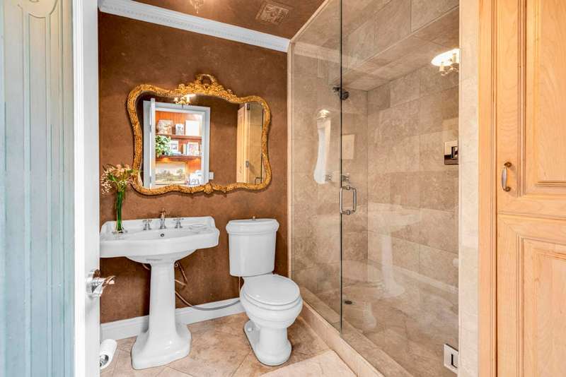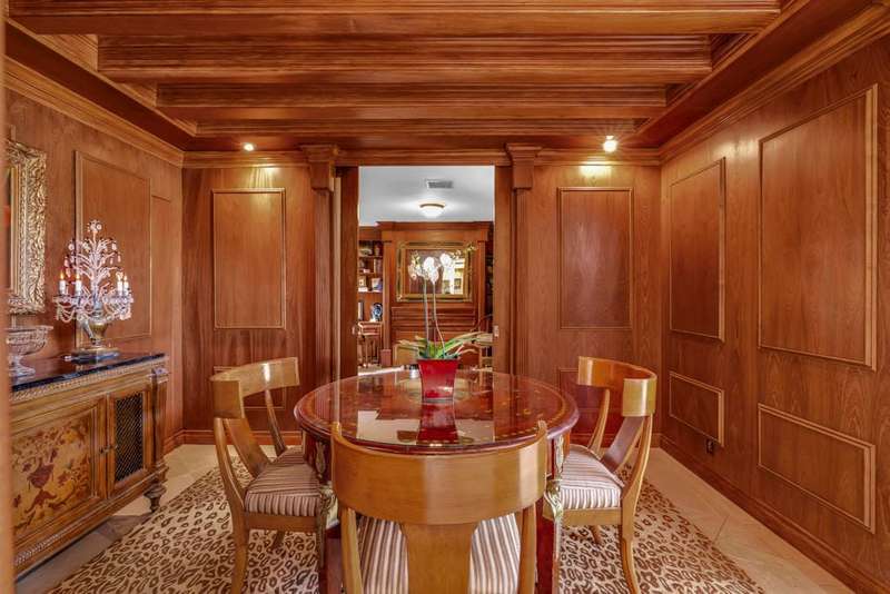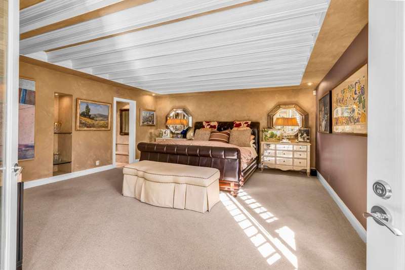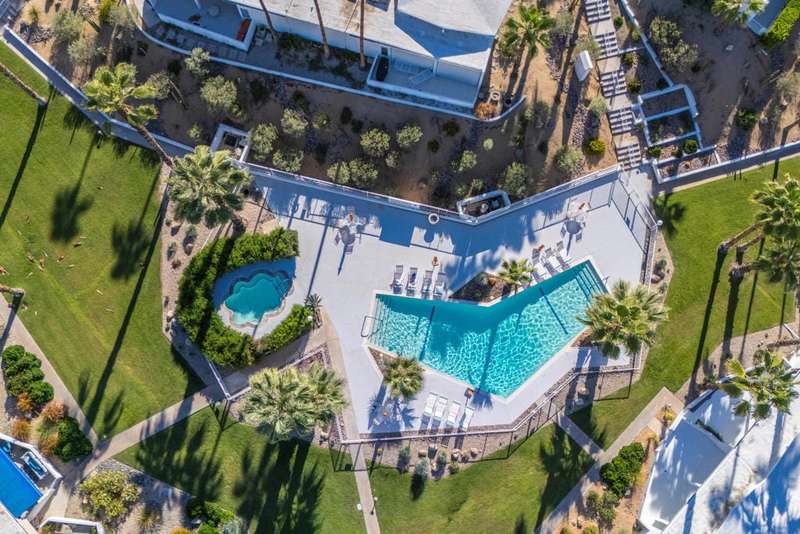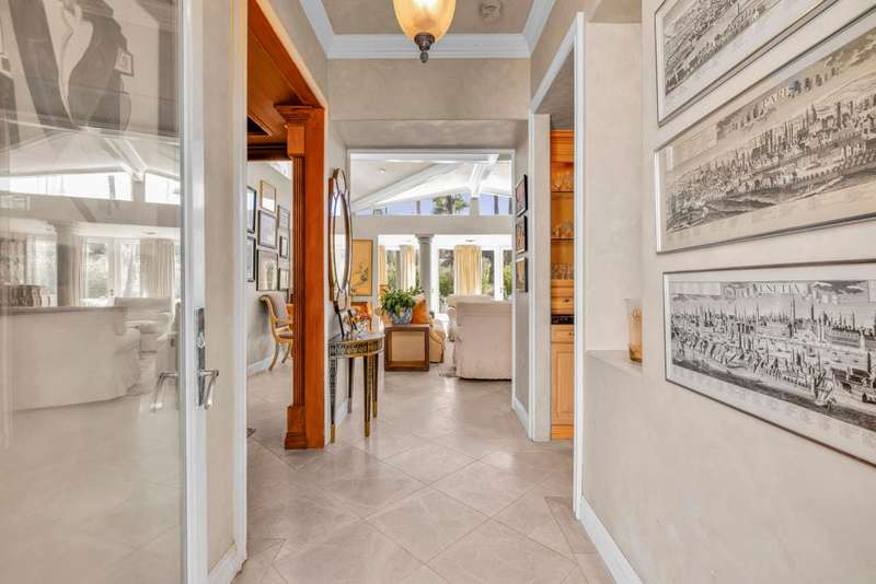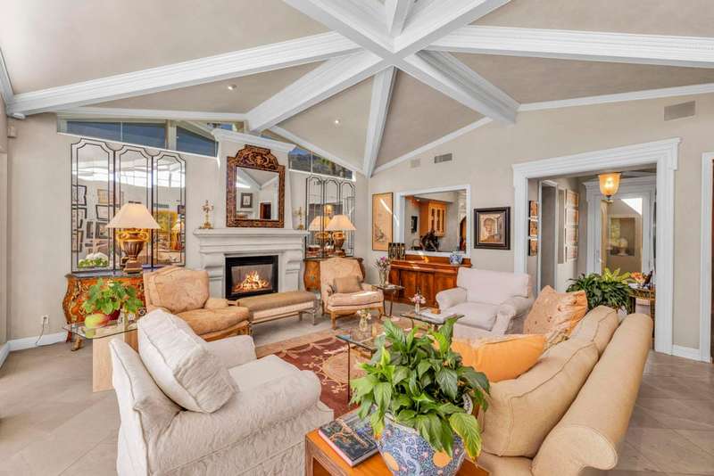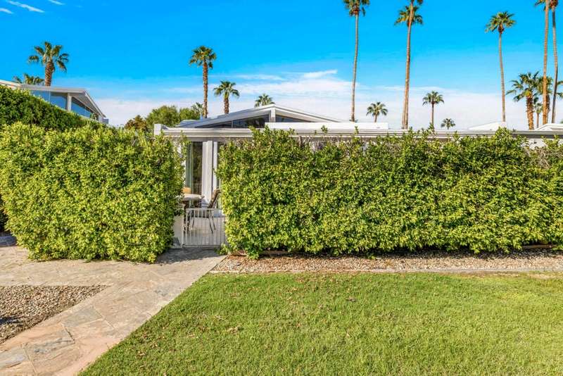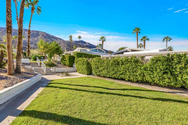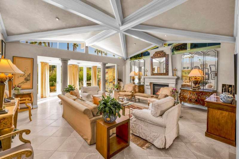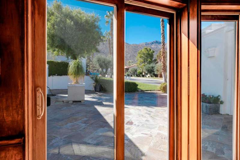 Where Mid-Century Modern meets Neoclassical design. This remarkable residence, located in the sought-after Canyon View Estates of South Palm Springs, is truly one-of-a-kind. Originally designed by famed architect William Krisel, the home features his iconic pop-up umbrella rooflines and clerestory windows, both hallmarks of a visionary who helped shape the Palm Springs modernist movement.The interiors showcase a stunning expression of neoclassical elegance. Hand-cut French limestone floors, laid on the diagonal from front to back, anchor the living spaces. Dramatic Mahogany beamed ceilings finished with gold leaf. Custom millwork includes raised and recessed matching-grain mahogany paneling in the dining room and second bedroom/den, walnut paneling in the third bedroom, and boxed-hinged cabinetry in the kitchen. The primary bathroom is appointed with filled travertine tile with black onyx inserts, and granite counters. Hidden doors and moving bookshelves create secret passageways, blending architectural surprise with function. The second bedroom is used as a den with a Murphy bed. The house has a newer hot water heater (2023) and a recoated roof (2025).Designed for both style and comfort, the residence offers an easy flow between living, dining, and entertaining areas, enhanced by abundant natural light. Canyon View Estates provides a serene desert setting with mountain views, community pools, and the architectural pedigree that has made the neighborhood one of Palm Springs' most celebrated. The community was recently used as the location for the feature film Don't Worry Darling.