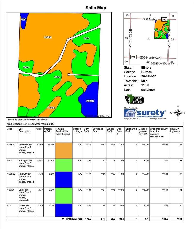 Illinois Farm and Rec Land is proud to present this exceptional Bureau County tillable farm, located just 2.5 miles east of Bradford. This 121± acre property features 116+- acres of highly productive soils with a strong Productivity Index (PI) of 132, making it an outstanding addition to any farming operation or investment portfolio. Recent soil tests reflect excellent fertility, and results are available upon request. The farm will be offered with open tenancy for the 2026 crop season, providing flexibility for new ownership. An adjoining wind turbine, currently owned by the seller, is also available and can be included for interested buyers—presenting an additional income opportunity. Don't miss this chance to own a high-performing Bureau County farm with great long-term potential.