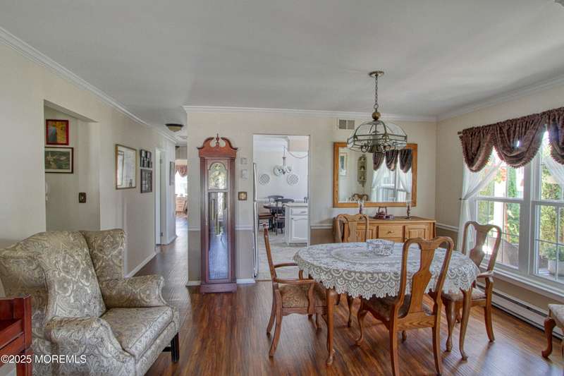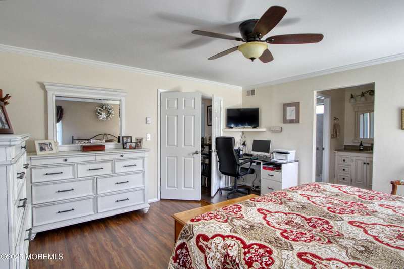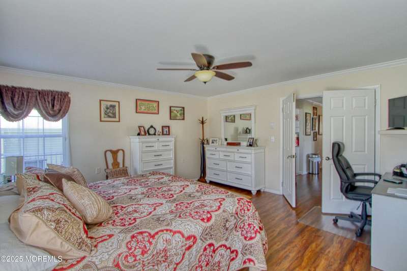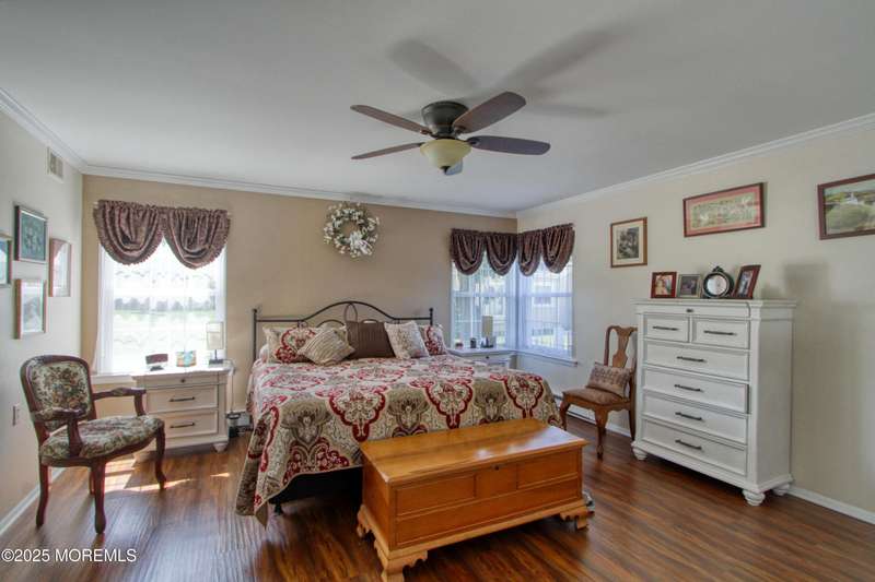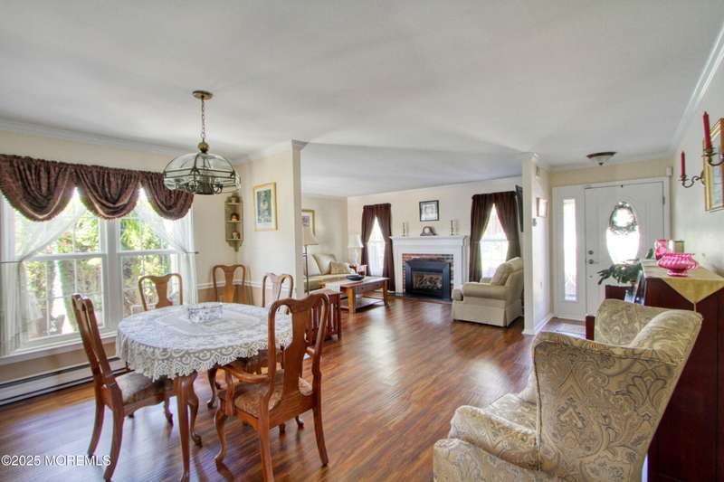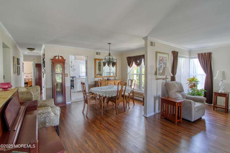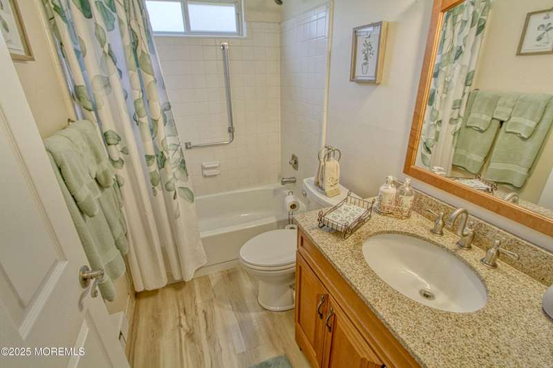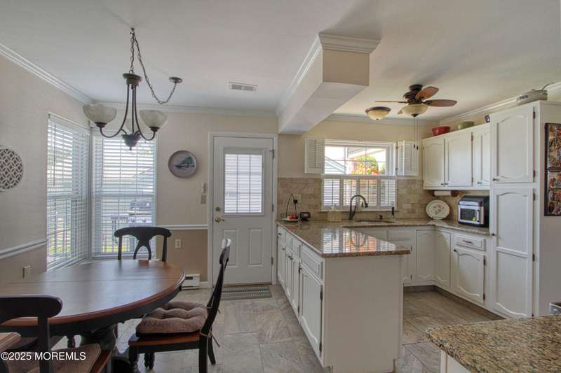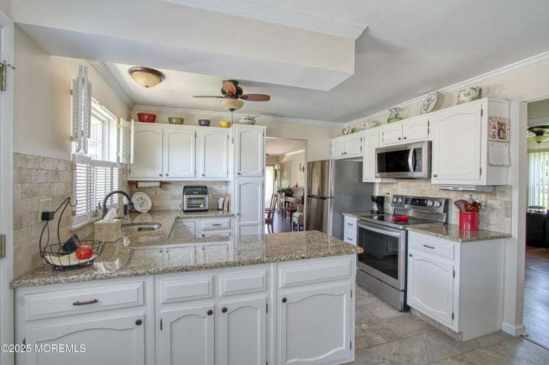 Beautiful Westport model home with gas heat. 2 roomy bedrooms, main bedroom with full bath and walk in closet and French doors. Waterproof Vinyl wide plank flooring. Crown Molding through out the house and chair railings. 2nd bedroom with ceiling fan and a desk nook along side of the closet. Whole house has recently painted, driveway repaved 2025 with Pavers on both sides going to the front open porch. Generous size living room with gas fireplace. Eat-in kitchen all remodeled and gorgeous with granite counter tops with Stone Backsplash. side door goes out to the patio to the right and to your left a Trex deck with a Sunsetter w/remote. Professional Landscaping, Double wide driveway. 30 year roof replaced 2014. Motion detectors back door and garage This house is turn key! Move right in...
