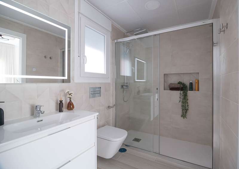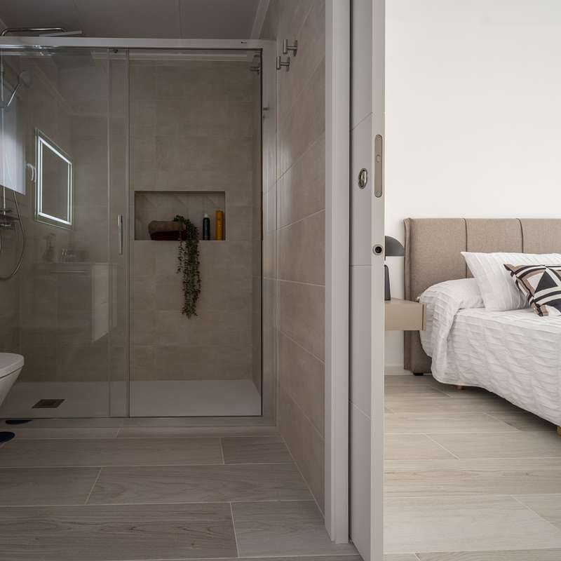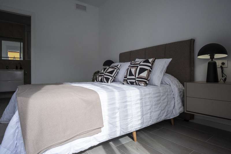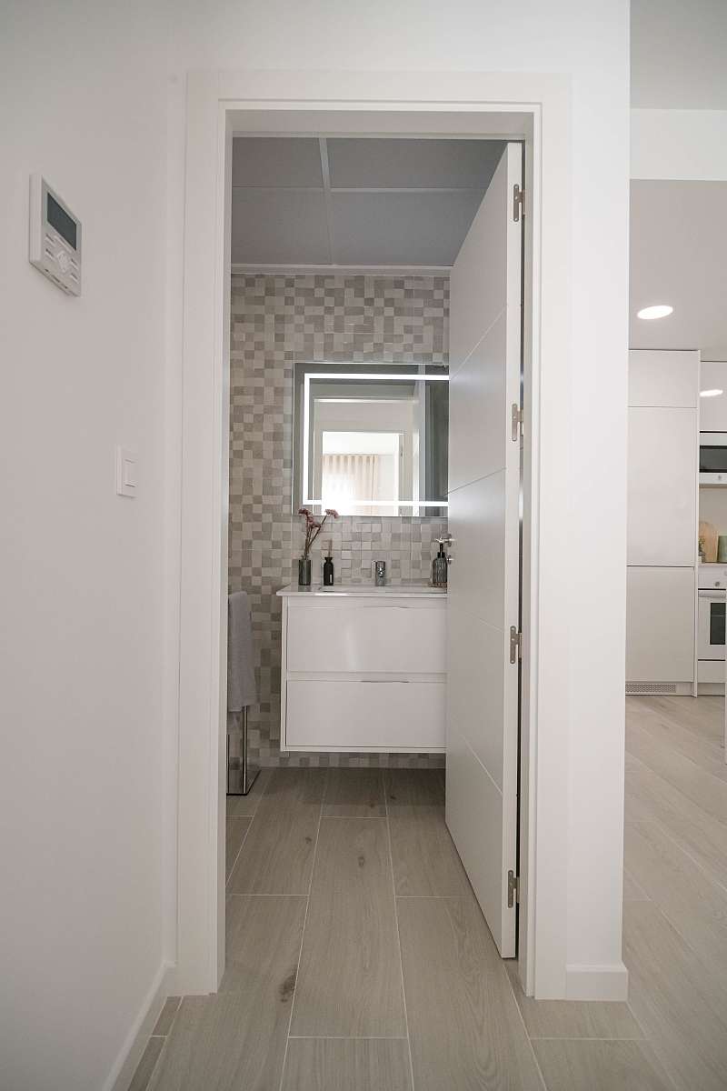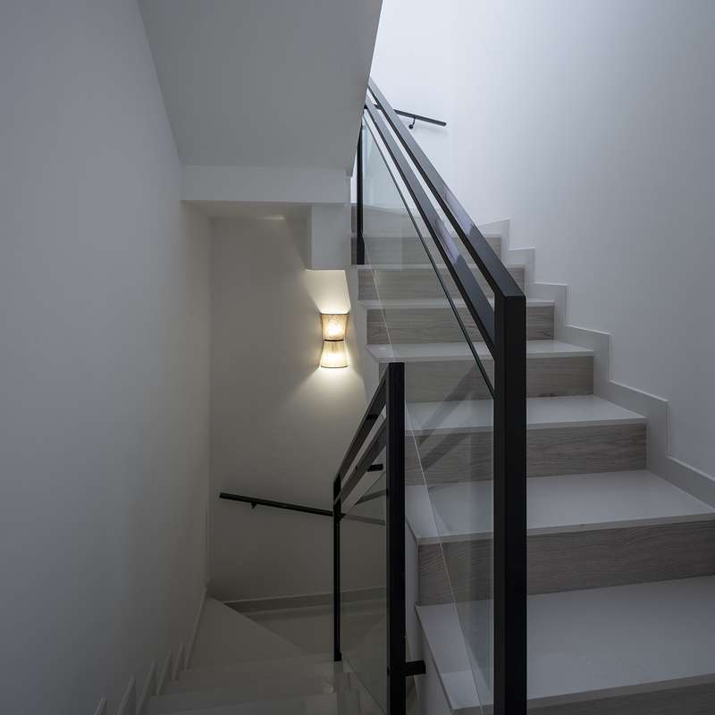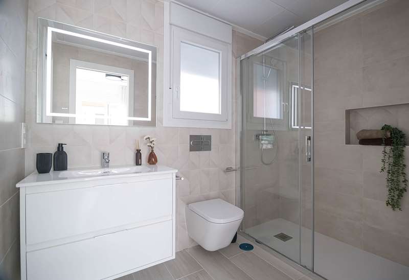Inside, the contemporary townhouses boast luxurious details, including anti-slip porcelain stoneware tiles, glossy lacquered cabinets, blue-motion drawers, and exquisite quartz and Silestone countertops. LED spotlights adorn the kitchen, living room, hallway, and bathrooms, creating a warm and inviting ambiance. Furthermore, wall-integrated LED spotlights accentuate the beauty of the garden and solarium.