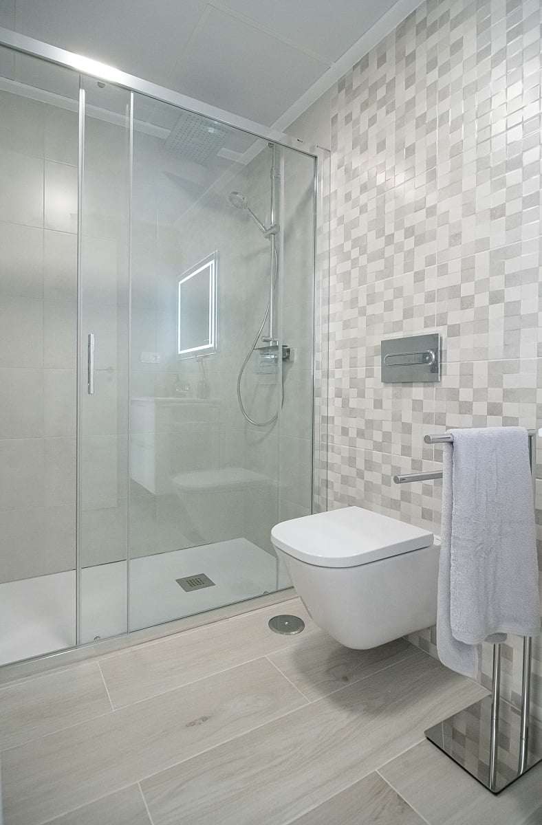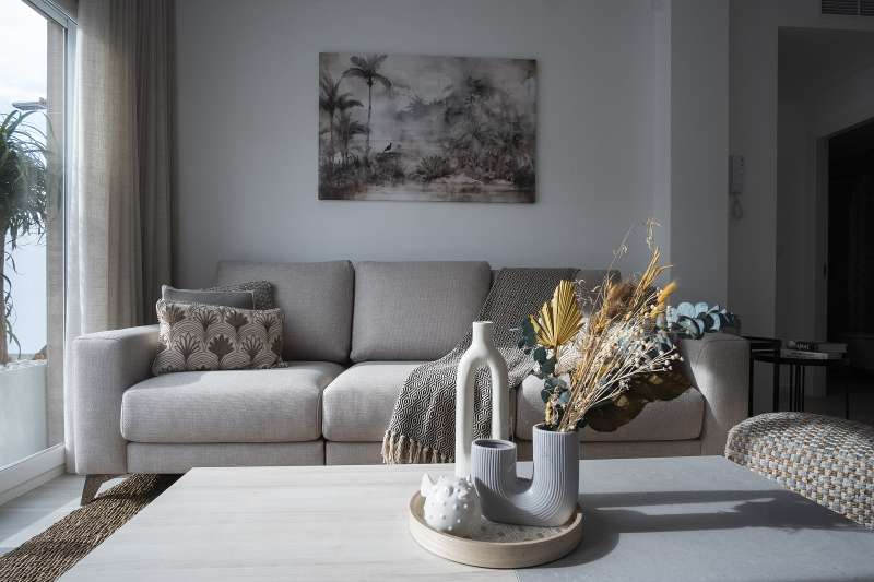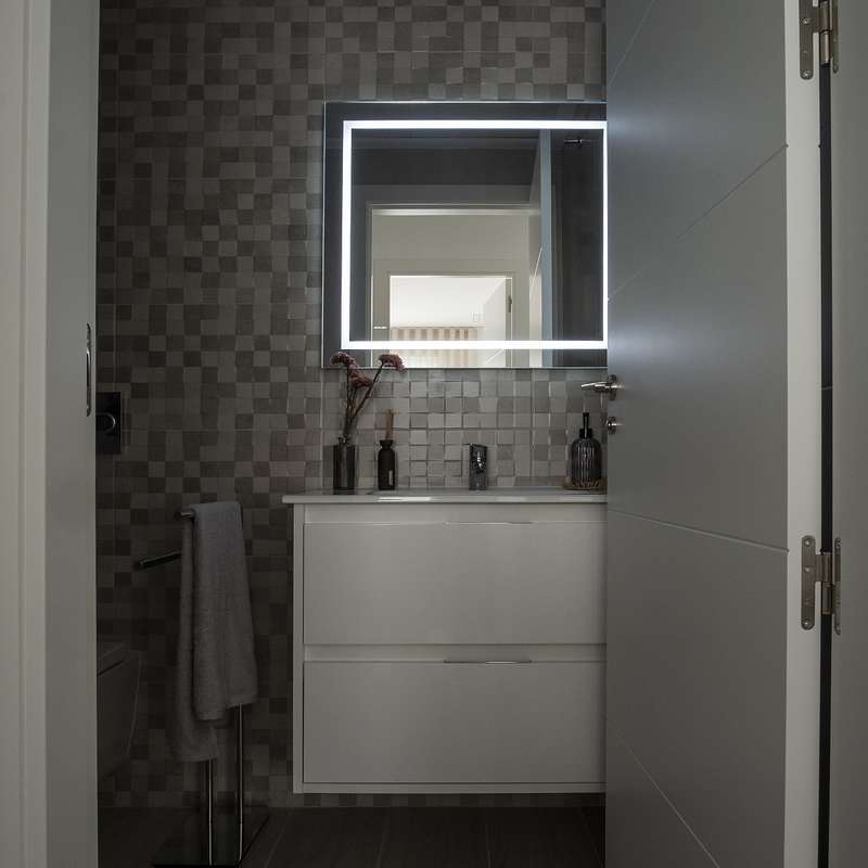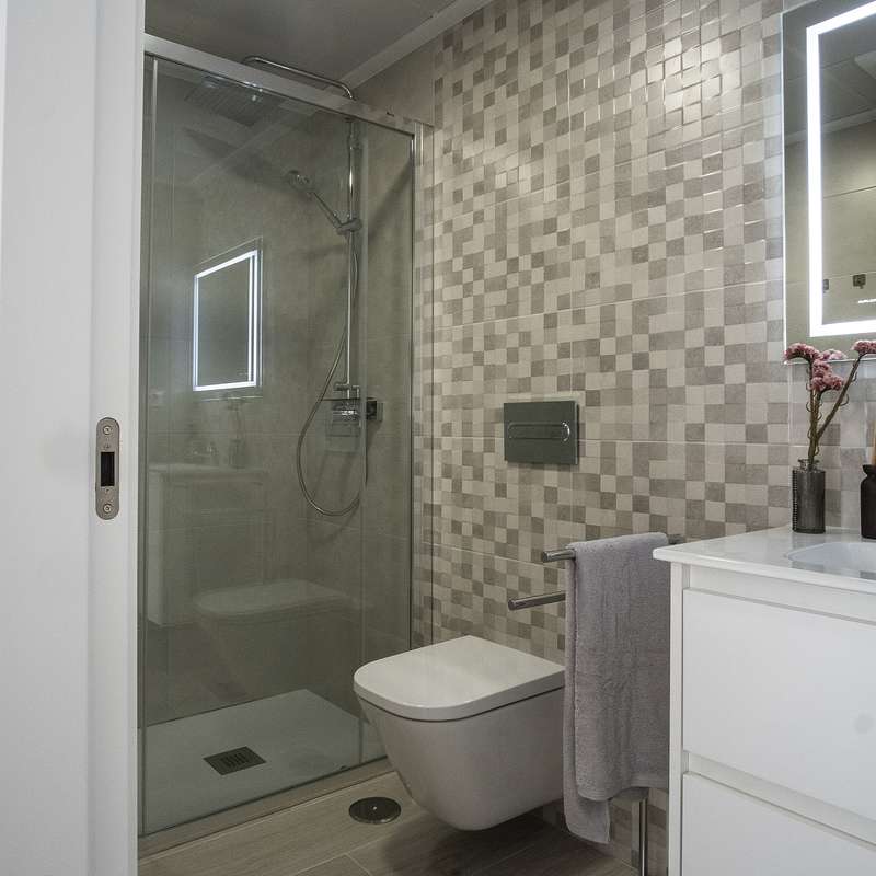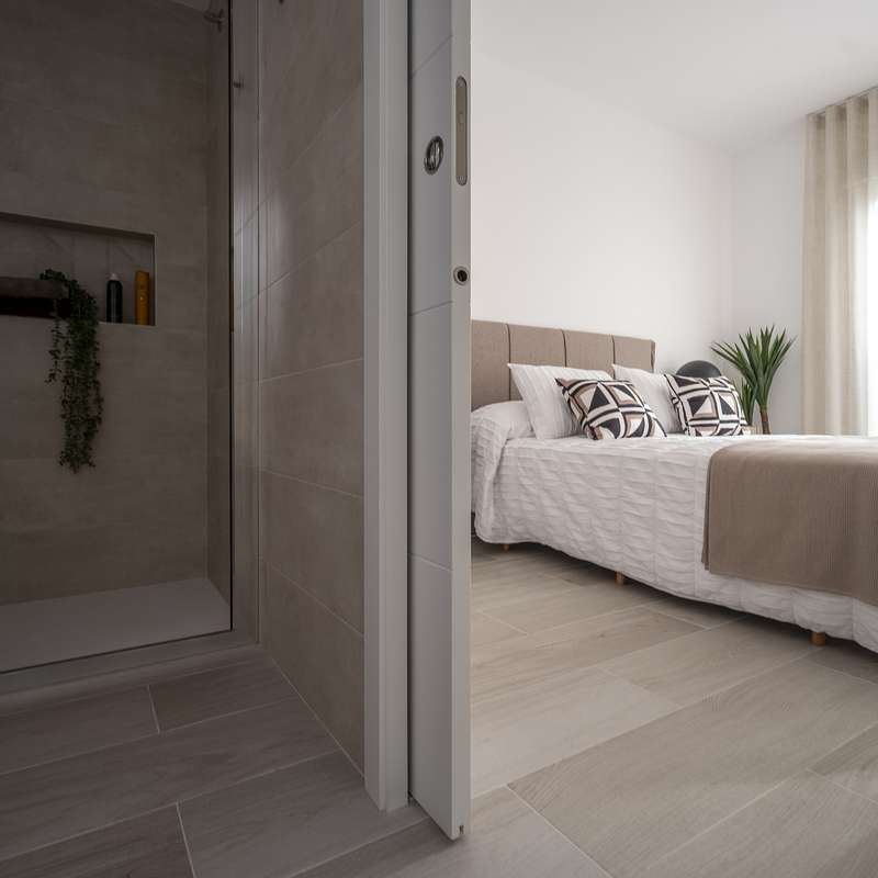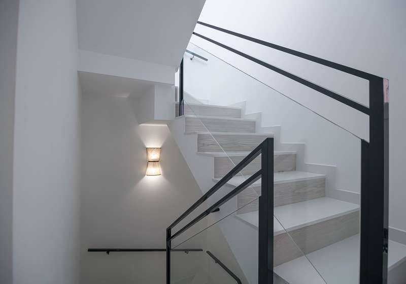 Inside, the contemporary townhouses boast luxurious details, including anti-slip porcelain stoneware tiles, glossy lacquered cabinets, blue-motion drawers, and exquisite quartz and Silestone countertops. LED spotlights adorn the kitchen, living room, hallway, and bathrooms, creating a warm and inviting ambiance. Furthermore, wall-integrated LED spotlights accentuate the beauty of the garden and solarium.