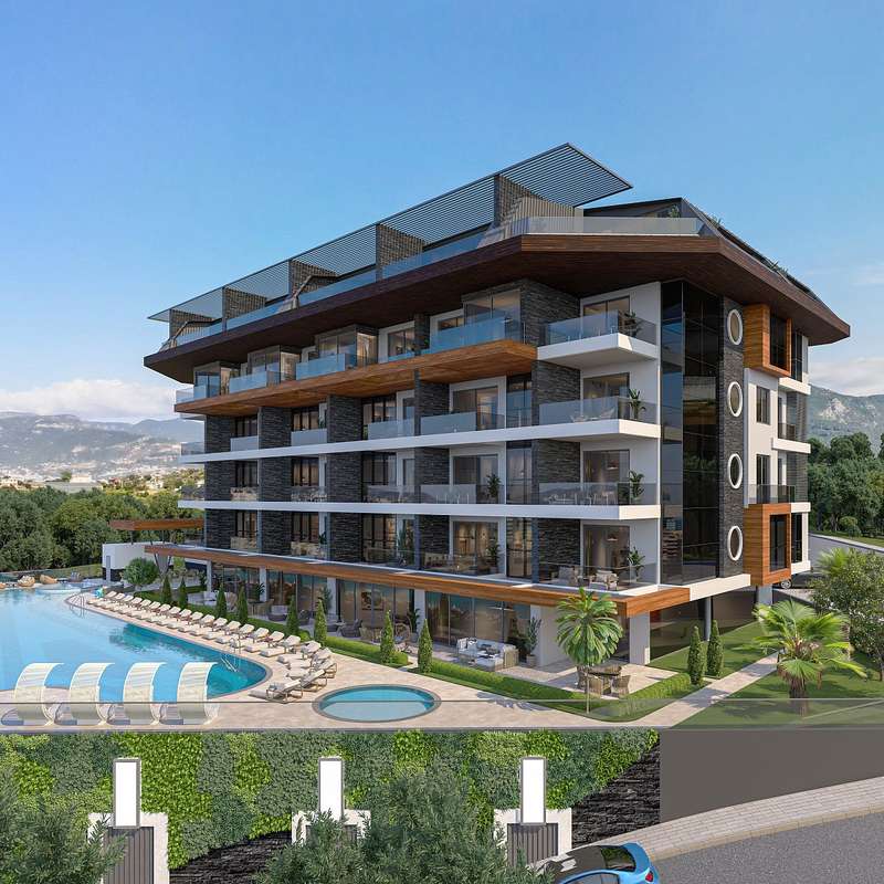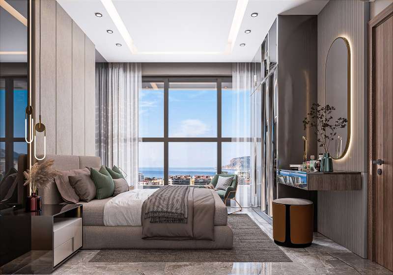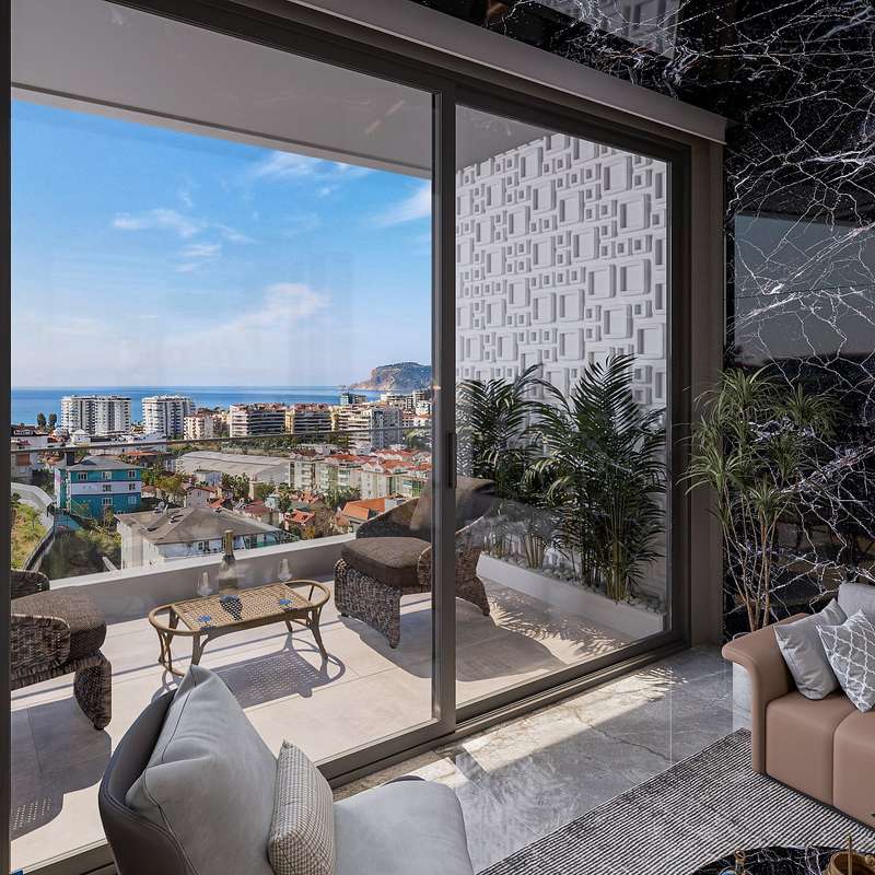 The apartments for sale in Alanya, Antalya, are located just 600 m from the sea, pharmacy, market, ATM, and school, 2.38 km from Alanya Research Hospital, 3 km from Alanyum Shopping Center, and 32 km from Gazipasa Airport.