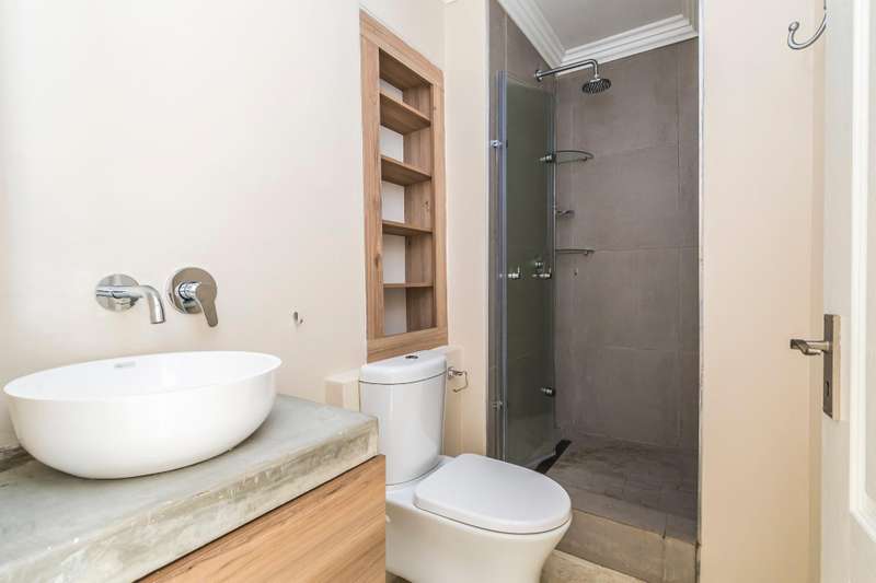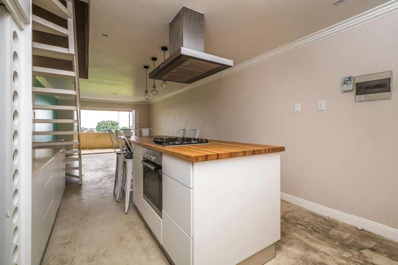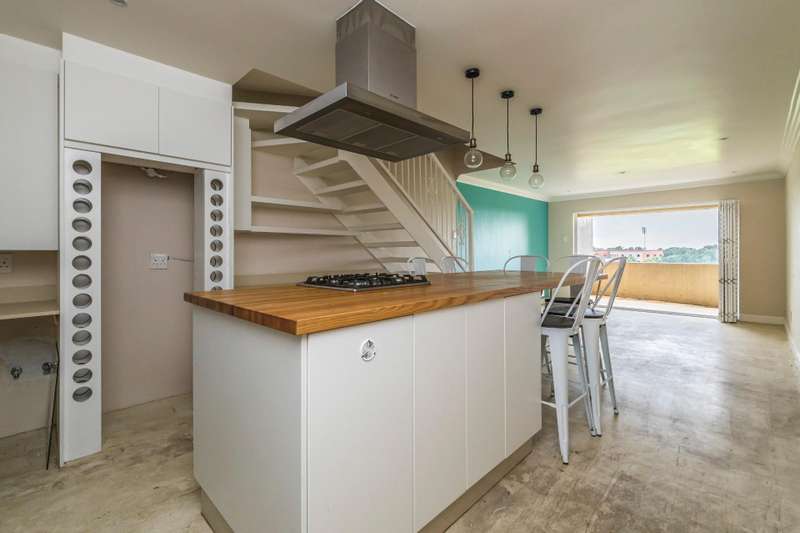 Tastefully renovated kitchen area with breakfast/dining area all set around a huge wooden counter top with gas hob. Living area through aluminum sliders to open balcony.