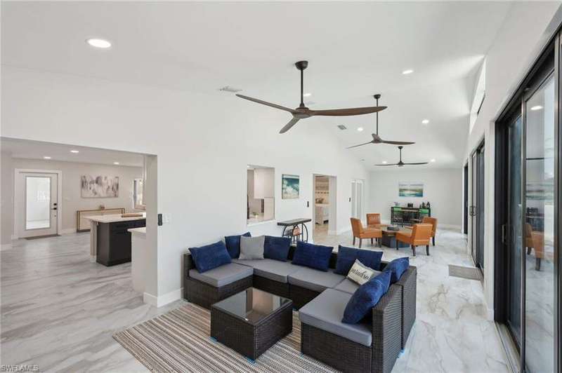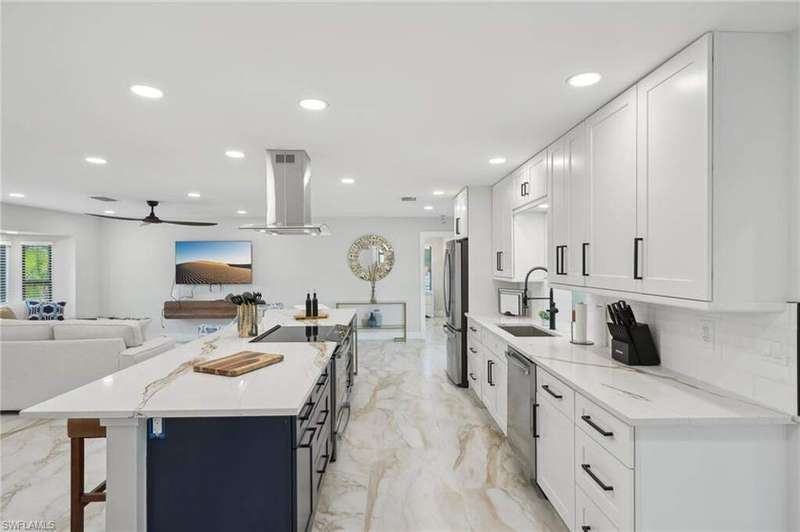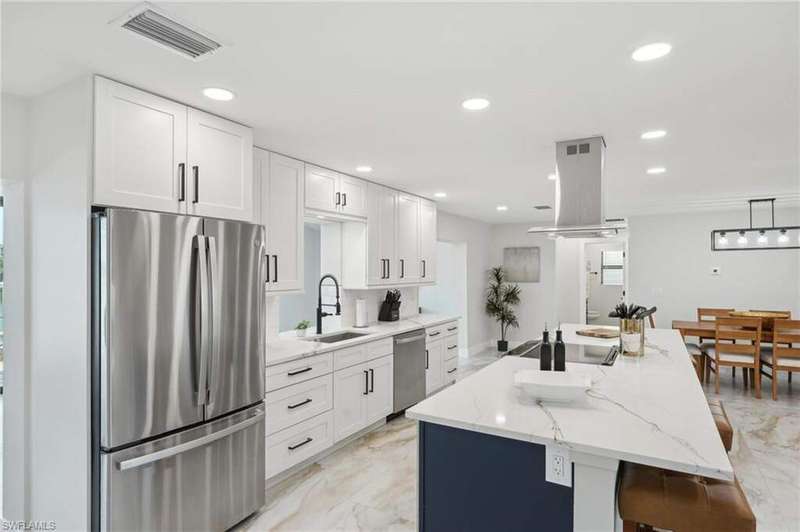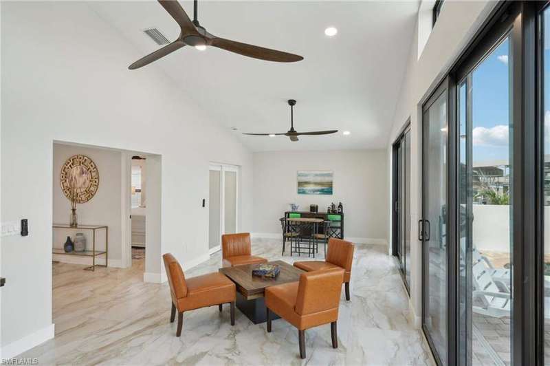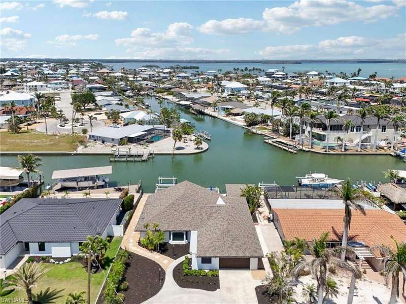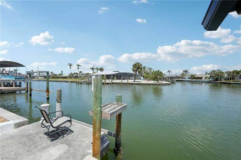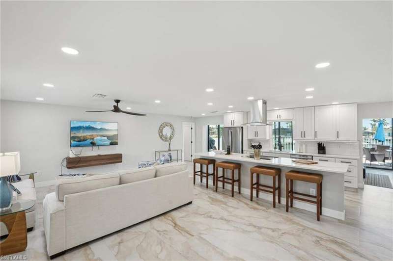 PRICE SLASHED OVER $300K,SELLER MOTIVATED! Sleek modern elegance best describes this turnkey furnished 3/2/2 waterfront pool home in the Laguna Shores community on Ft Myers Beach only steps to the white sand of Ft Myers Beach. The entire home has been remodeled from top to bottom with designer touches throughout. As you enter the home you will notice the wide-open floor plan with gorgeous tile, a large kitchen featuring two toned cabinetry, stainless appliances, stunning quartz counters and an oversized Island with a built-in wine refrigerator. The ample sized primary bedroom with custom tiled en-suite bathroom also has a walk-in closet with a custom closet system. The huge bonus family room in the rear of the home has so much to offer. With soaring ceilings and sliders encompassing nearly the entire back of the home, it not only brings in the natural light but also provides a great space for entertaining. Step outside and relax by your private pool and spa and enjoy the wide water intersecting canal views. In addition to your own private dock and lift just minutes to open water, there is also a GRANDFATHERED covered keyhole dock perfect for an additional small vessel or water toys. This home is a must see for the pickiest buyer!
