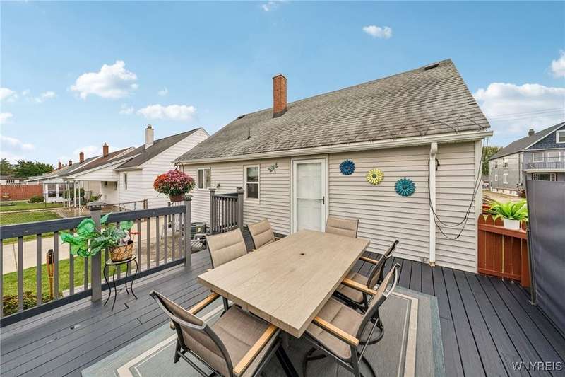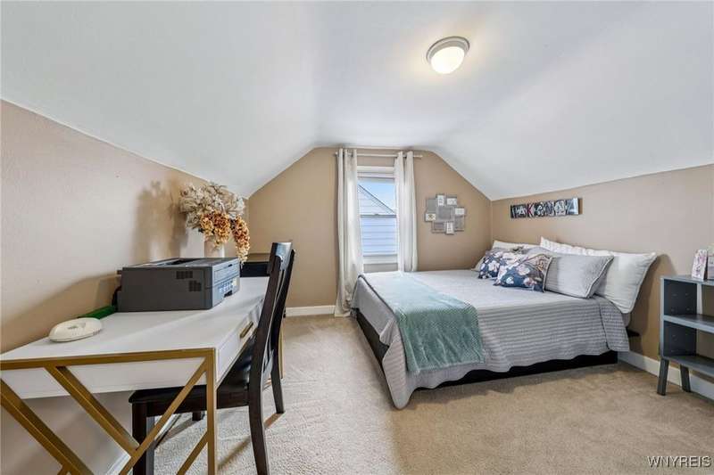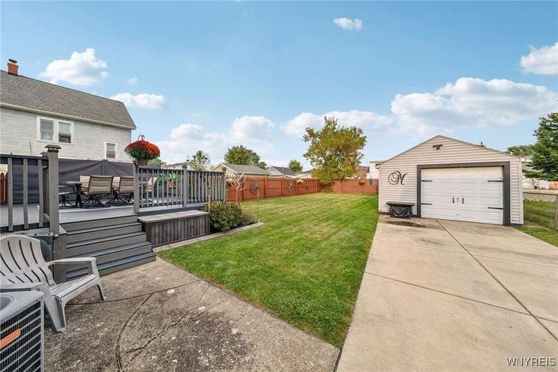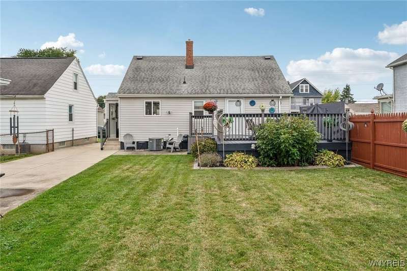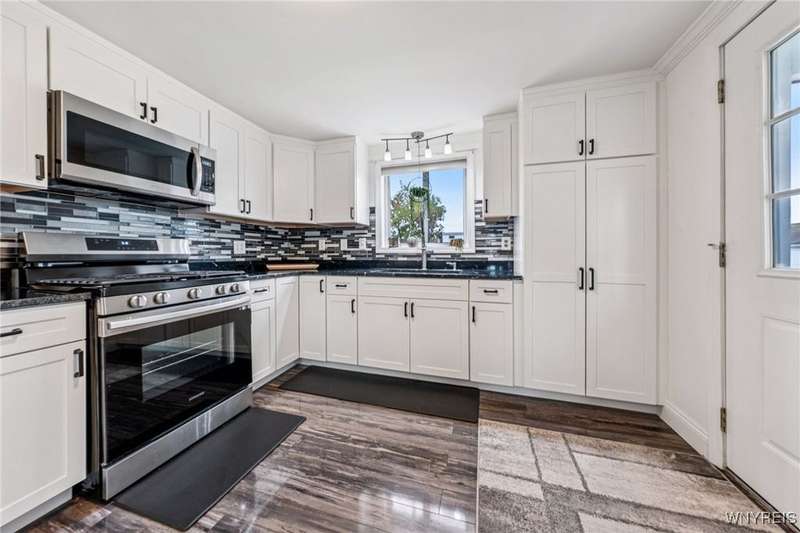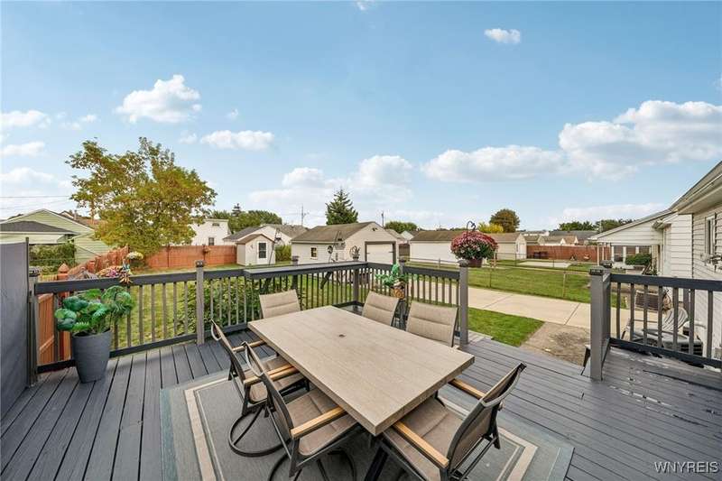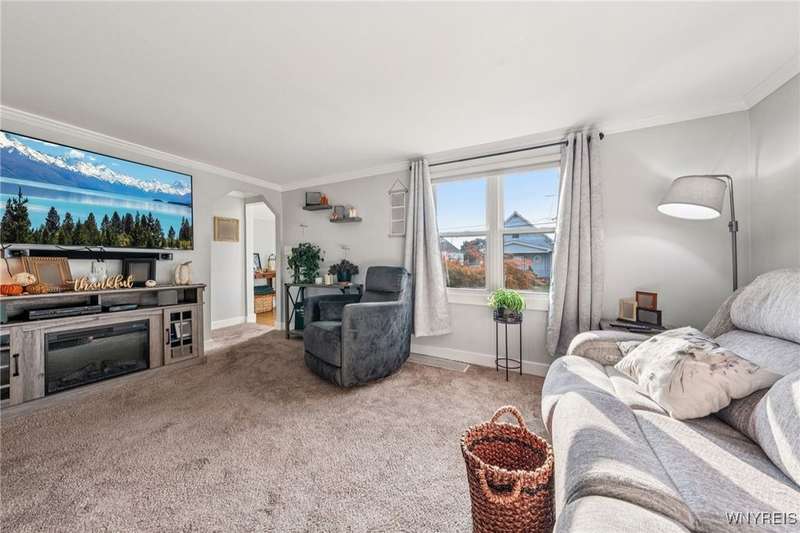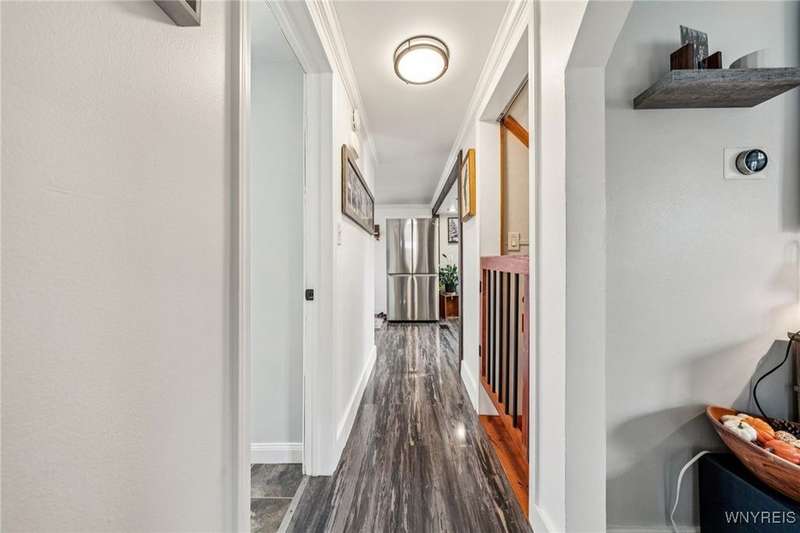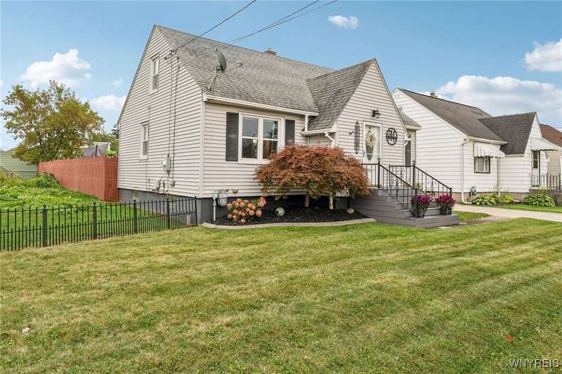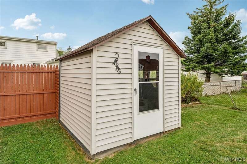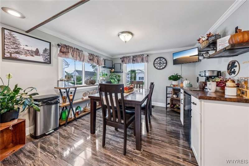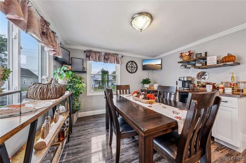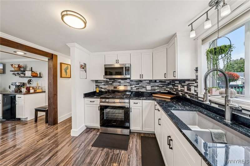 Move-in ready 3 bedroom, 1 bath home with many updates! Step inside to a bright and inviting foyer that opens to the living room with large front windows, neutral walls, and cozy carpet. The kitchen, remodeled in 2023, offers white shaker cabinets with soft-close drawers, granite countertops, sleek black hardware, and a striking glass tile backsplash. A side door leads to the mudroom for added convenience. The dining area, surrounded by windows, is filled with natural light and features a built-in coffee bar, flowing seamlessly from the kitchen. The first floor also includes a versatile bedroom and a full bath, while upstairs you'll find two large bedrooms. The partially finished basement features durable epoxy flooring, glass block windows, and plenty of storage in a clean, dry space. Beautiful details throughout include crown molding, trim, and wood finishes. Outside, enjoy curb appeal enhanced by beautiful landscaping, a freshly stained deck, shed, and a fully fenced yard with gate. All you have to do is unpack. This lovely home is truly move in ready.