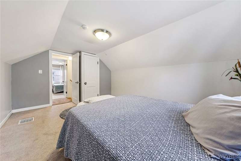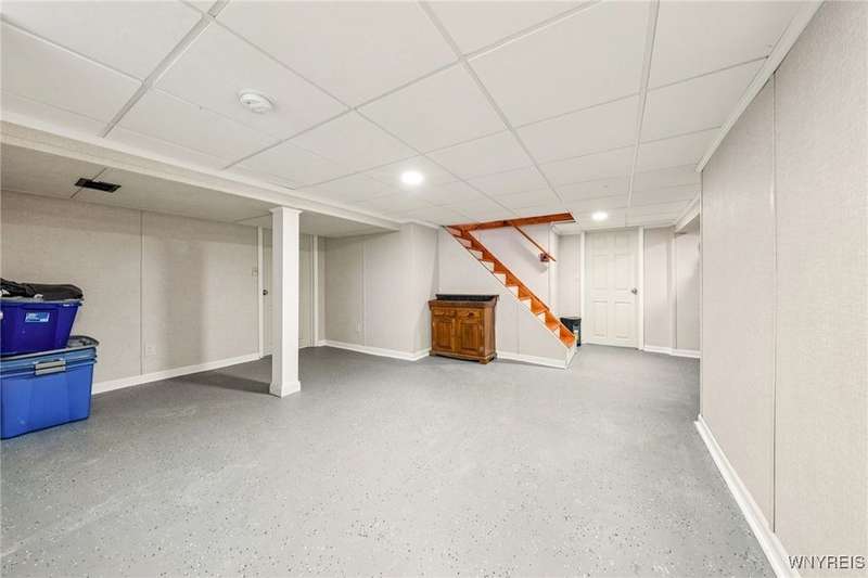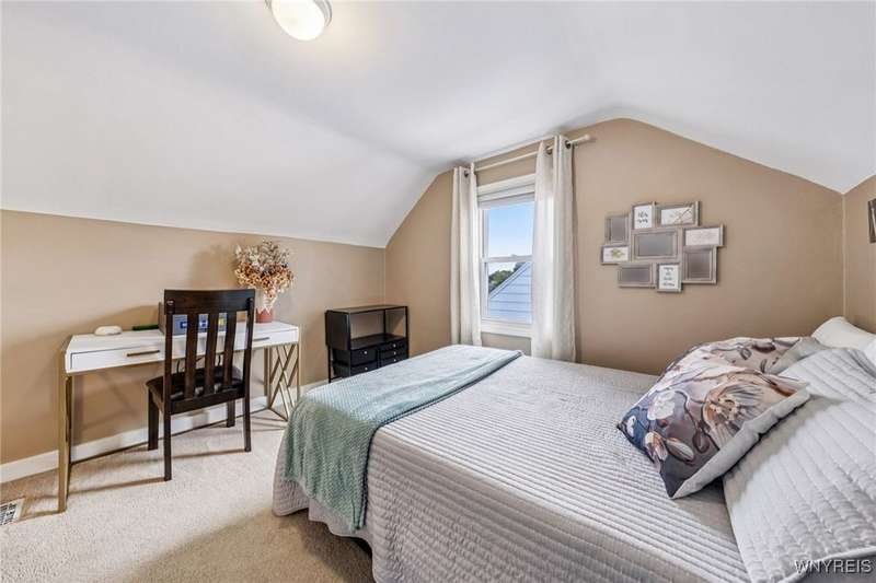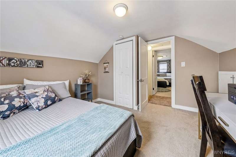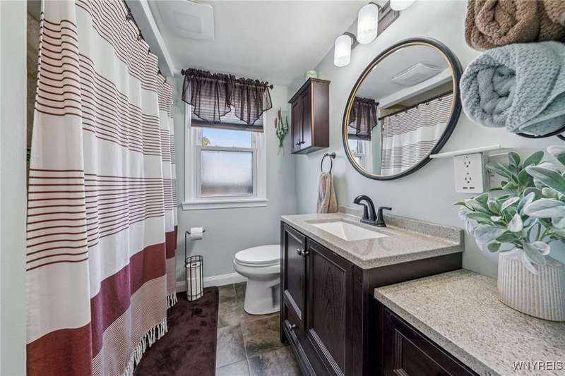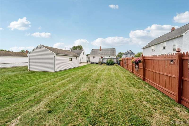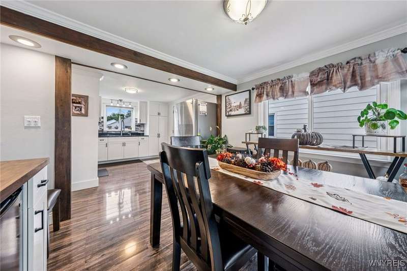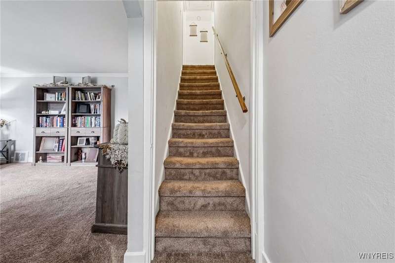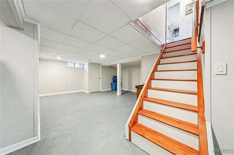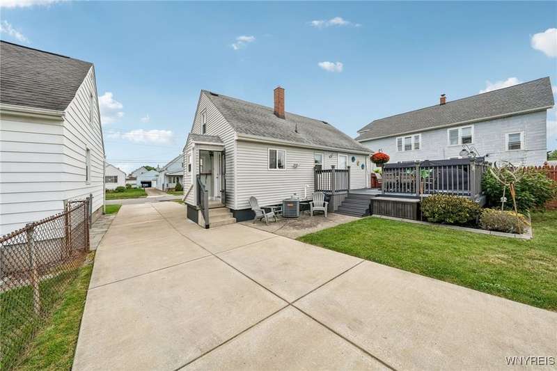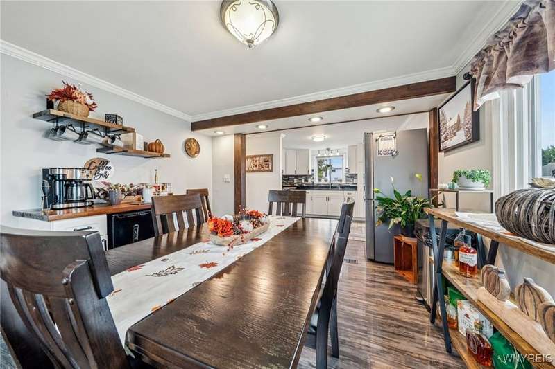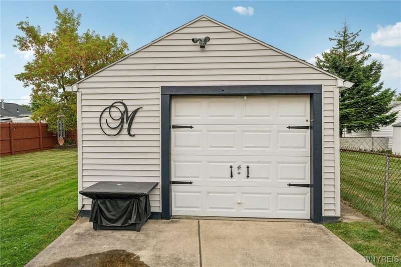 Move-in ready 3 bedroom, 1 bath home with many updates! Step inside to a bright and inviting foyer that opens to the living room with large front windows, neutral walls, and cozy carpet. The kitchen, remodeled in 2023, offers white shaker cabinets with soft-close drawers, granite countertops, sleek black hardware, and a striking glass tile backsplash. A side door leads to the mudroom for added convenience. The dining area, surrounded by windows, is filled with natural light and features a built-in coffee bar, flowing seamlessly from the kitchen. The first floor also includes a versatile bedroom and a full bath, while upstairs you'll find two large bedrooms. The partially finished basement features durable epoxy flooring, glass block windows, and plenty of storage in a clean, dry space. Beautiful details throughout include crown molding, trim, and wood finishes. Outside, enjoy curb appeal enhanced by beautiful landscaping, a freshly stained deck, shed, and a fully fenced yard with gate. All you have to do is unpack. This lovely home is truly move in ready.